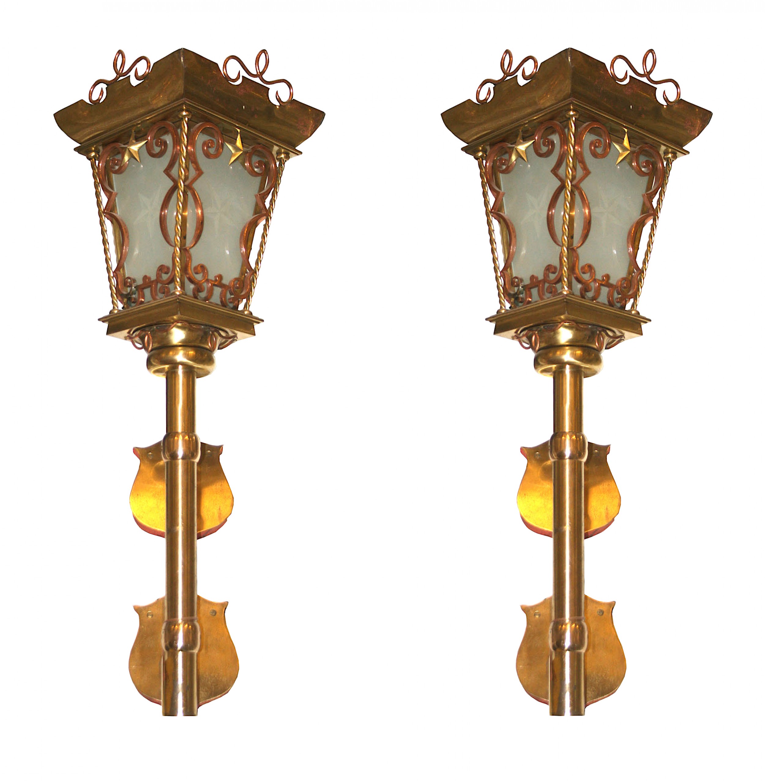 Pair of French Mid-Century Brass and Copper Coach Lamps