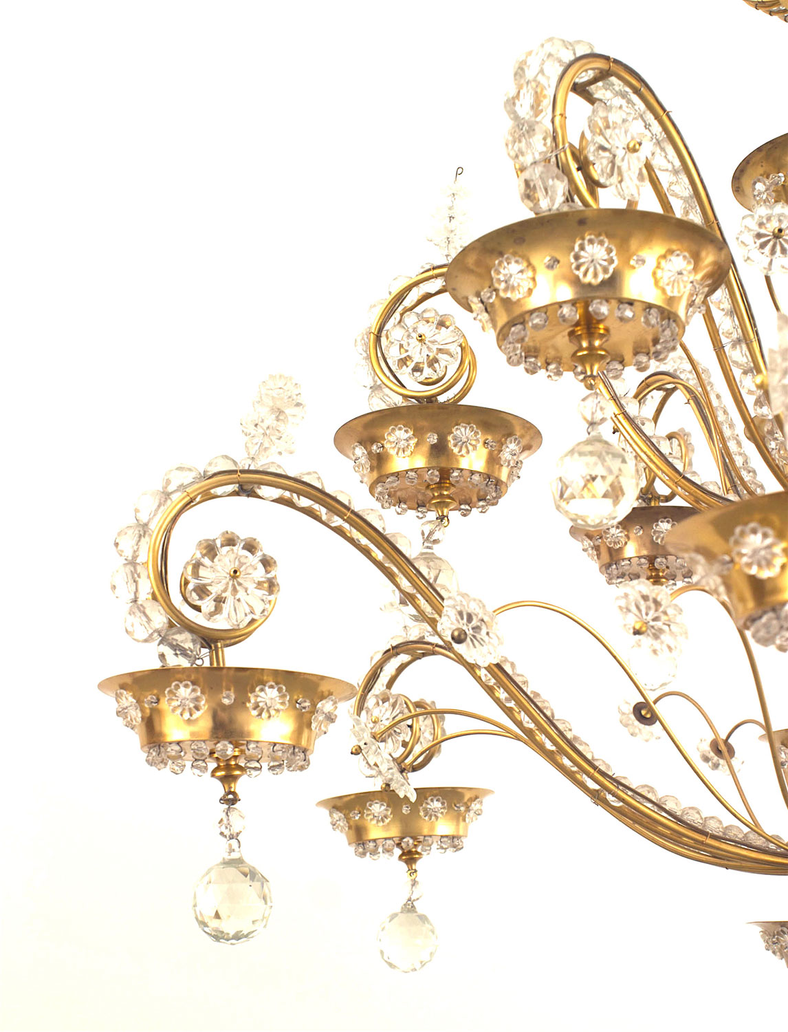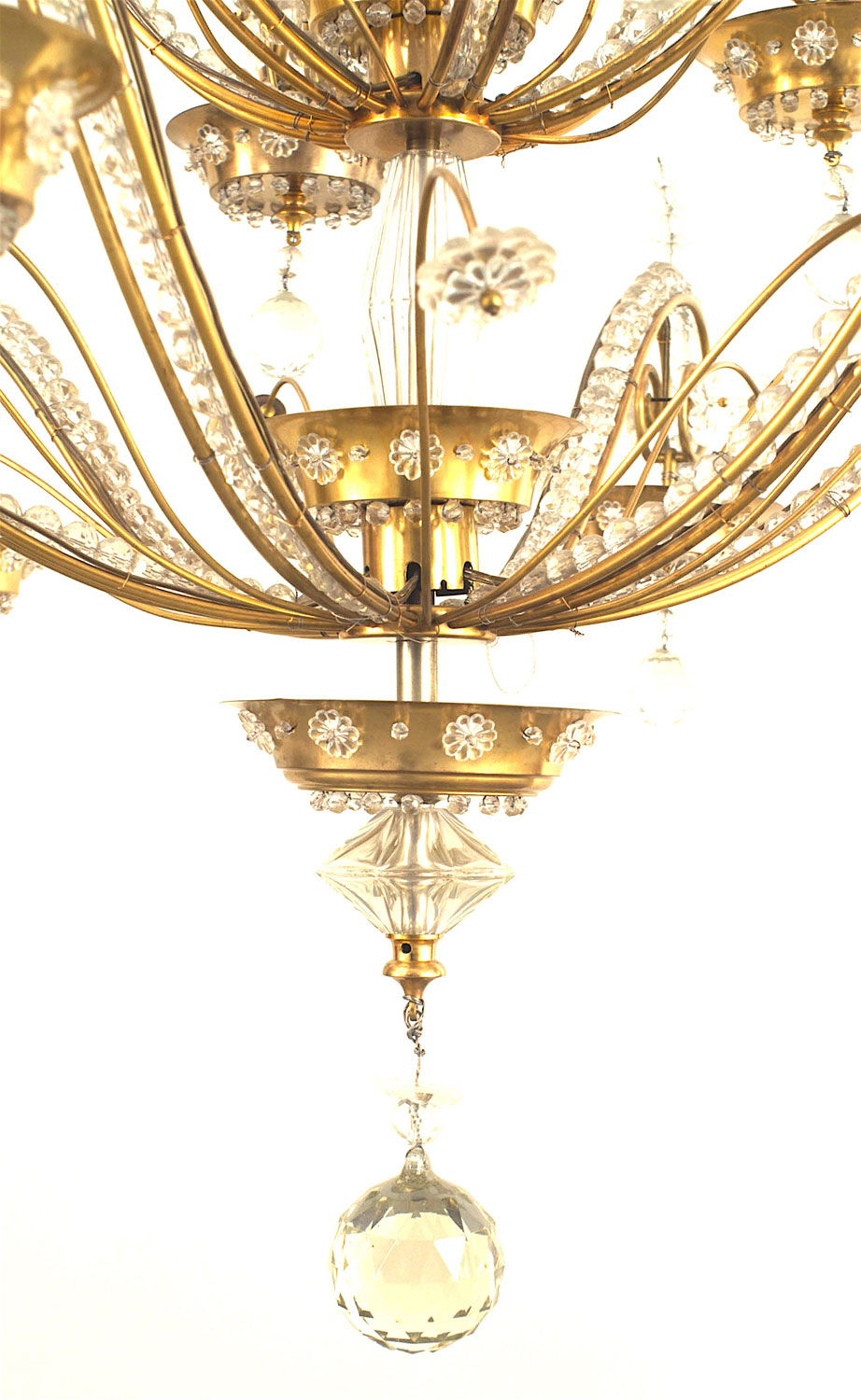 French Mid-Century (1940s) brass frame chandelier with 2 tiers of 6 arms having crystal a channel of crystal beads and rosettes on round bobeches with a crystal ball finial bottom. (BAGUES FOR JANSEN)