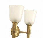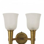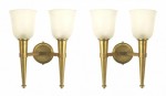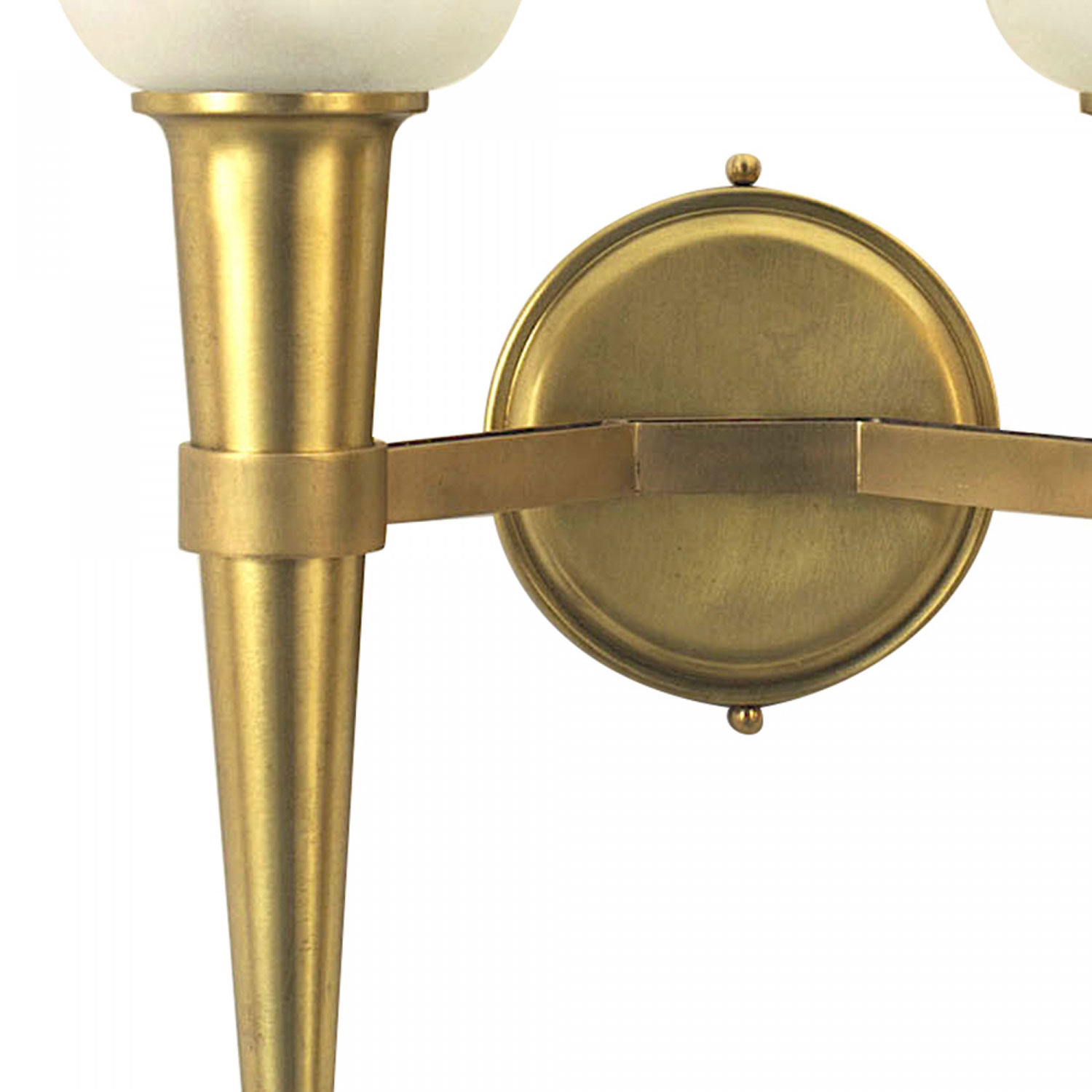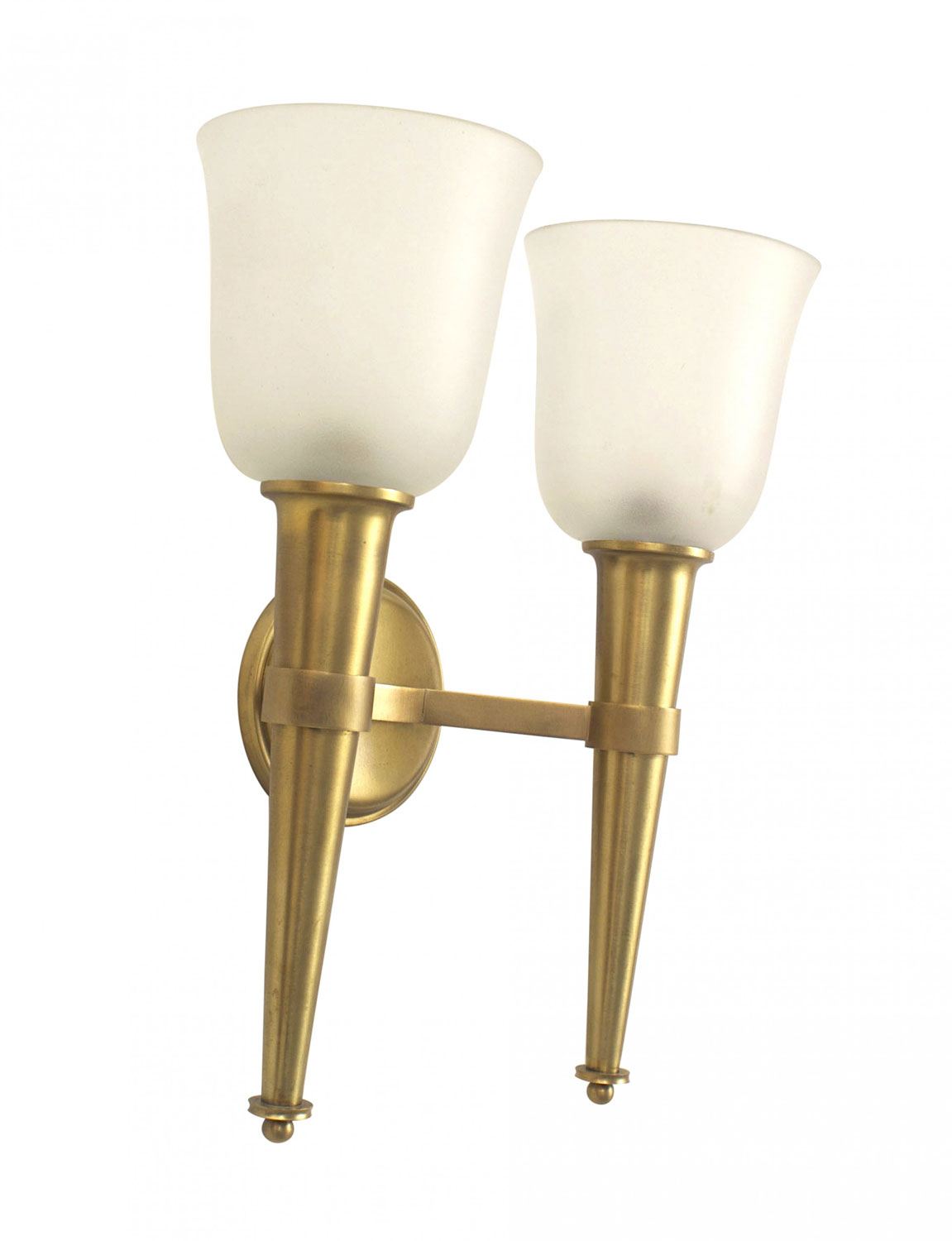 PAIR of French Mid-Century (1940s) brass wall sconces with two torch design arm supporting shaped frosted glass shades with a round back-plate (PRICED AS PAIR)