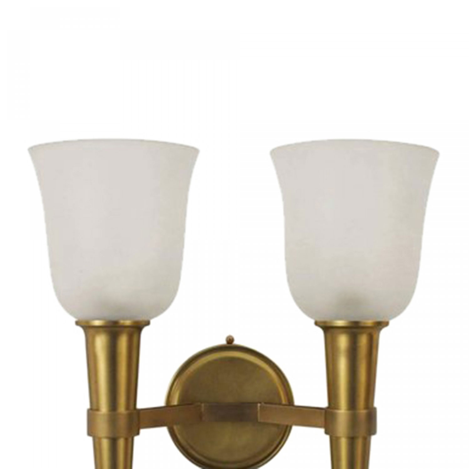 PAIR of French Mid-Century (1940s) brass wall sconces with two torch design arm supporting shaped frosted glass shades with a round back-plate (PRICED AS PAIR).