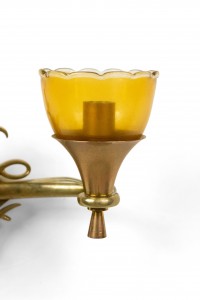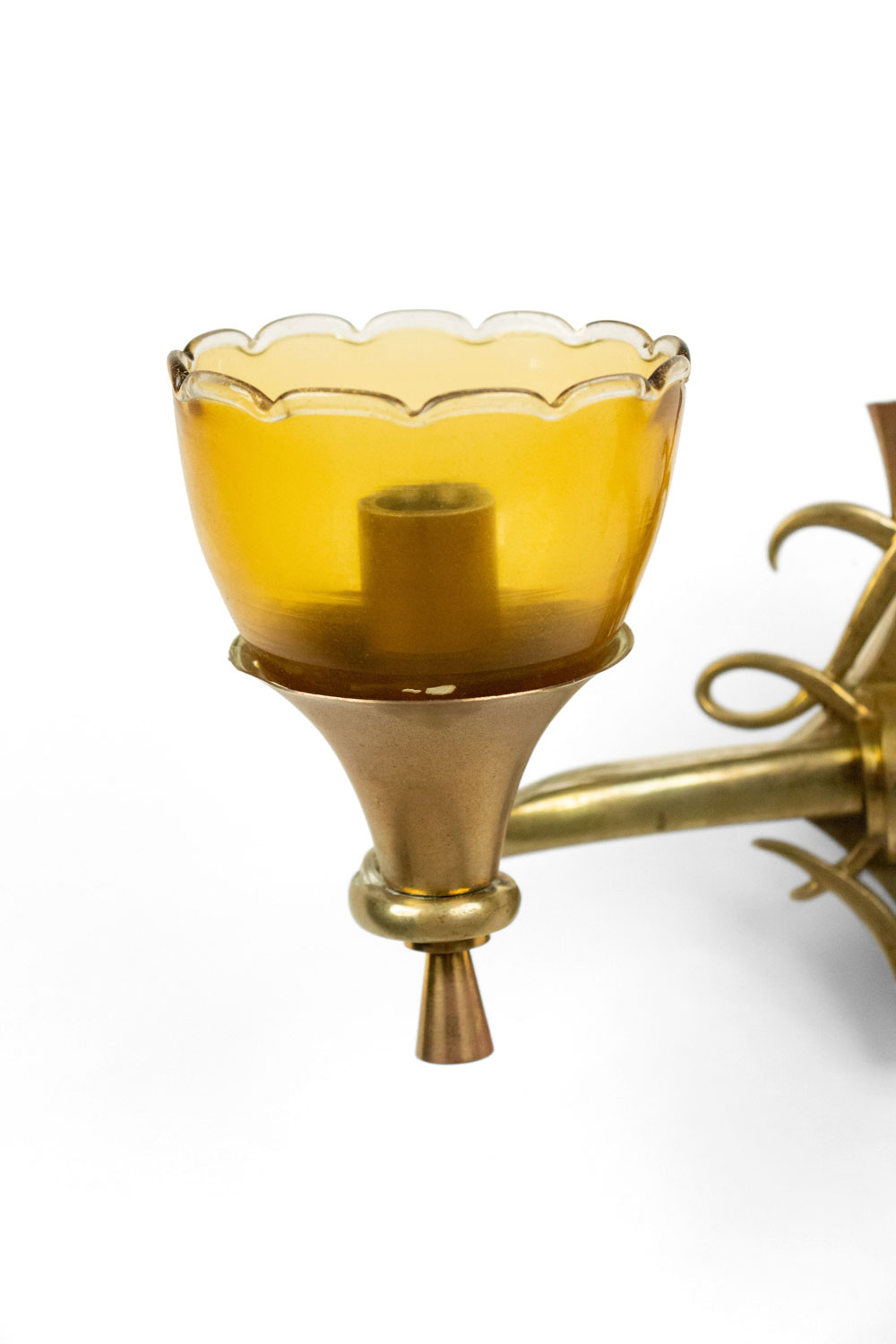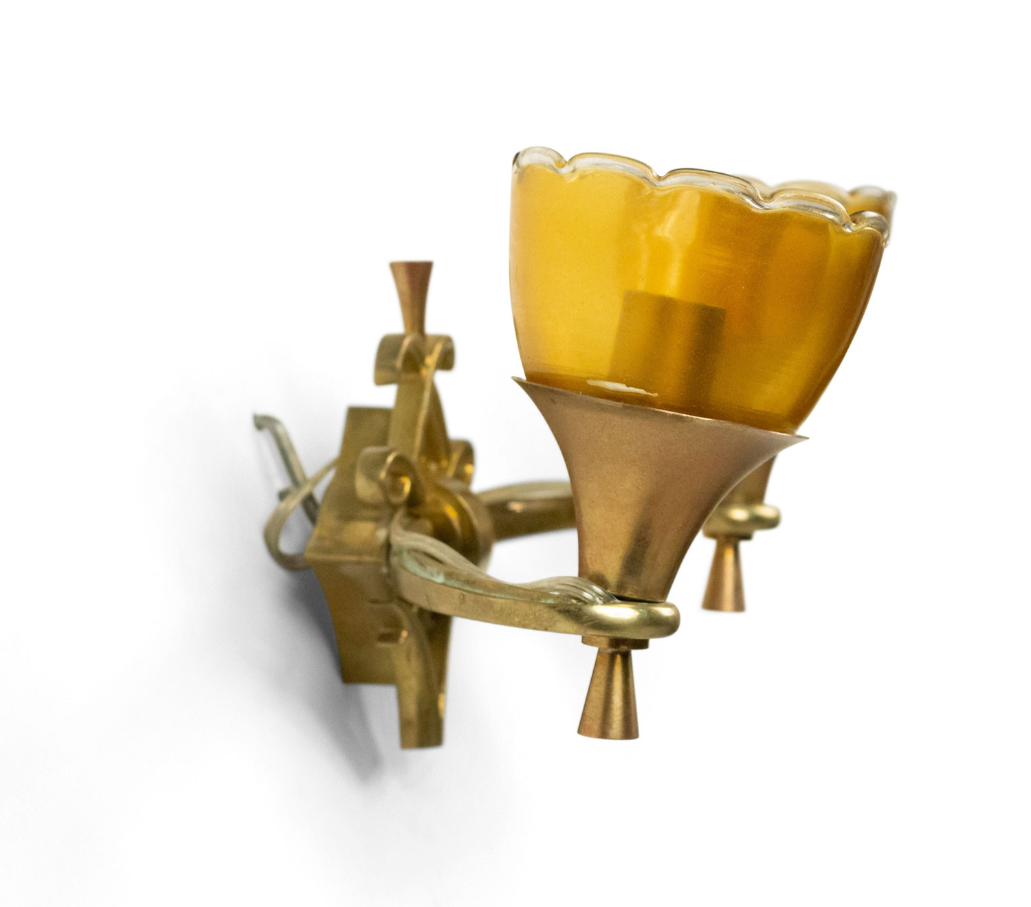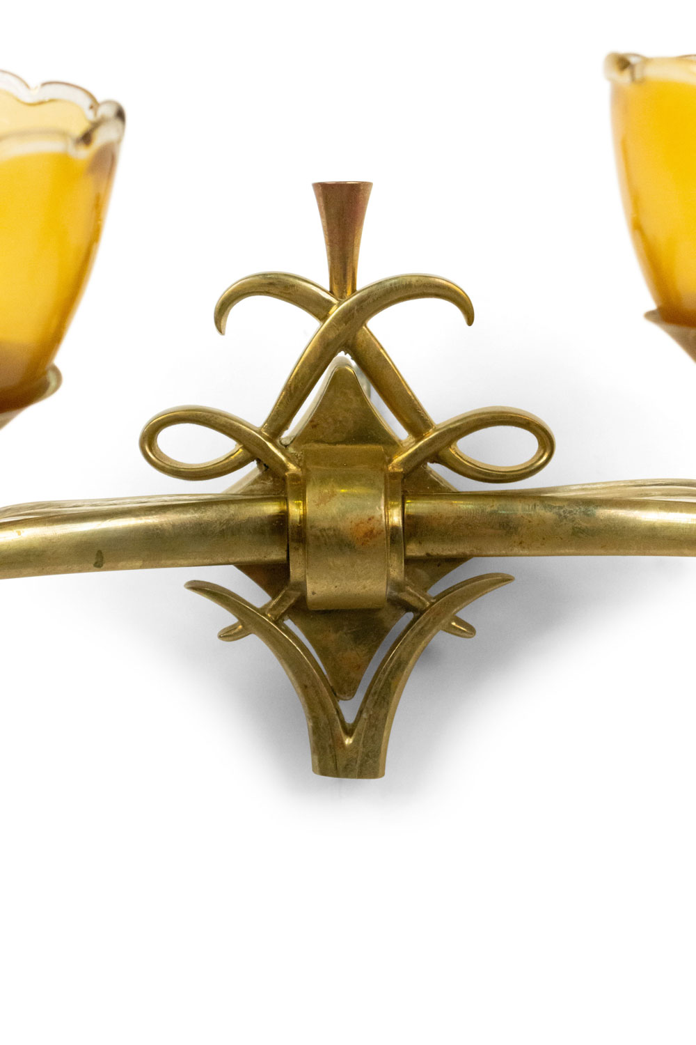 French Mid-Century (1940's) brass 2 arm wall sconces with diamond form & scrolling backplate and amber glass scalloped top shades..