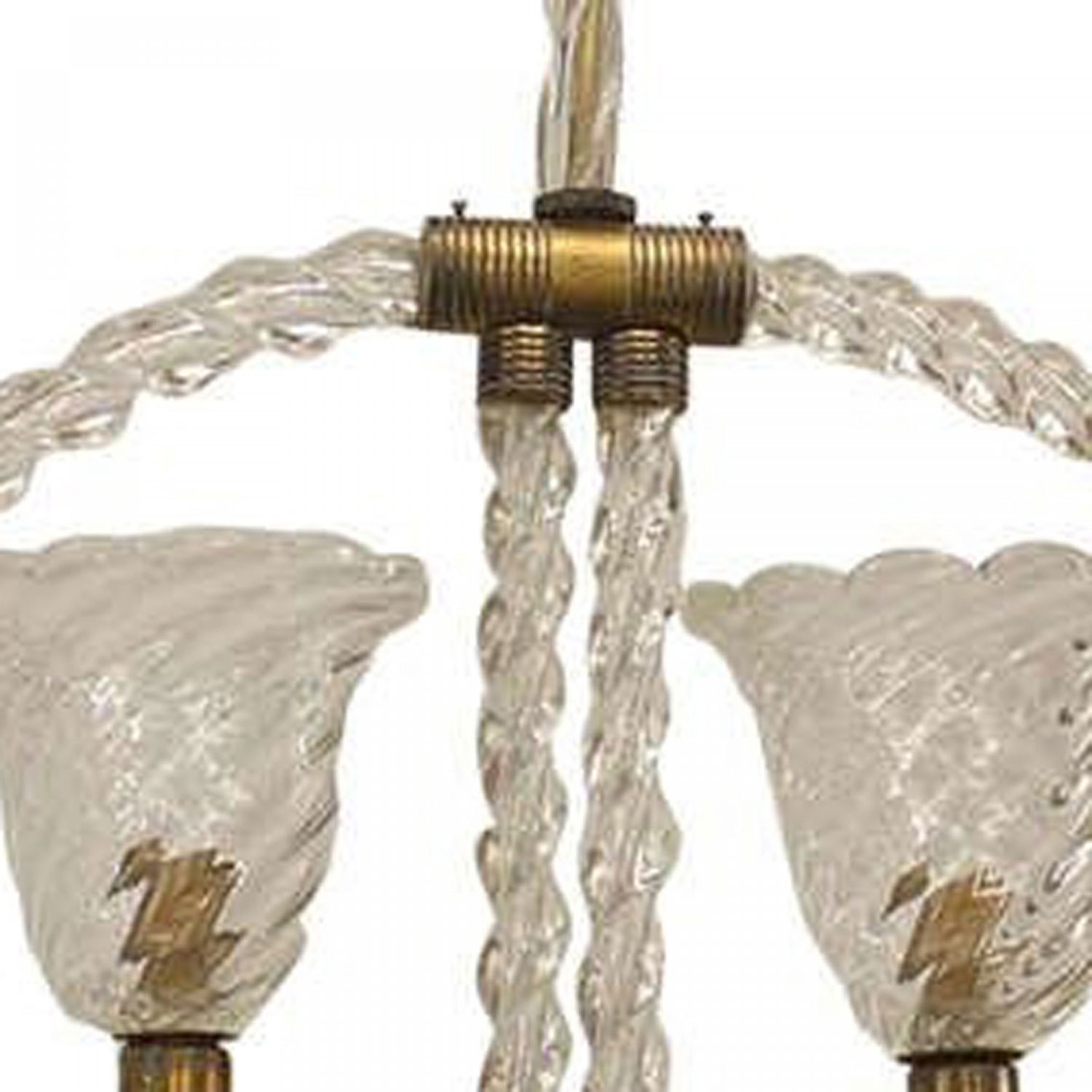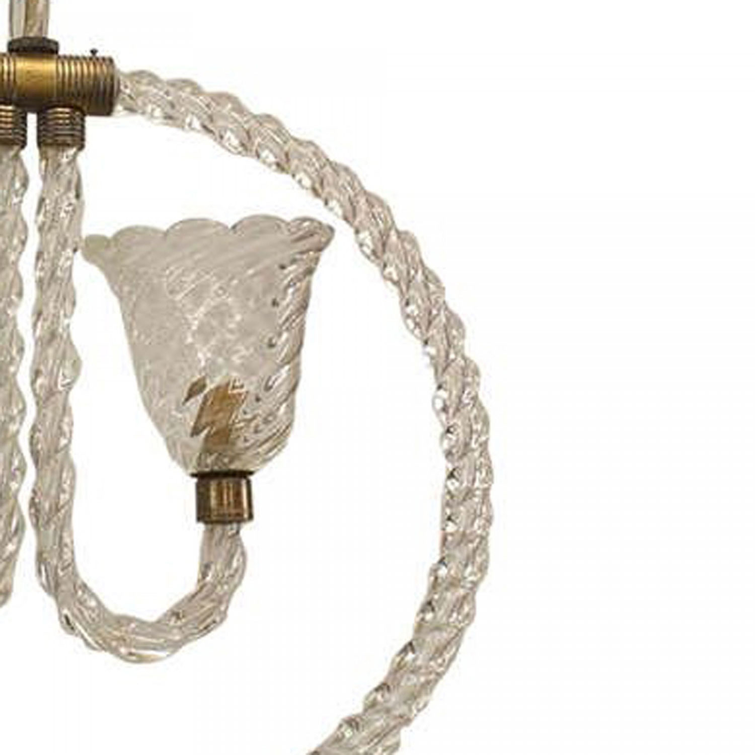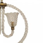 French (1940's) chandelier featuring a suspended hoop composed of clear glass and brass trim that features two curved arms supporting swirl-design glass shades (BAROVIER ET TOSO)