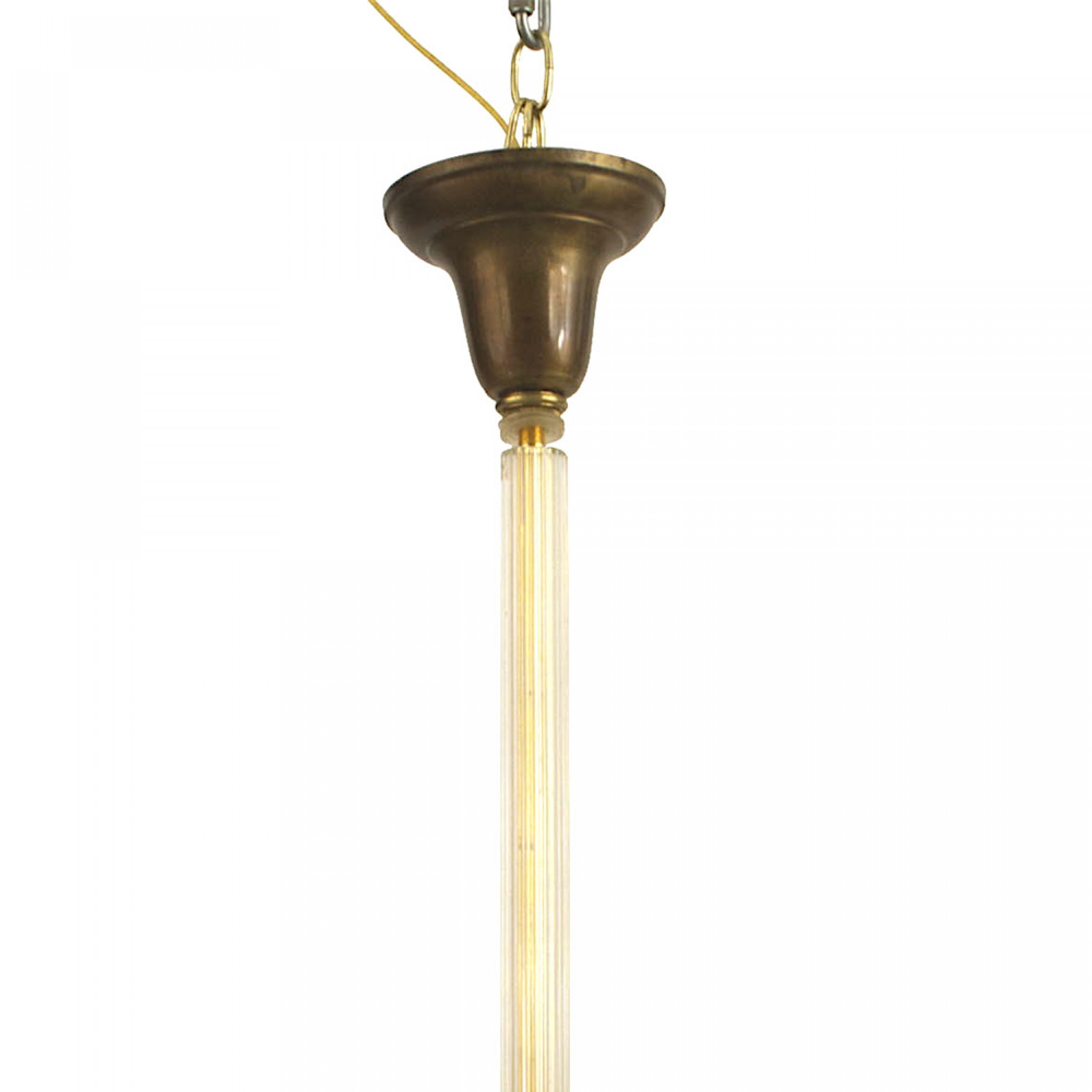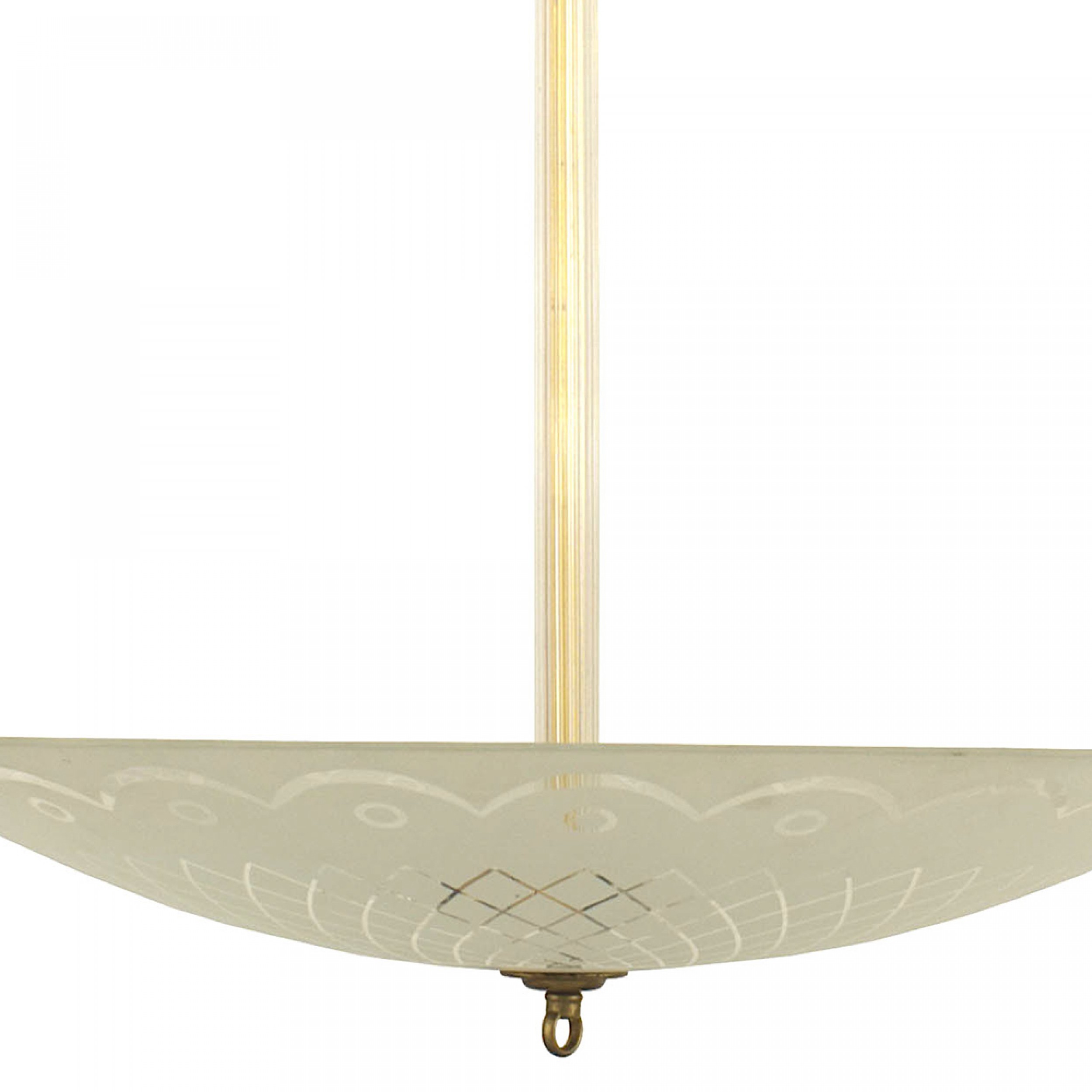 French Mid-Century (1940s) chandelier with a large round frosted glass bowl shade having a geometric woven & scalloped design edge supported by a fluted glass stem with a brass finial bottom.