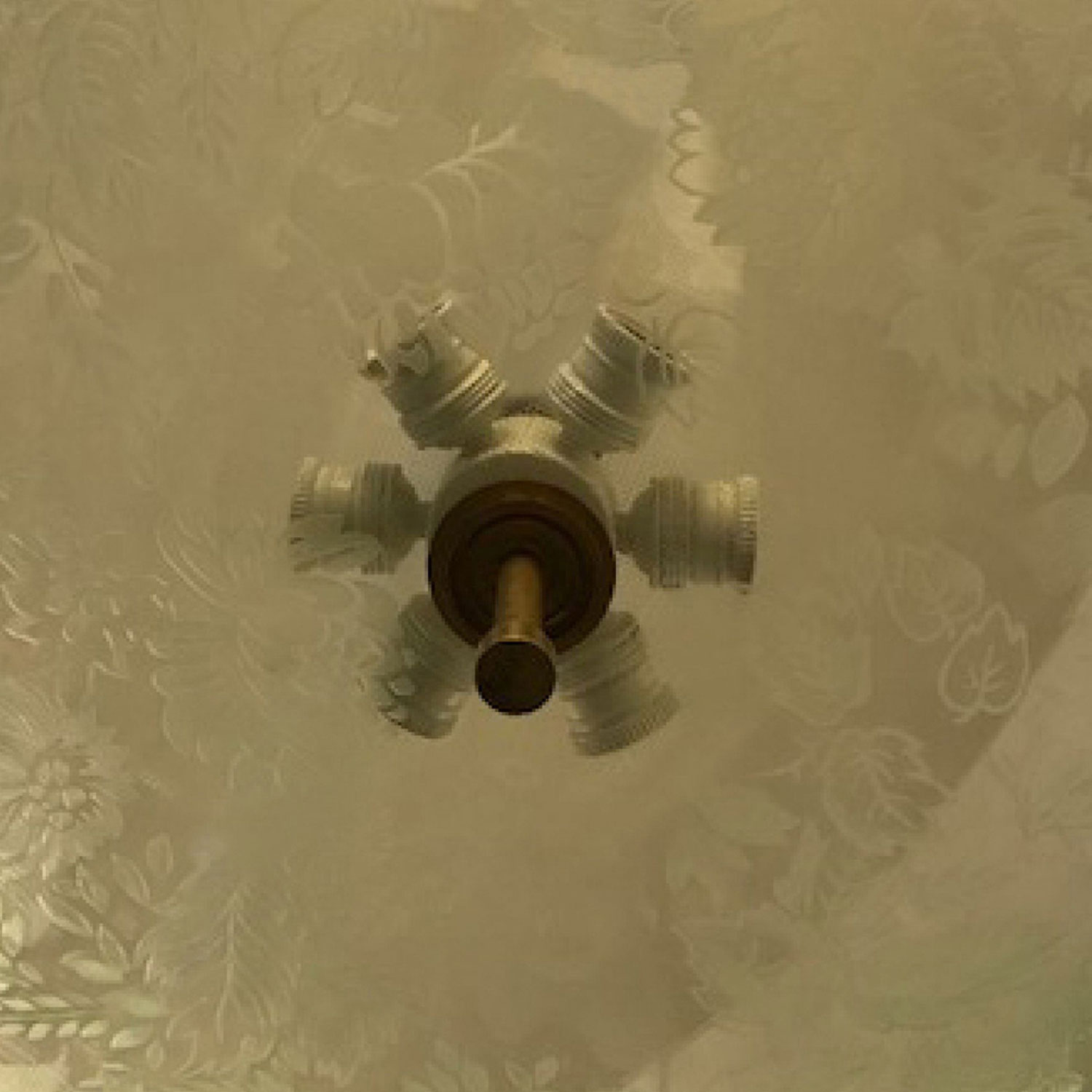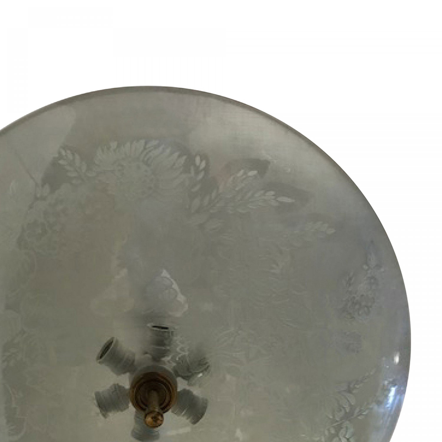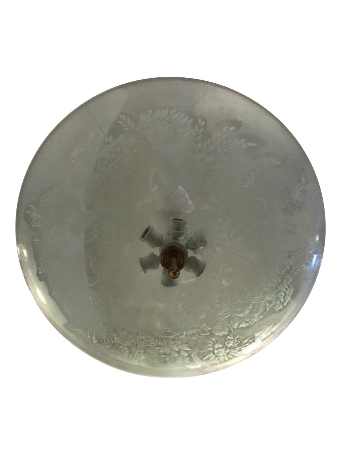 French Mid-Century (1940s) circular glass flush mounted chandelier with a frosted floral design and a brass centered finial bottom