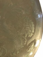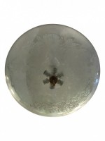 French Mid-Century (1940s) circular glass flush mounted chandelier with a frosted floral design and a brass centered finial bottom.