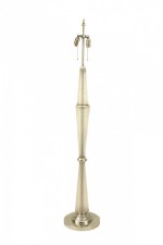 French 1940s frosted glass floor lamp with 3 shaped sections separated by chrome plated metal fittings and resting on a round tired base.