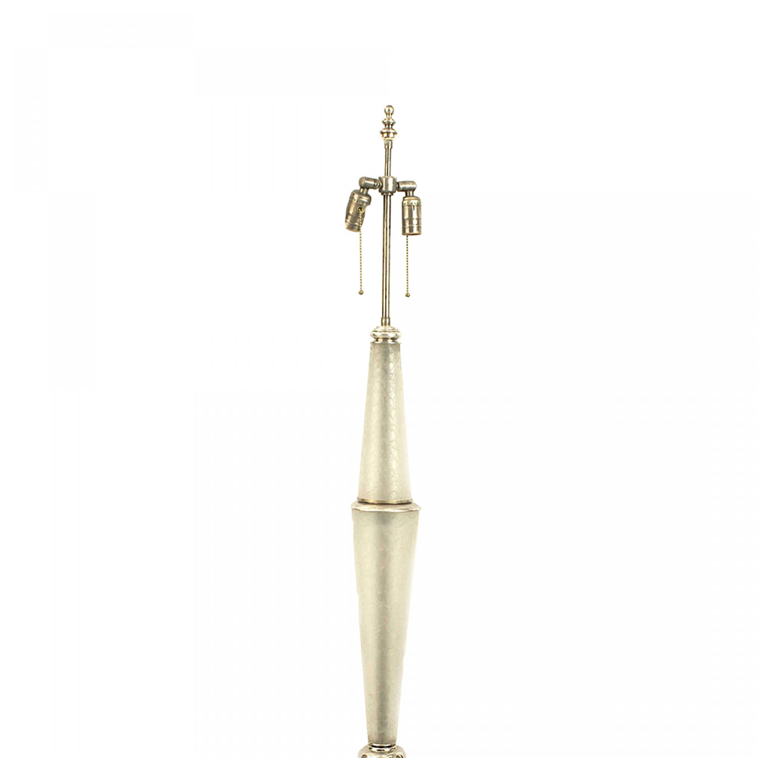 French 1940s frosted glass floor lamp with 3 shaped sections separated by chrome plated metal fittings and resting on a round tired base