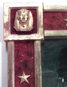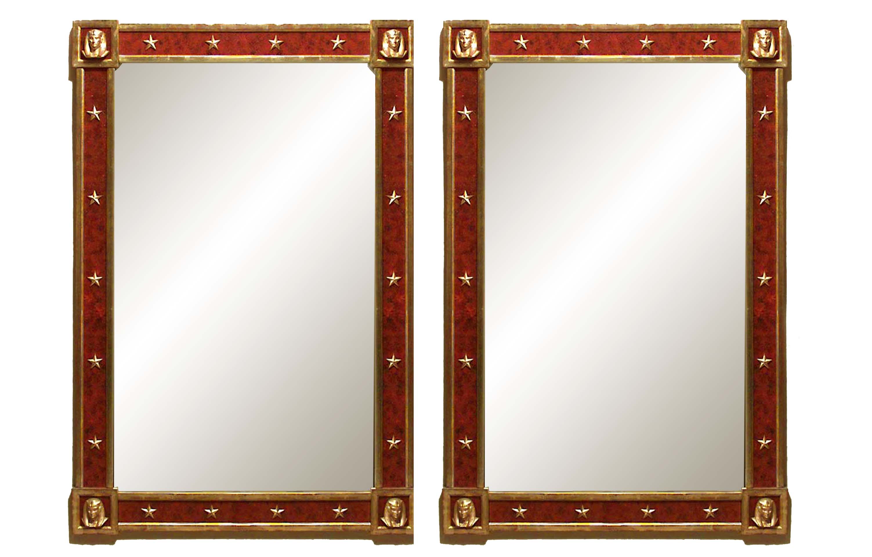 PAIR of French Mid-Century (1940s) parcel gilt and red reverse painted glass wall mirrors with stars and Egyptian masks set to the slip and corners. (PRICED AS PAIR)