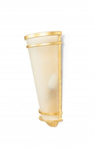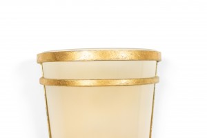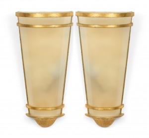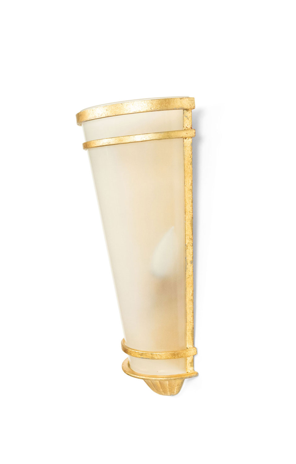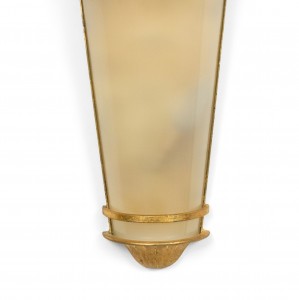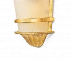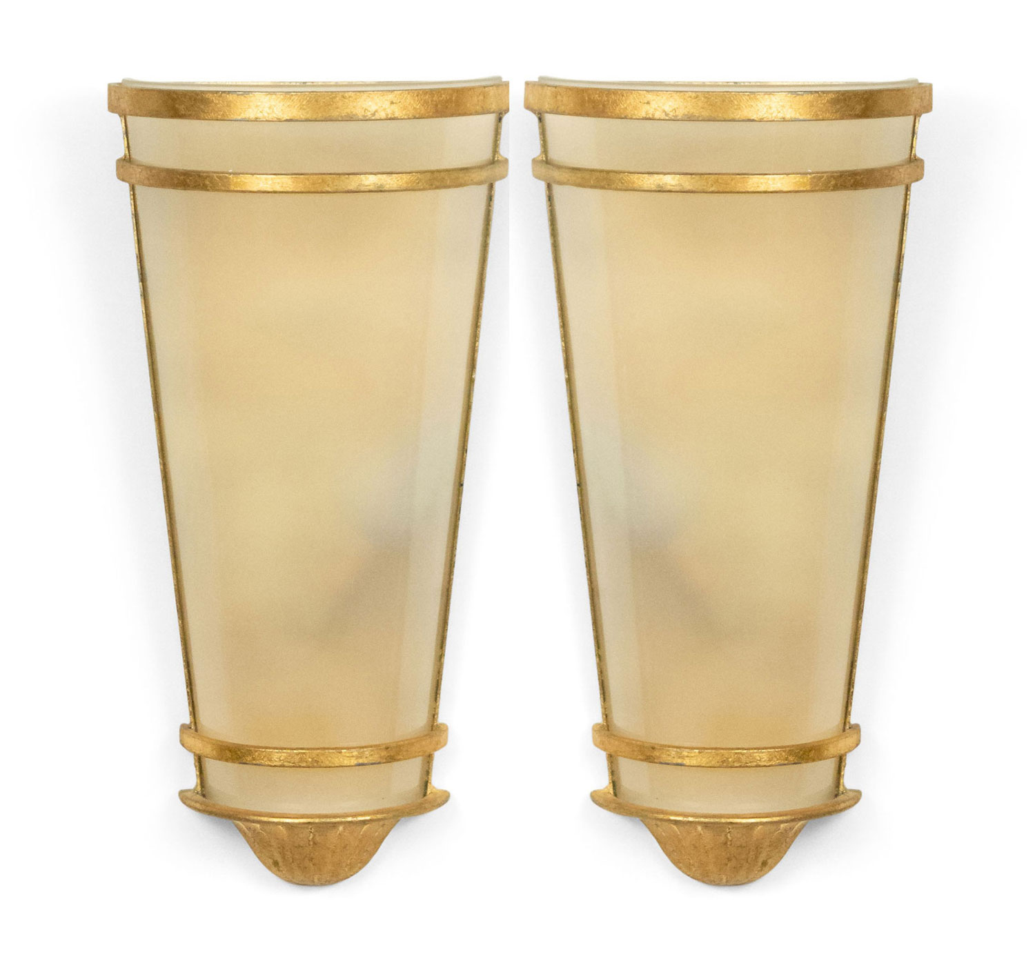 8 French Mid-Century-Style gilt metal wall sconces with tapered cylindrical shaped frosted shade. (PRICED EACH) (NOTE: 1 pair has a pink frosted shade)