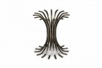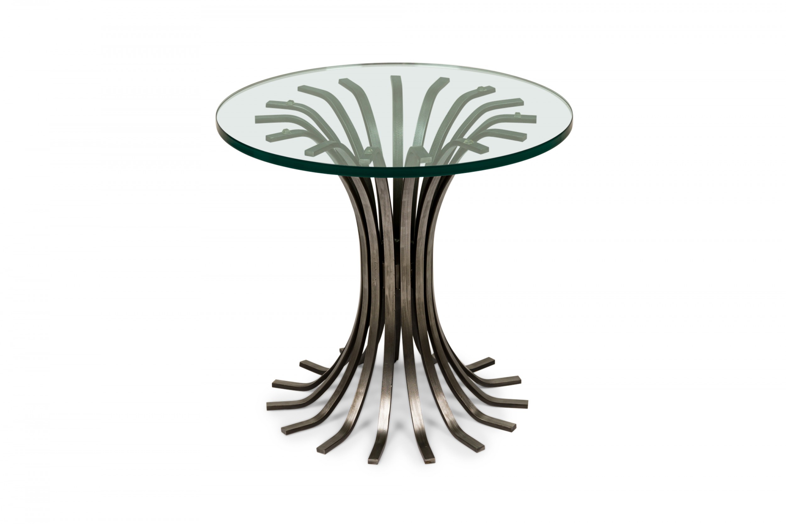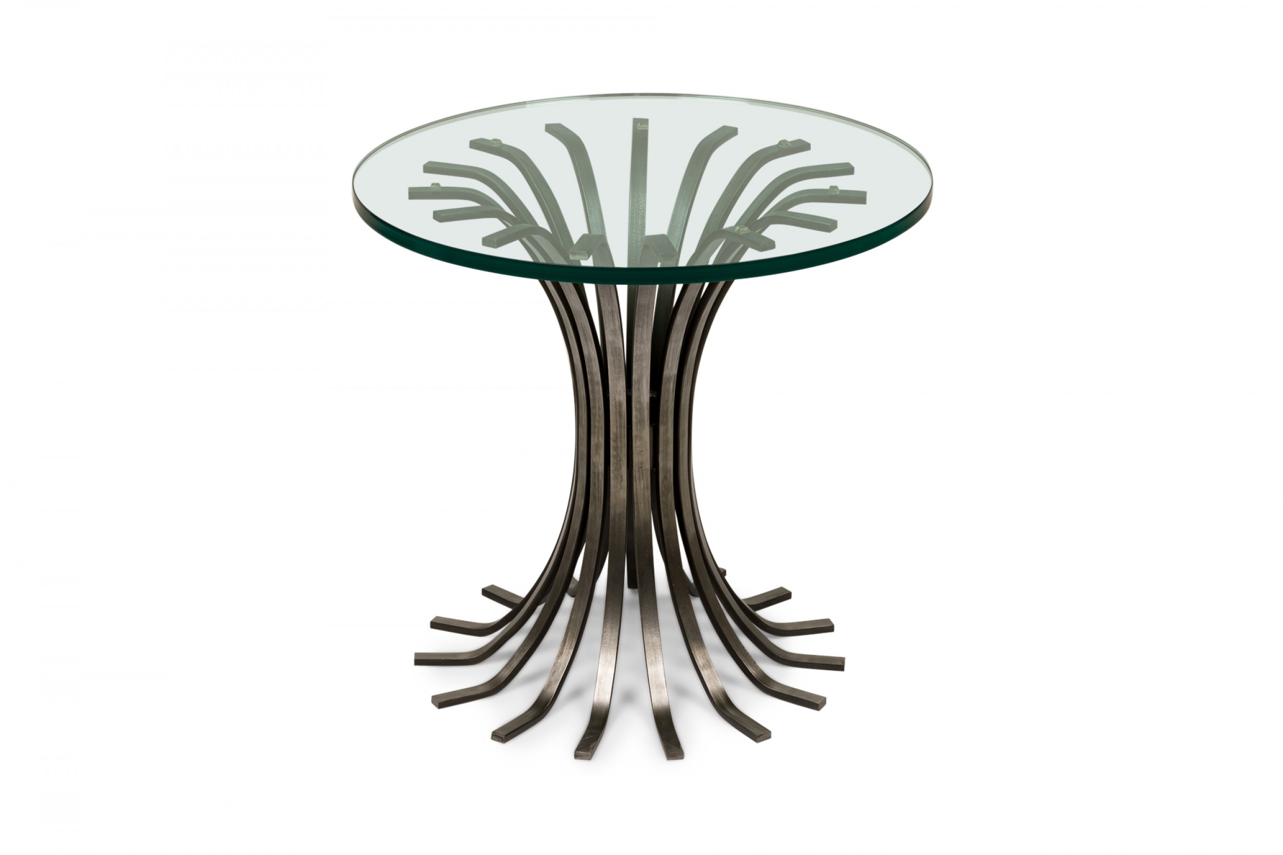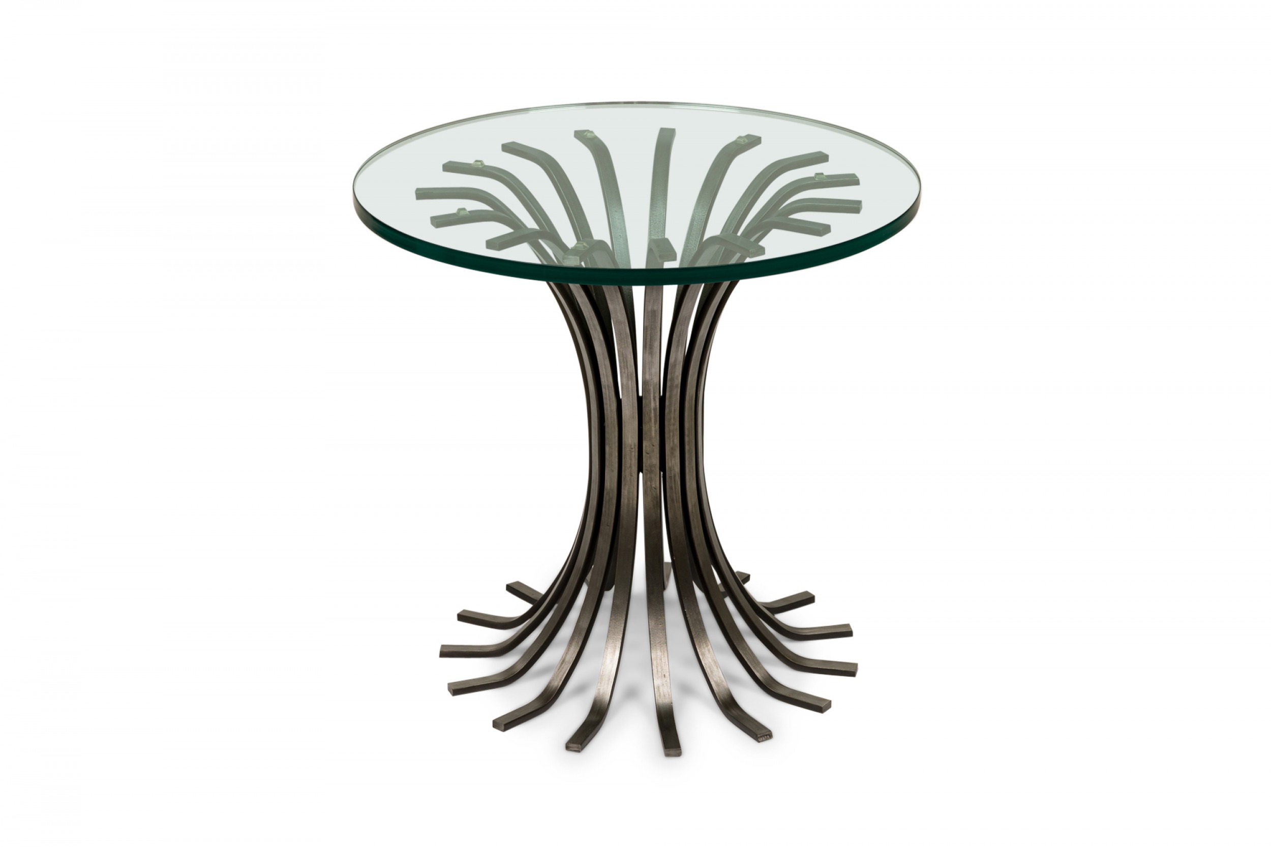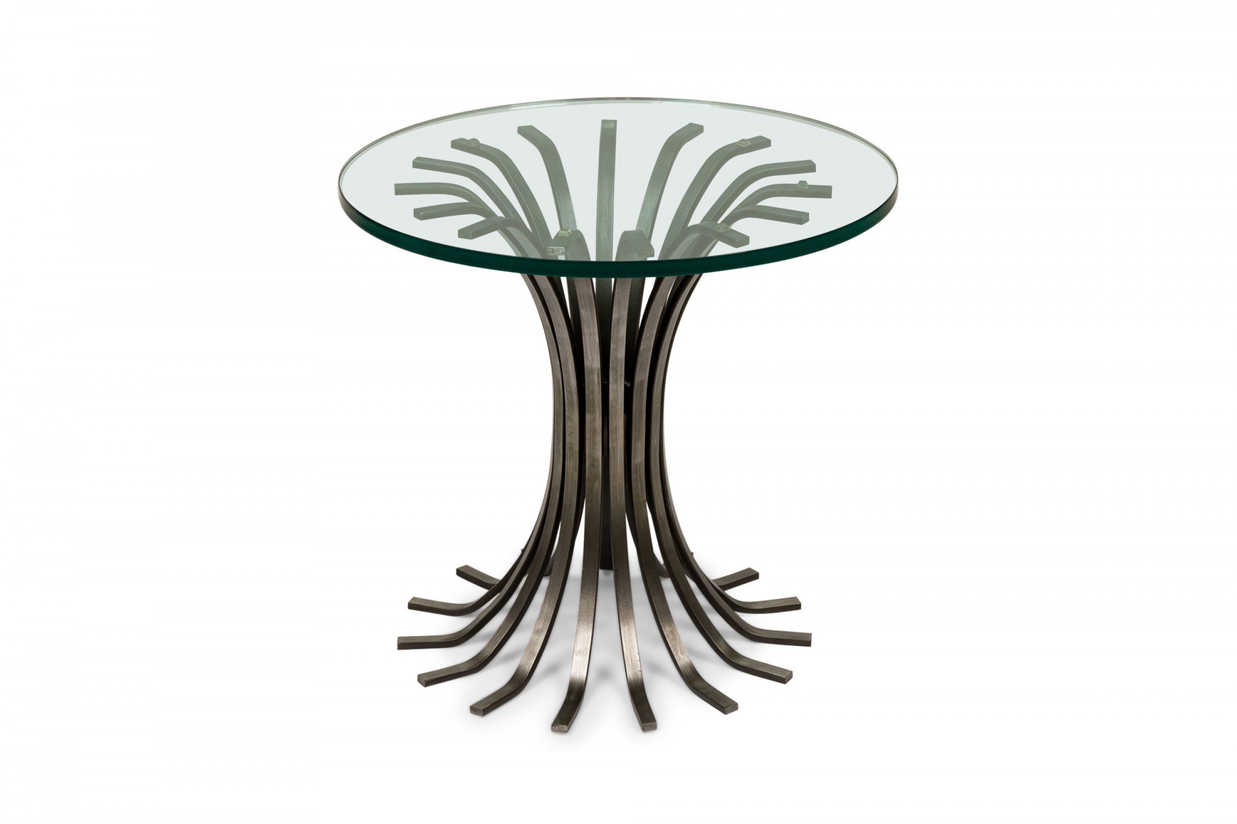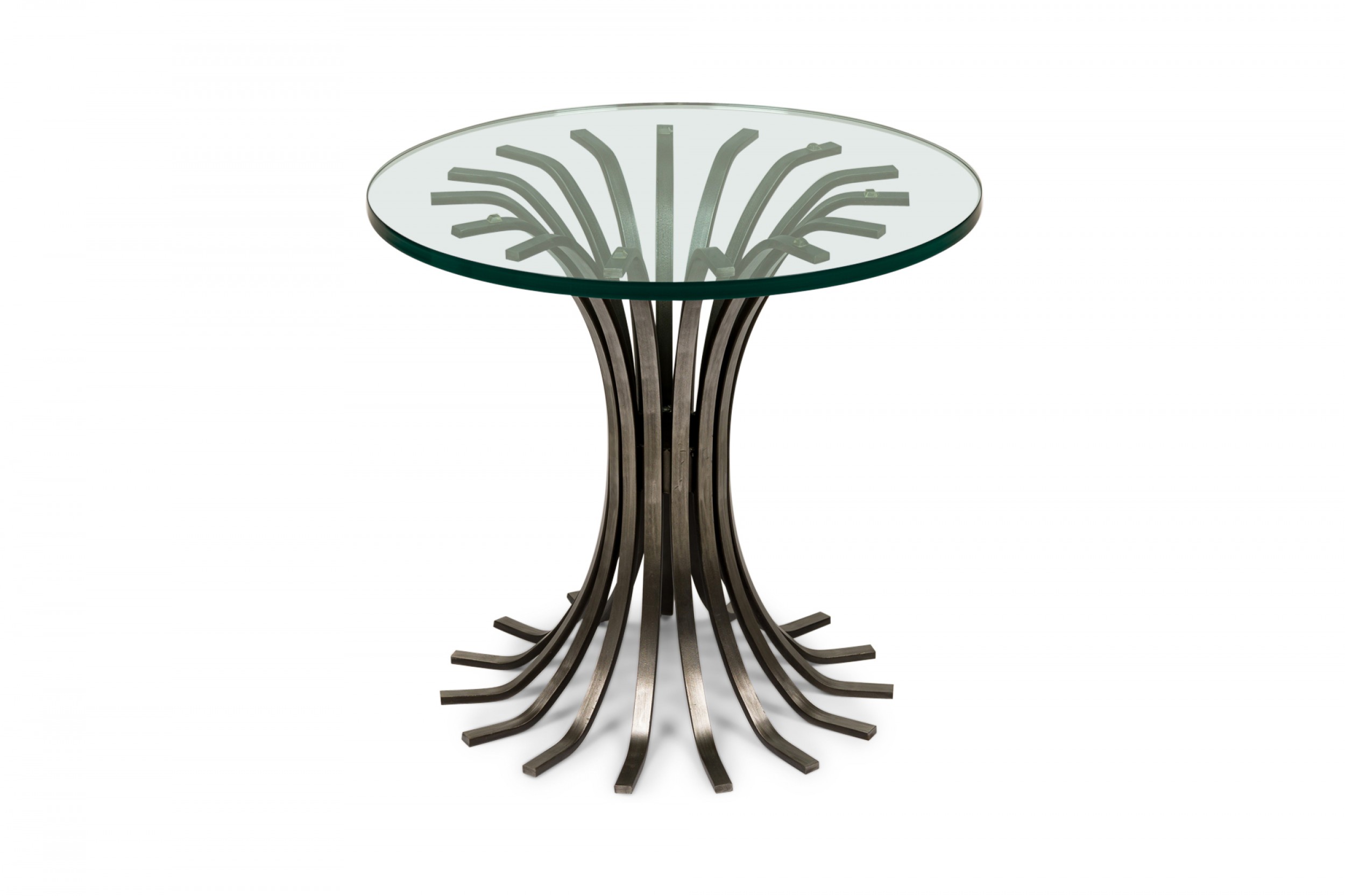 French Mid-Century (circa 1950) occasional table with an hourglass form base comprised of curved iron slats, supporting a thick circular clear glass top. (Matching end / side tables: NWL6607).