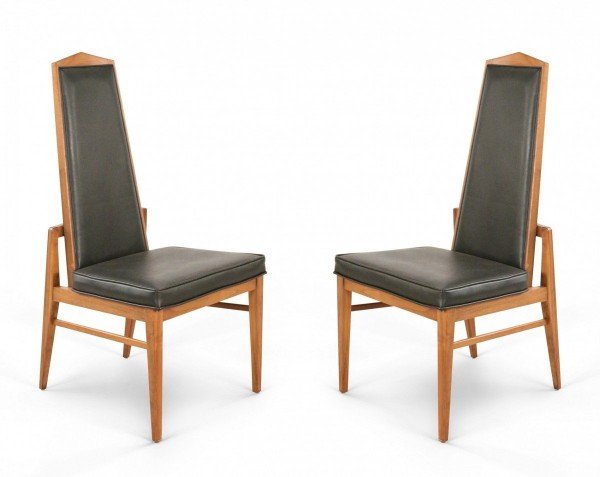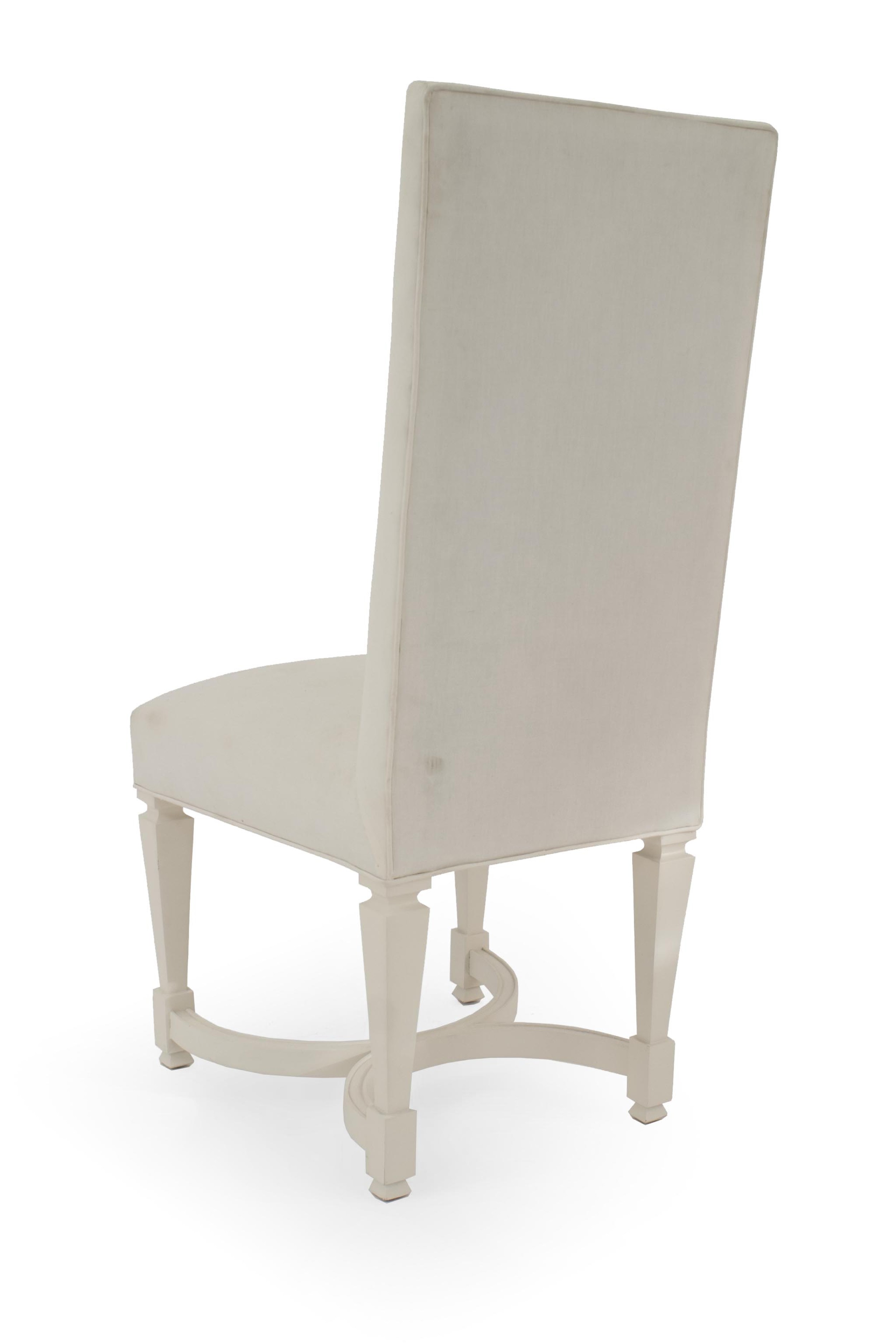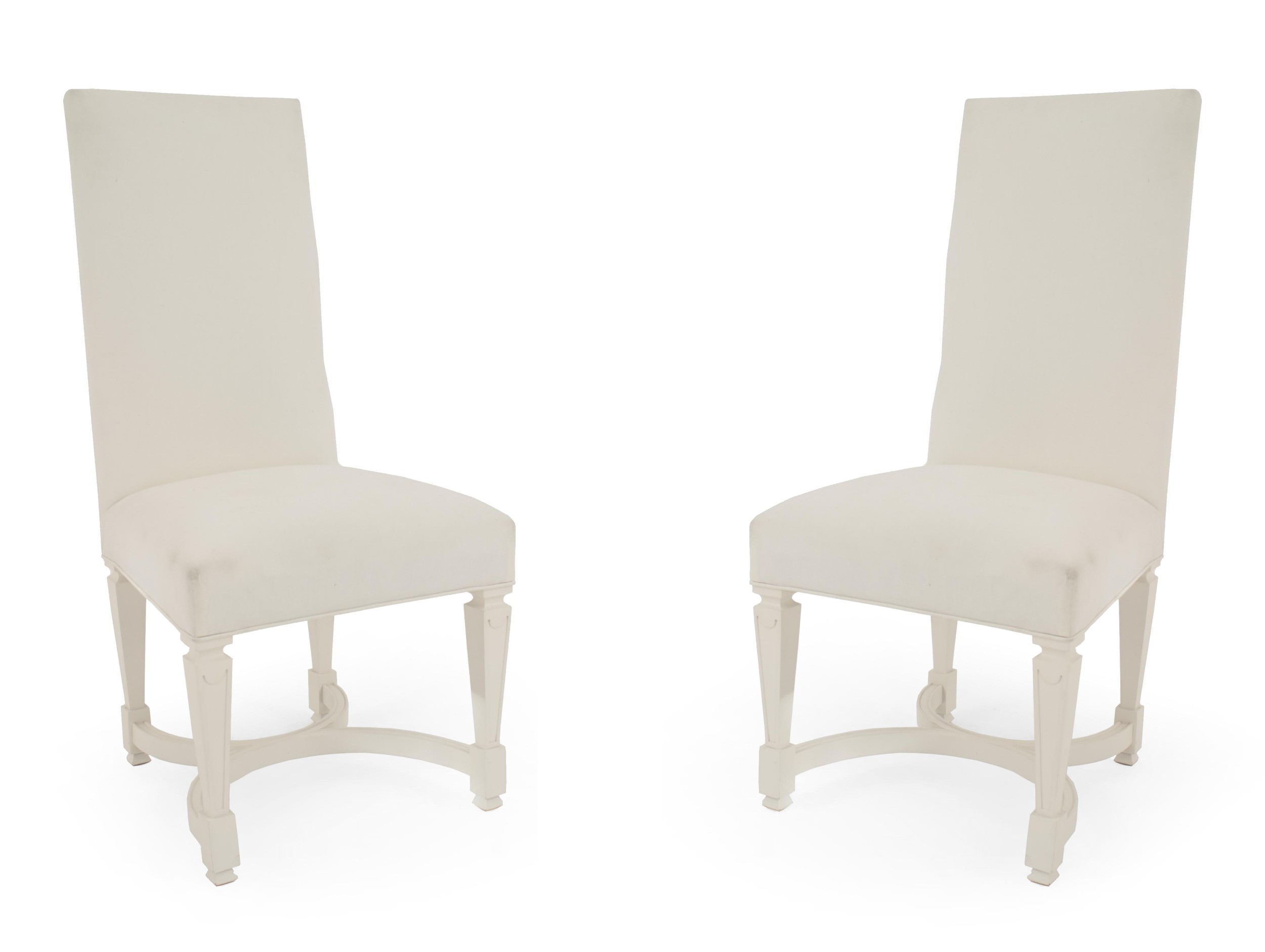 PAIR of French Mid-Century white lacquered over oak & upholstered high back side chairs with tapered square legs connected by a stretcher (signed: ANDRE ARBUS) (ref: ARBUS, by Brunhammer, pg 232) (PRICED AS PAIR)