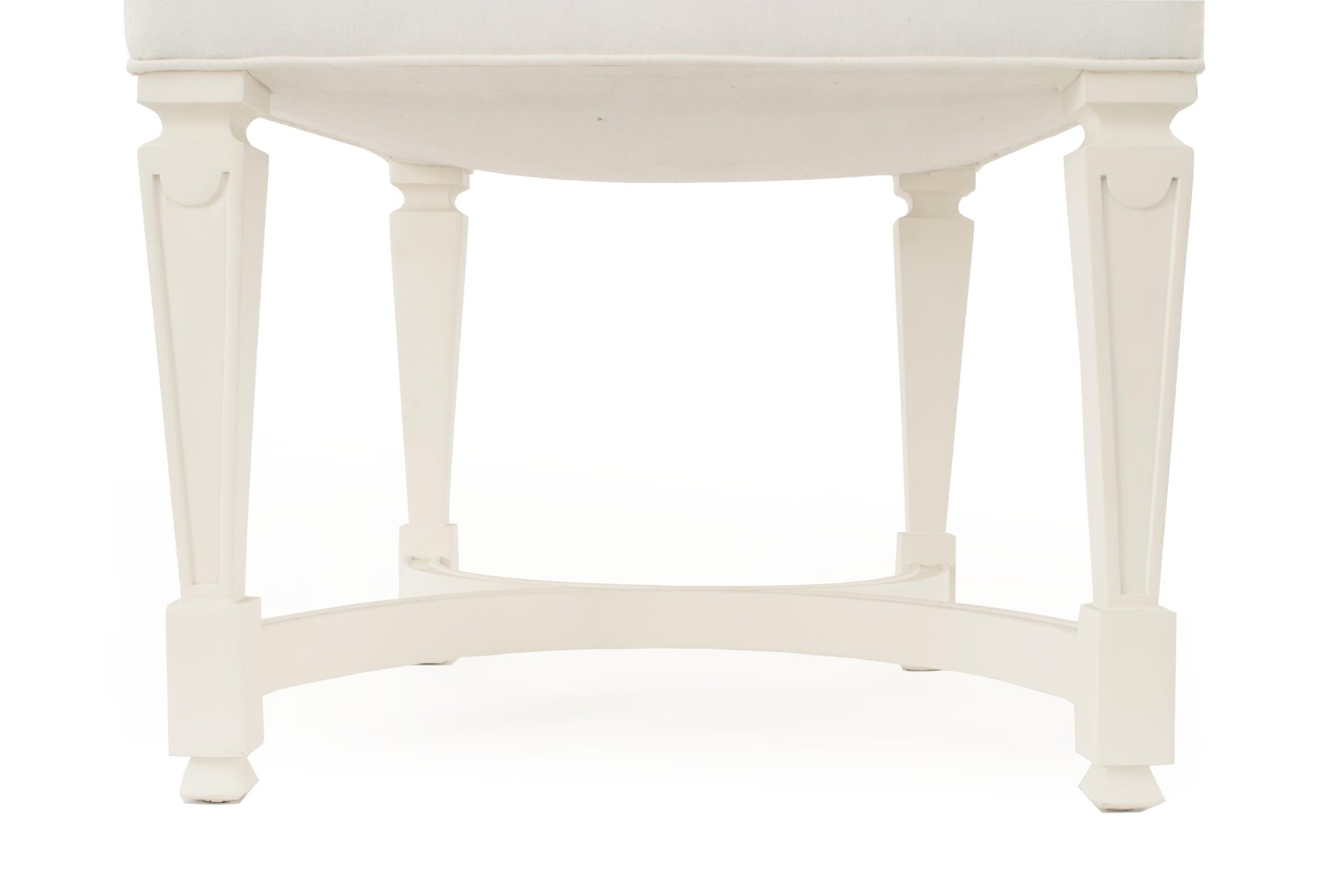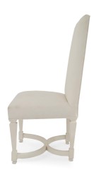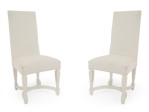PAIR of French Mid-Century white lacquered over oak & upholstered high back side chairs with tapered square legs connected by a stretcher (signed: ANDRE ARBUS) (ref: ARBUS, by Brunhammer, pg 232) (PRICED AS PAIR).