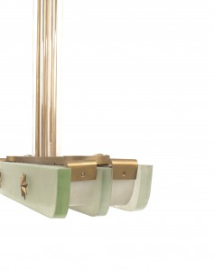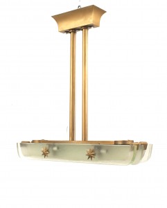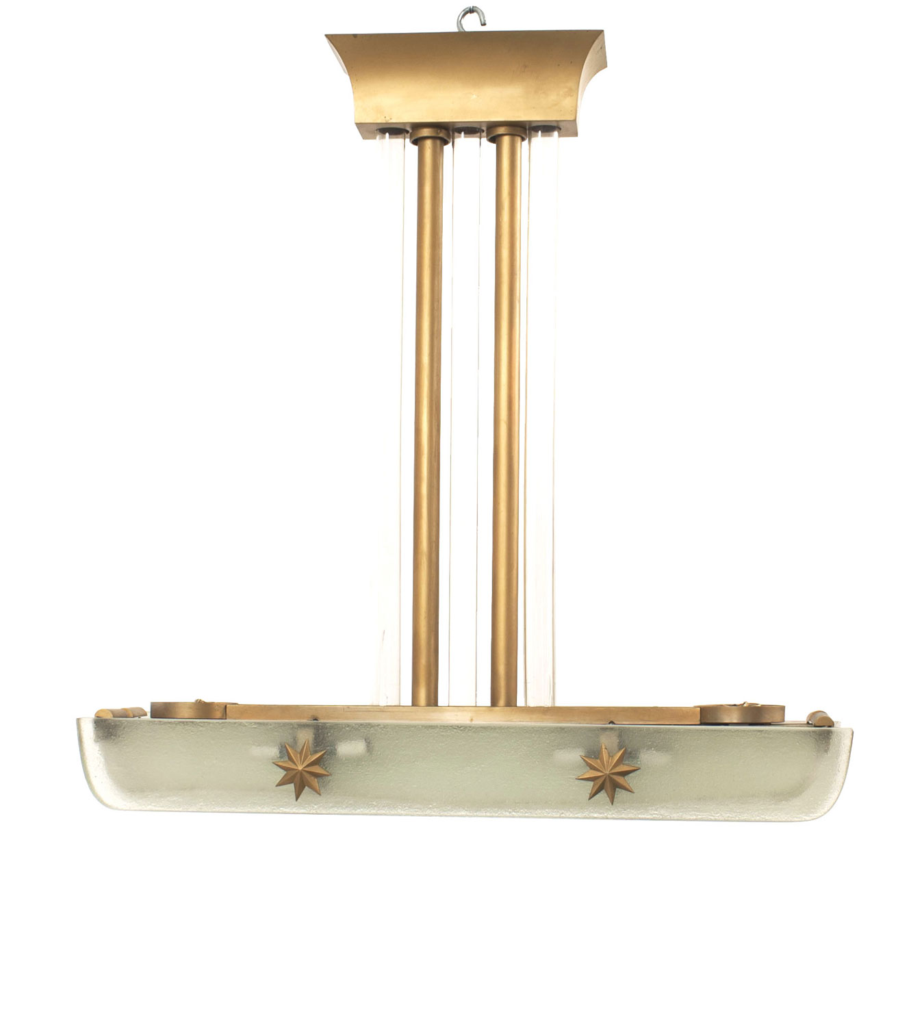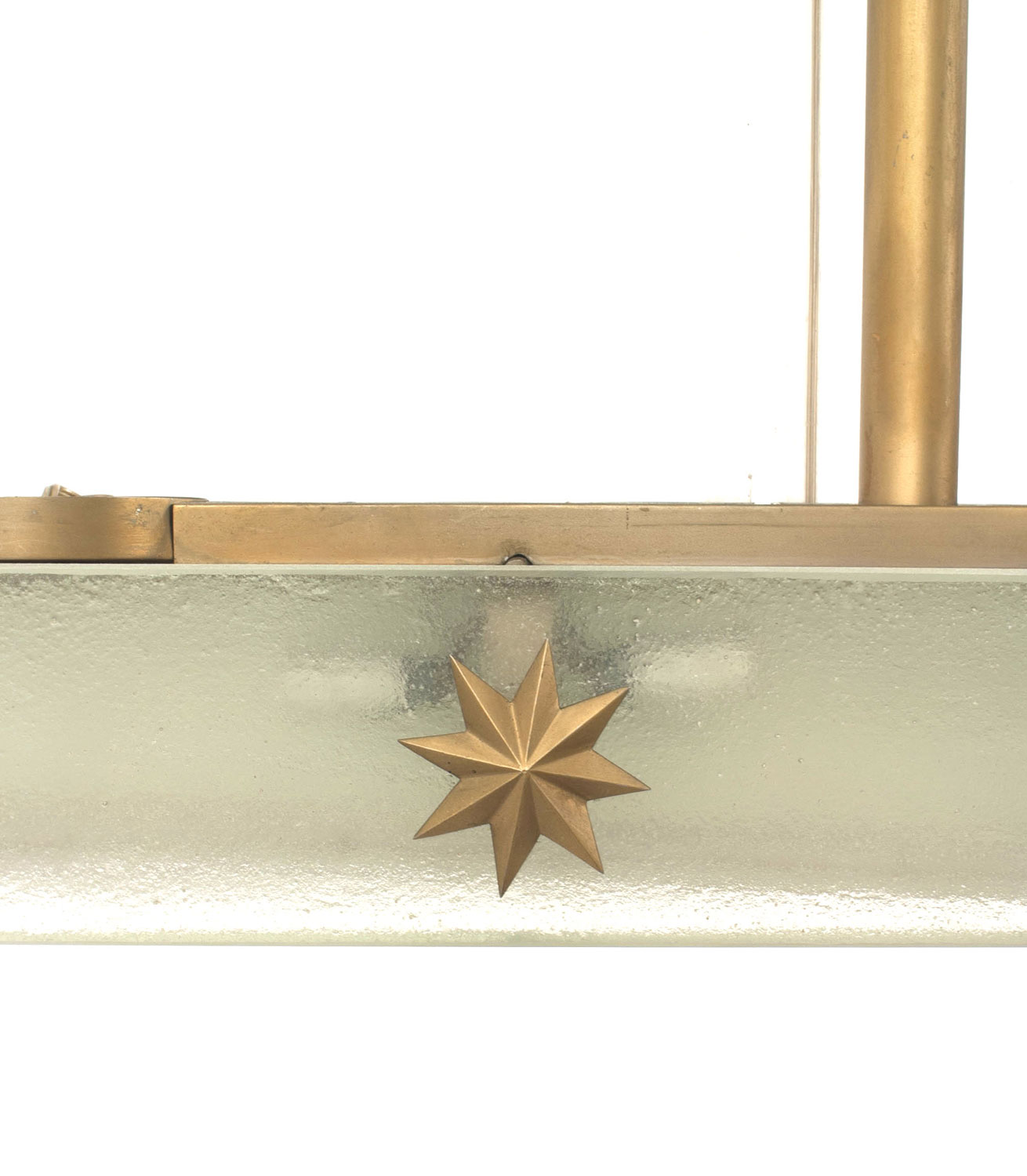 French (1940s) chandelier with lucite horizontal panels separated by 3 Saint-Gobain Glass panels with gilt star trim and suspended by a gilt metal and tubular glass center extension..