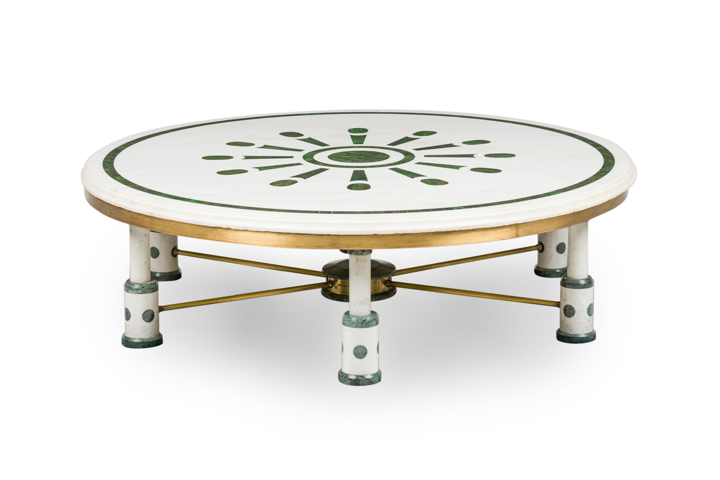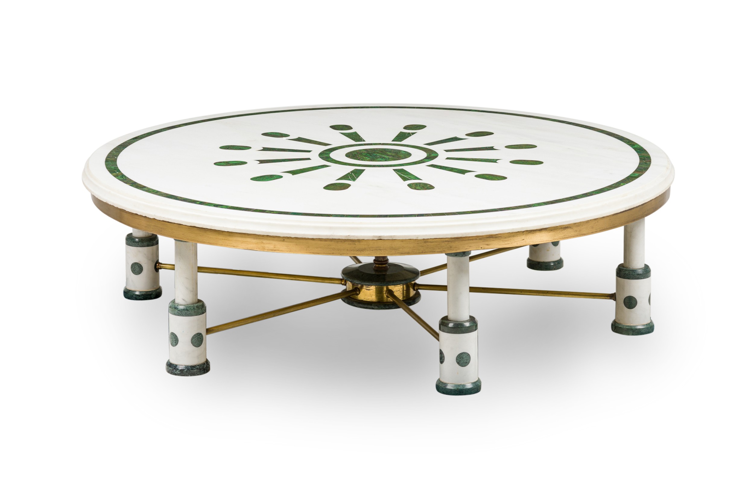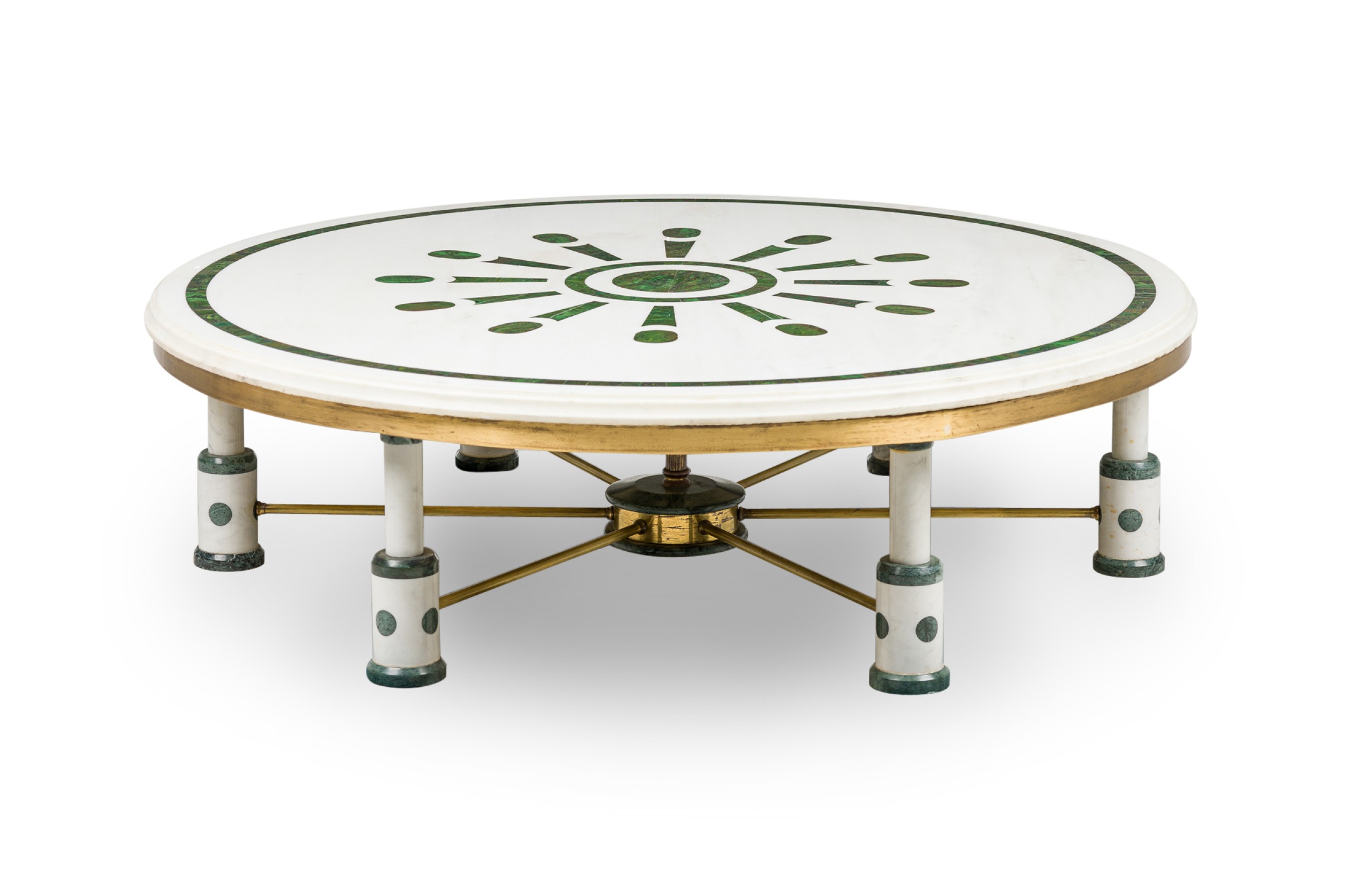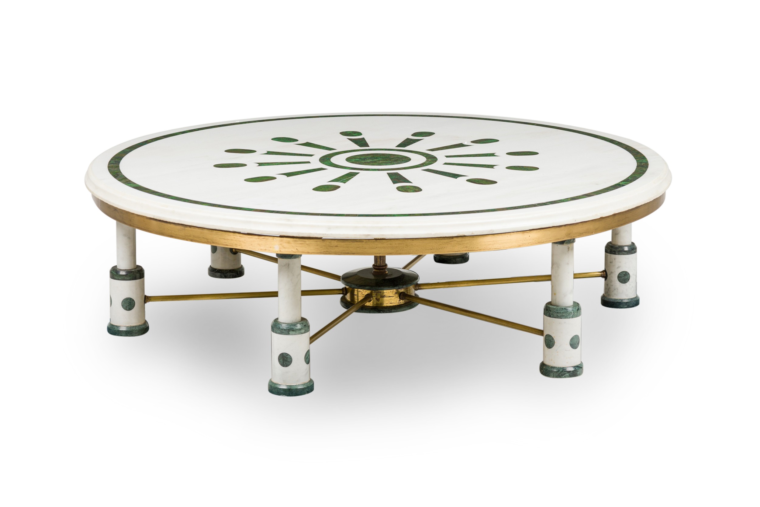 Mid-Century (probably Indian) large white and green marble coffee table, with a round top supported by 6 legs, each connect by a brass bar stretcher to a center leg