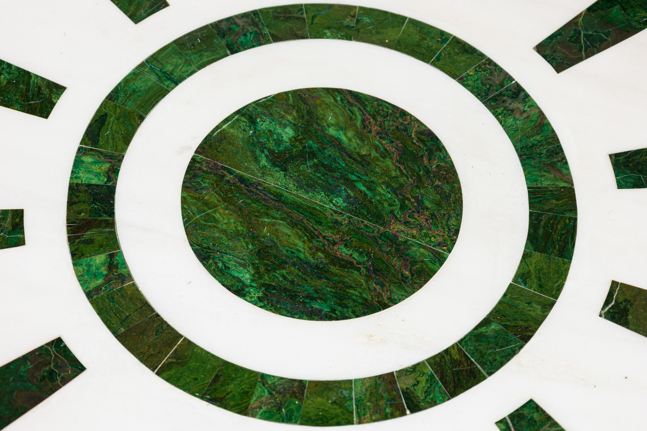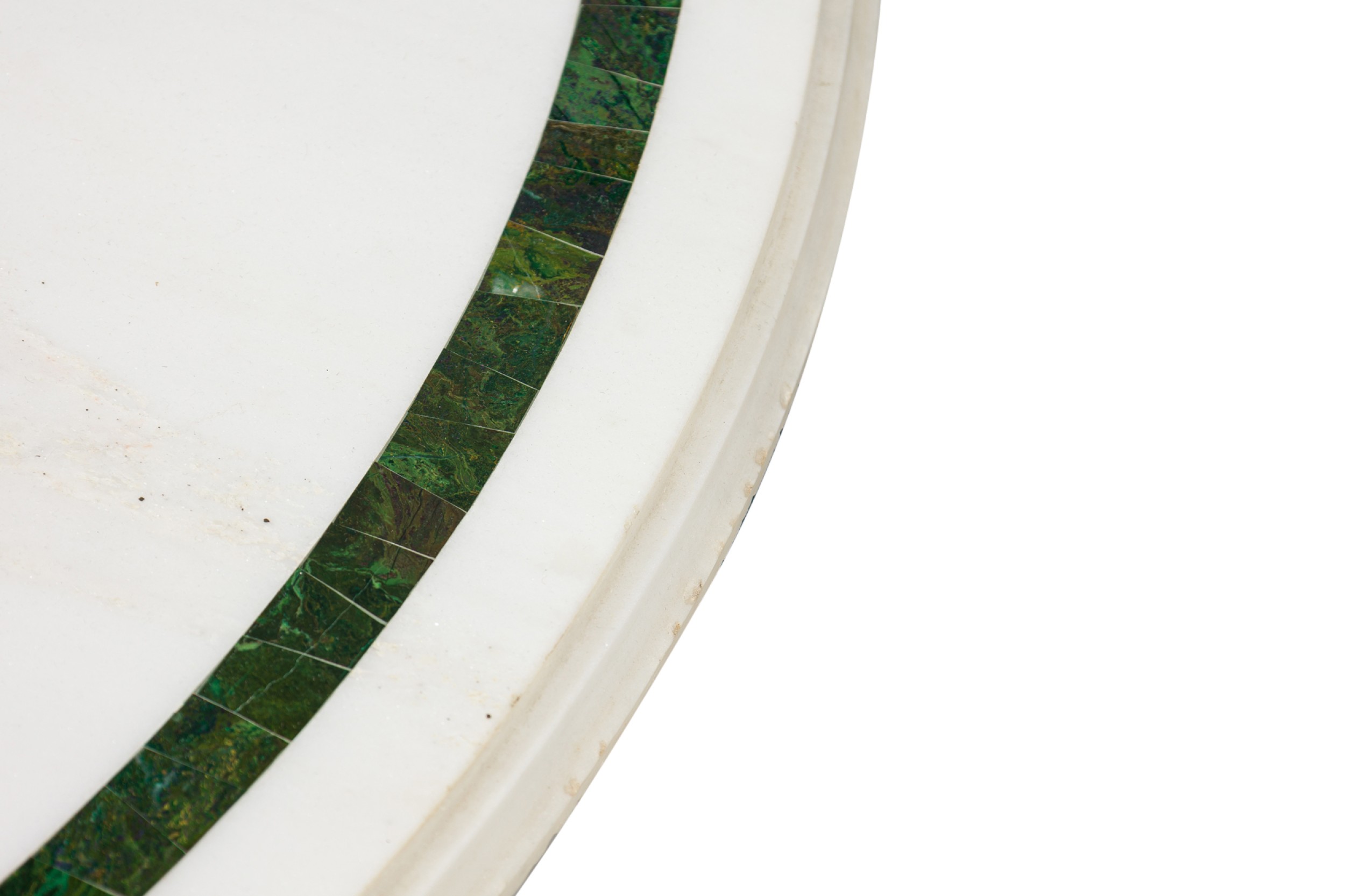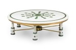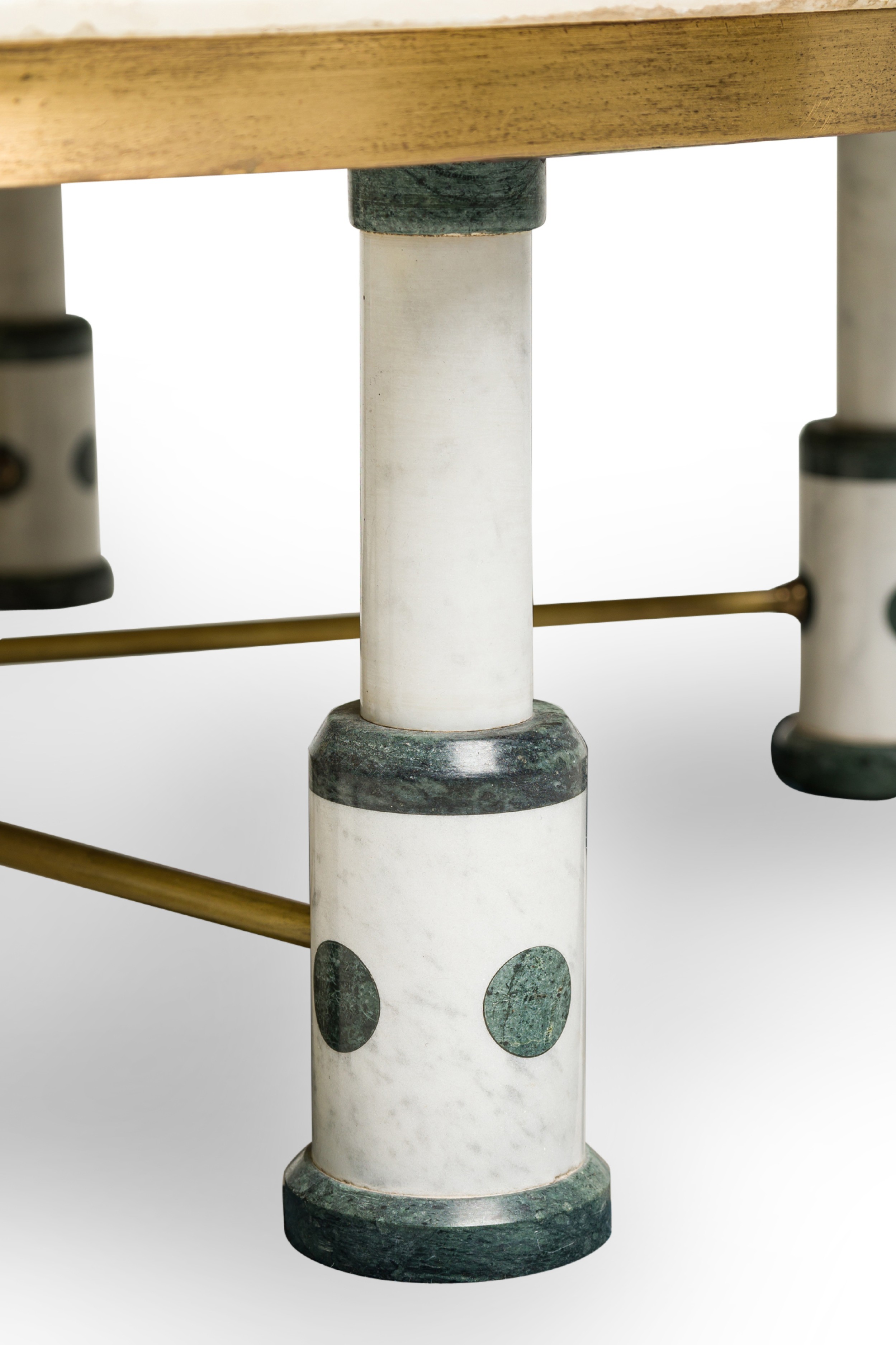 Mid-Century (probably Indian) large white and green marble coffee table, with a round top supported by 6 legs, each connect by a brass bar stretcher to a center leg
