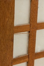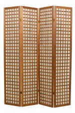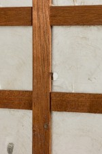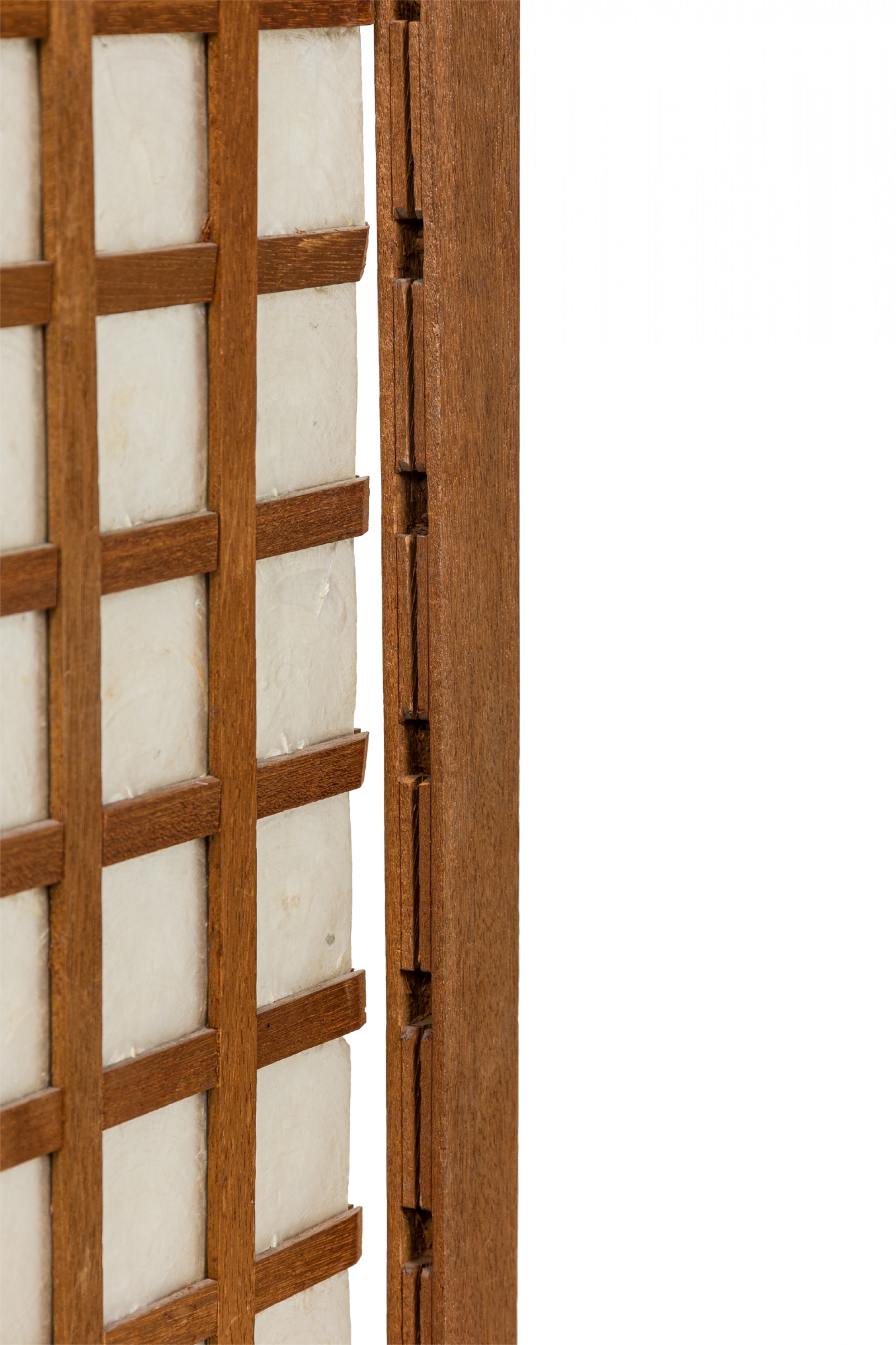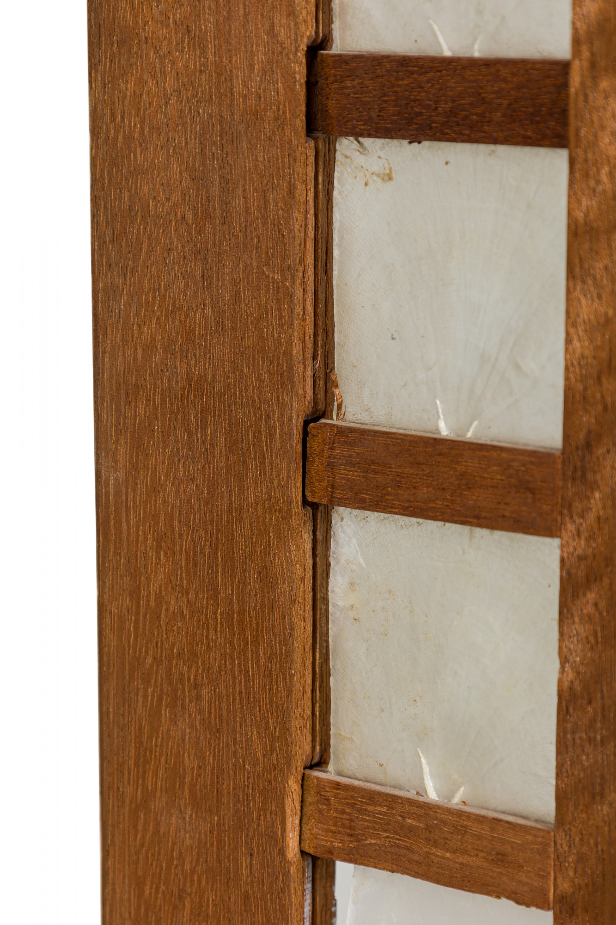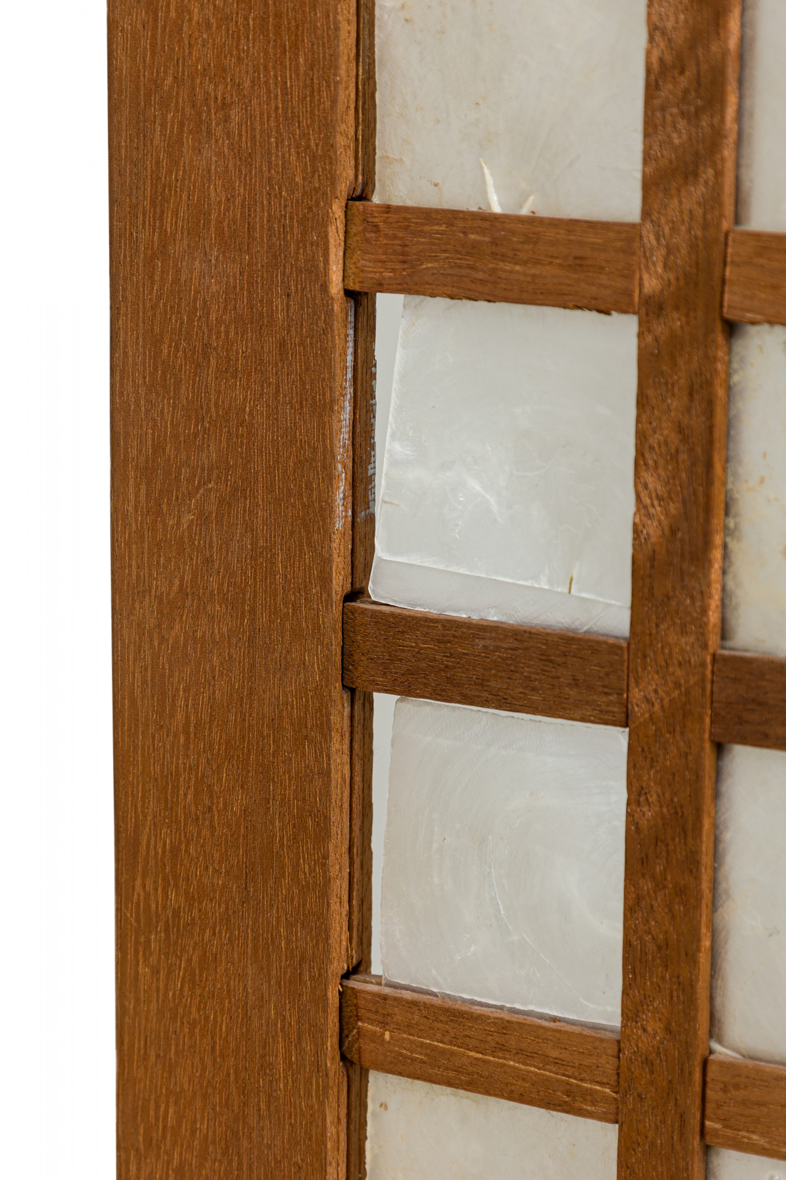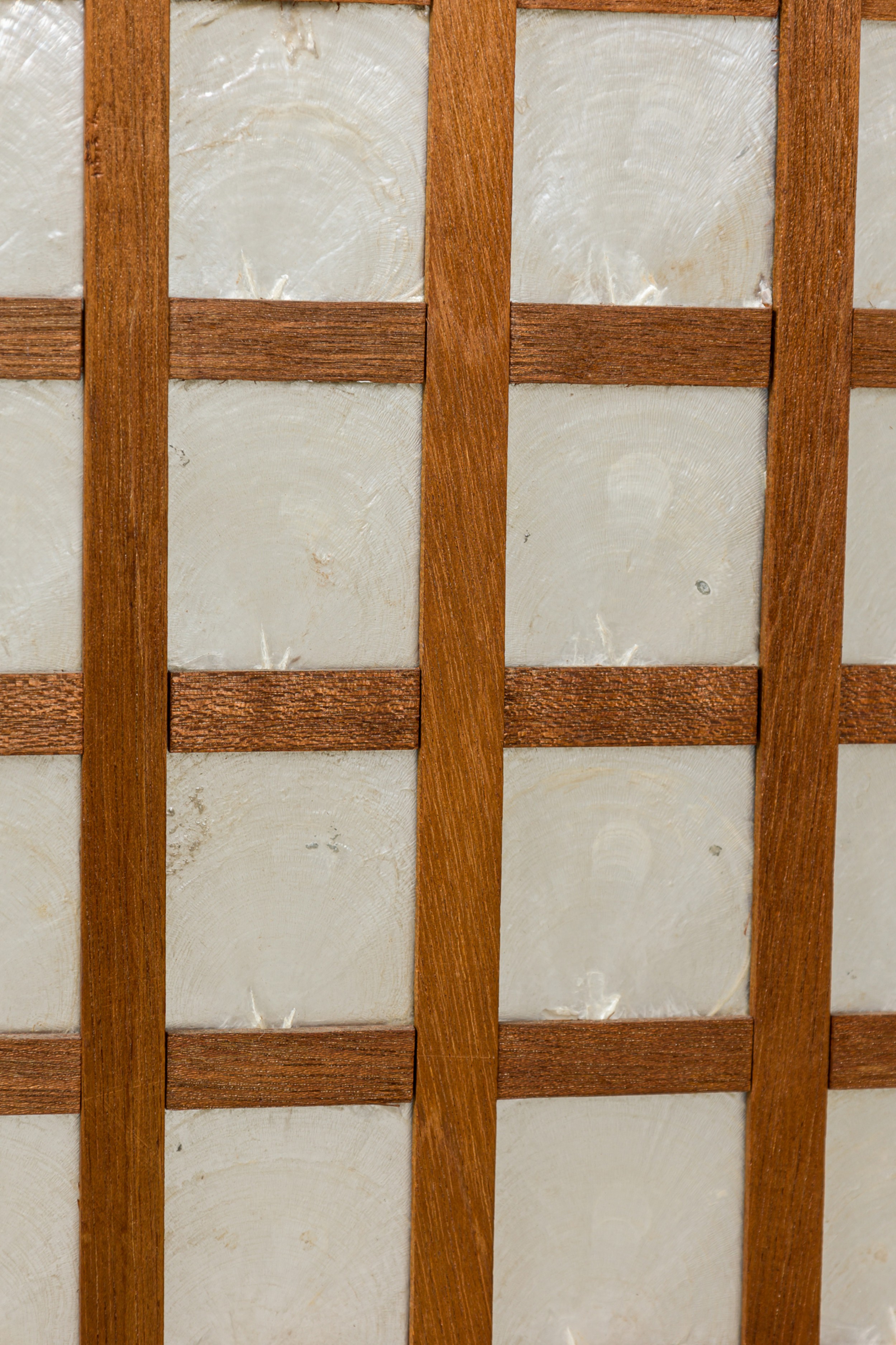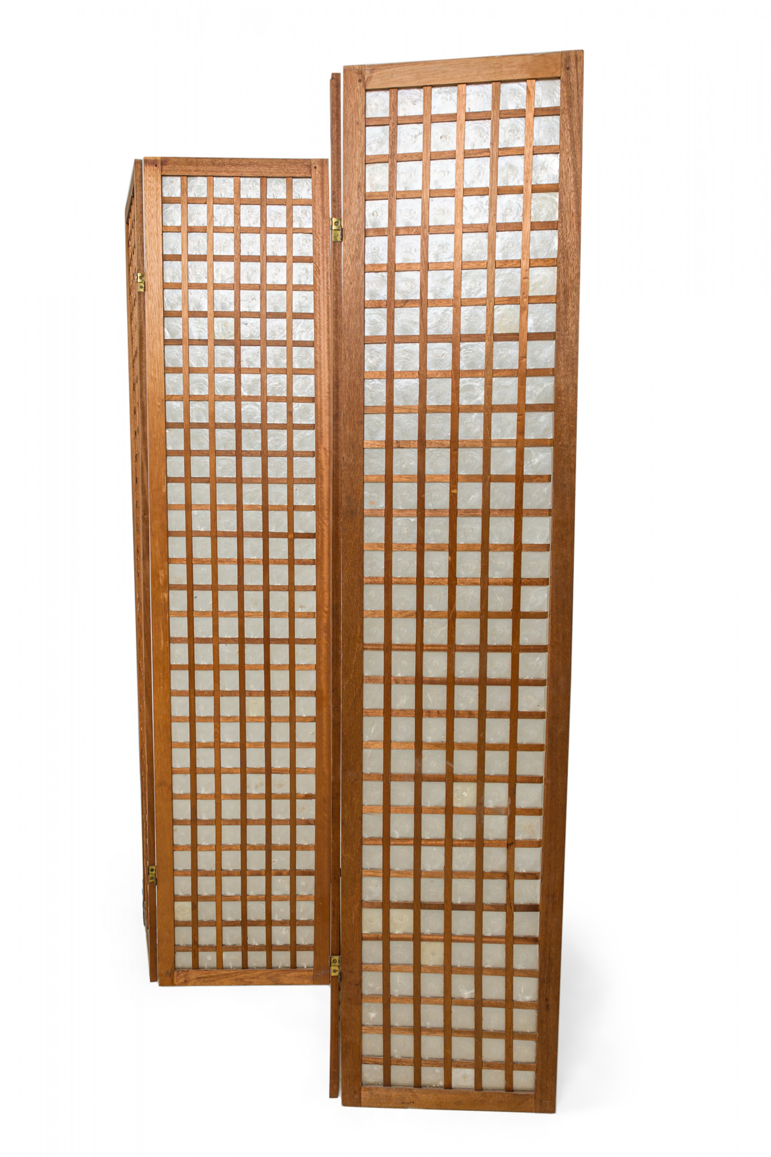 French Mid-Century 4-panel folding screen with a frame constructed from cerused wood in a grid pattern centering square mother of pearl panels.