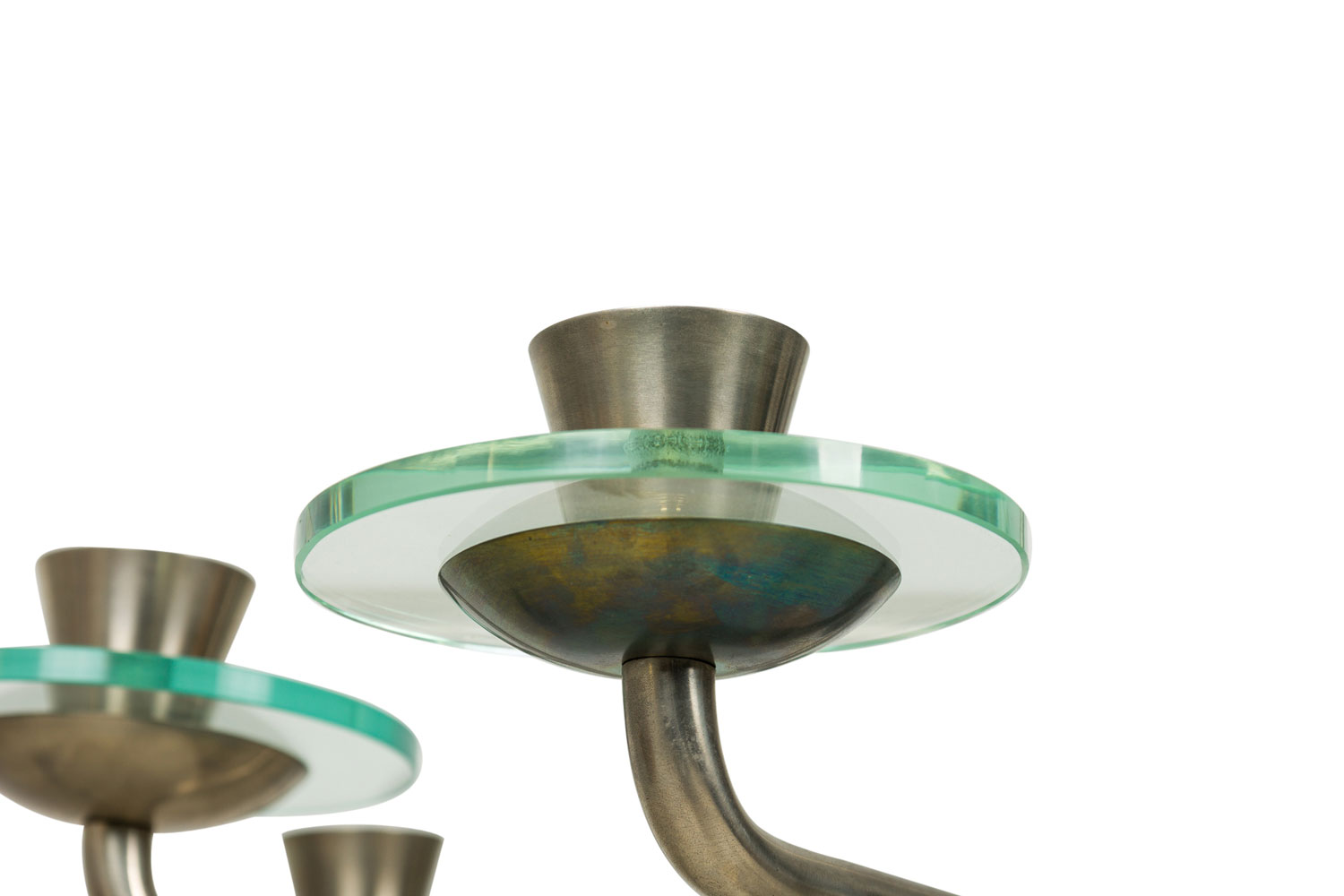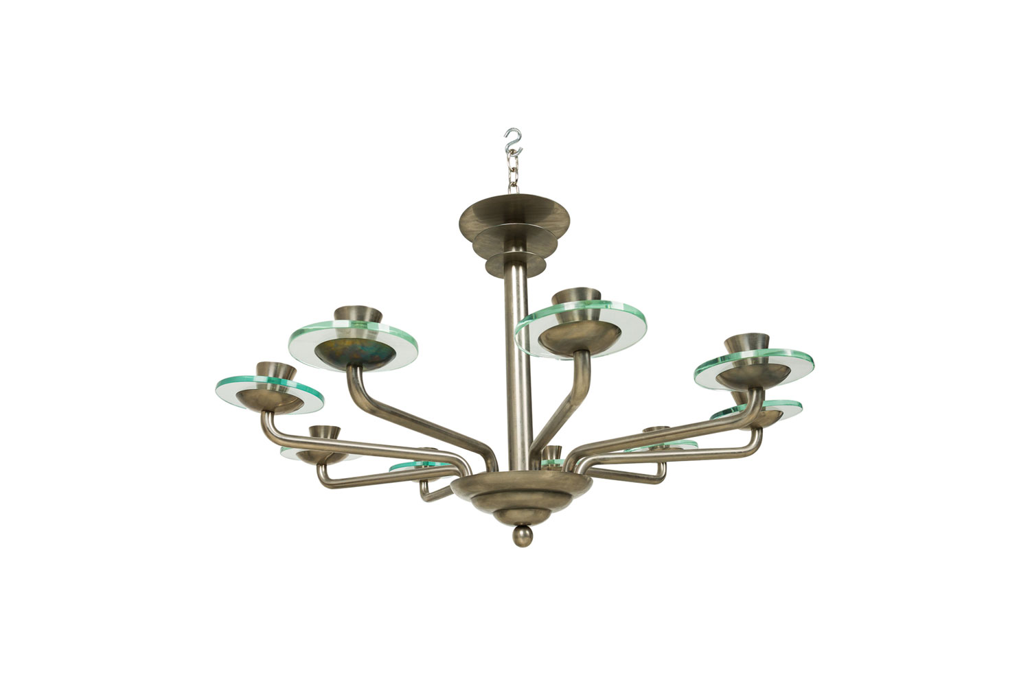 French Mid-Century Modernist (1940's) steel 9 arm chandelier with 3 discs on top and glass disc form bobesch..