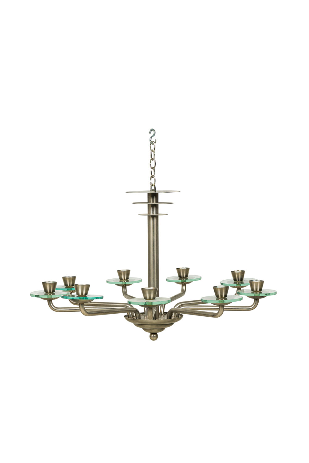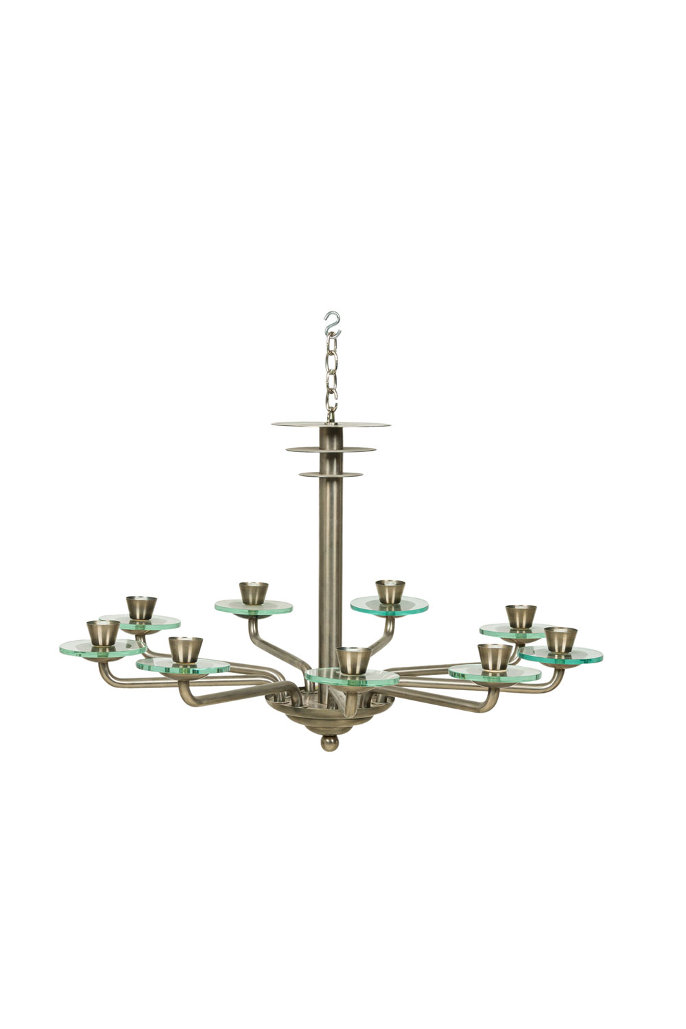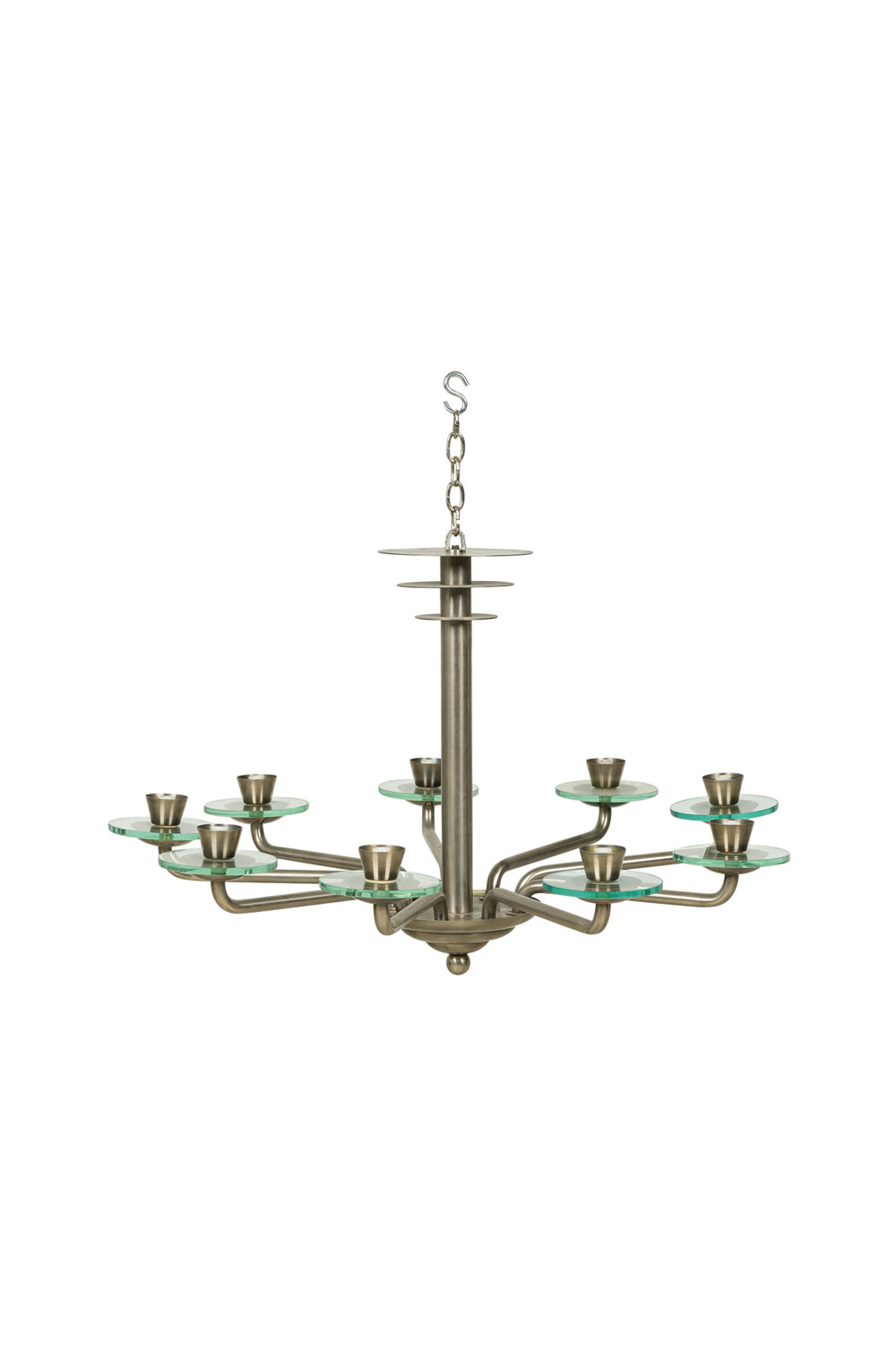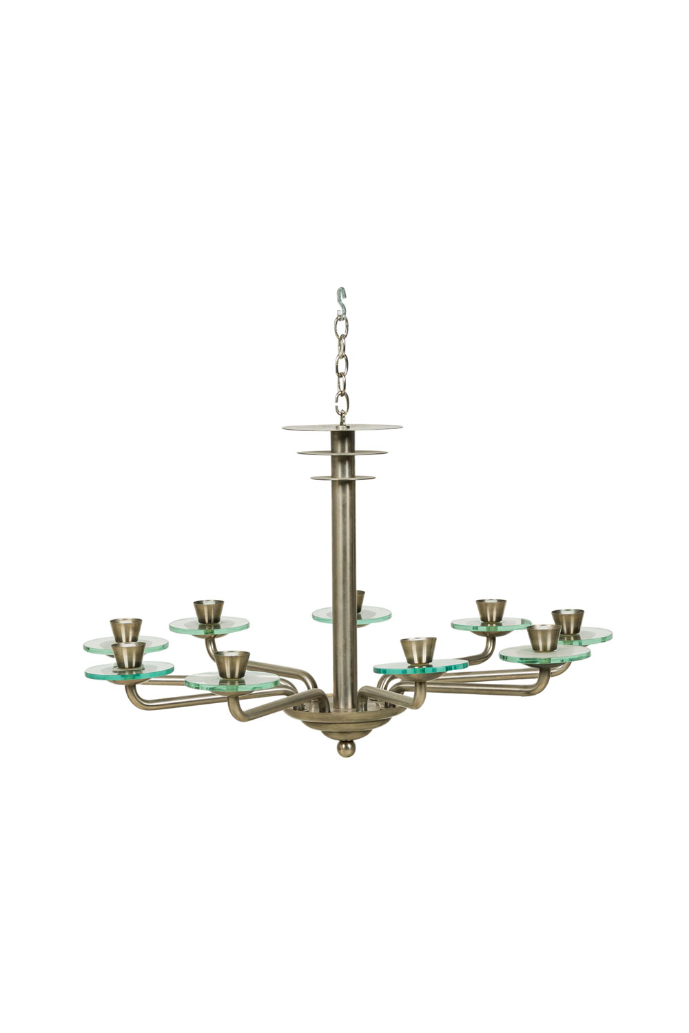 French Mid-Century Modernist (1940's) steel 9 arm chandelier with 3 discs on top and glass disc form bobesch.