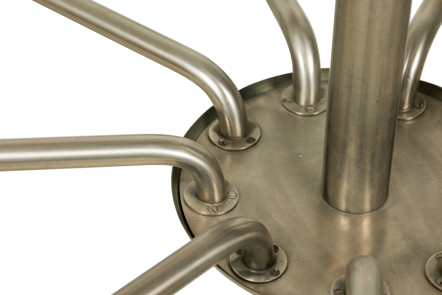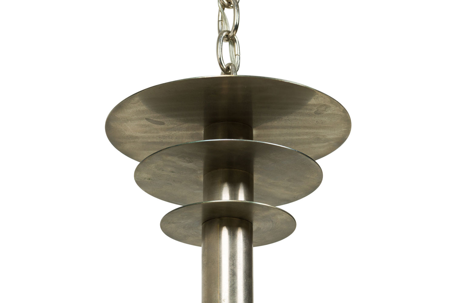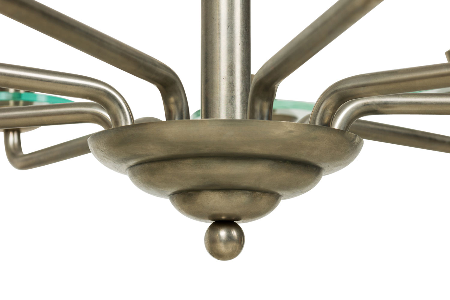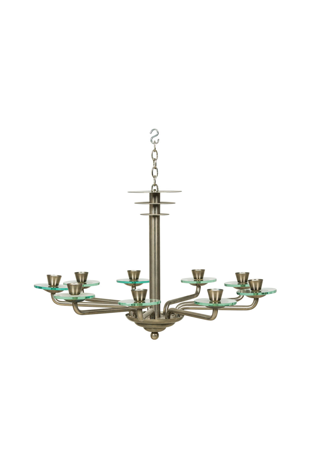 French Mid-Century Modernist (1940's) steel 9 arm chandelier with 3 discs on top and glass disc form bobesch.