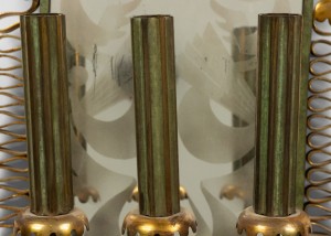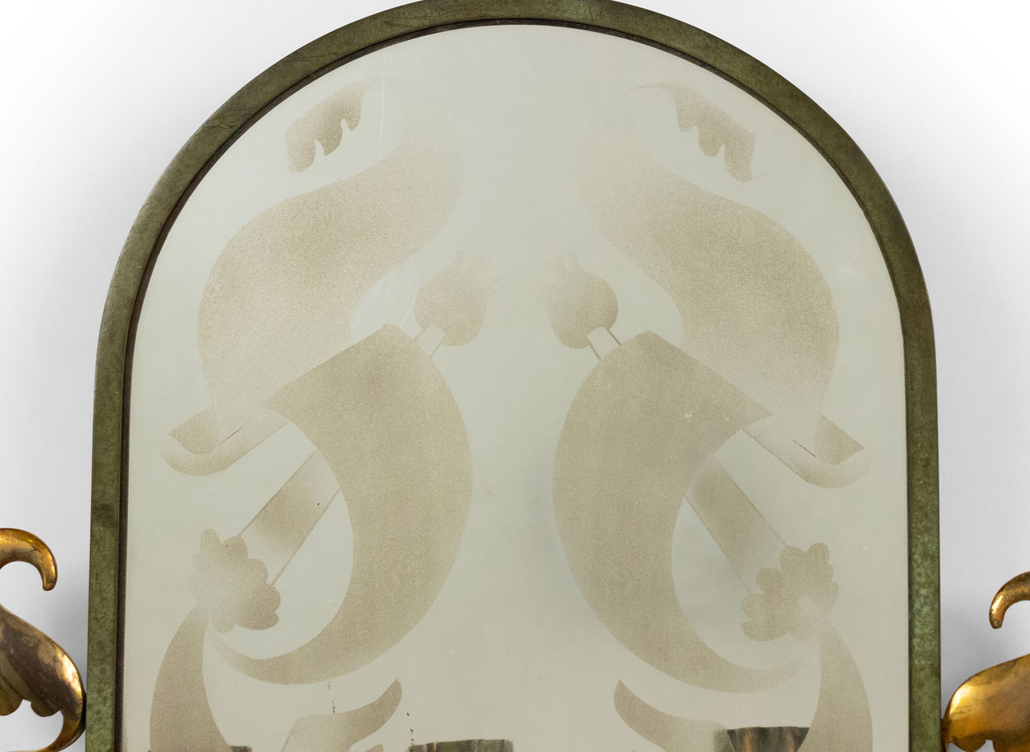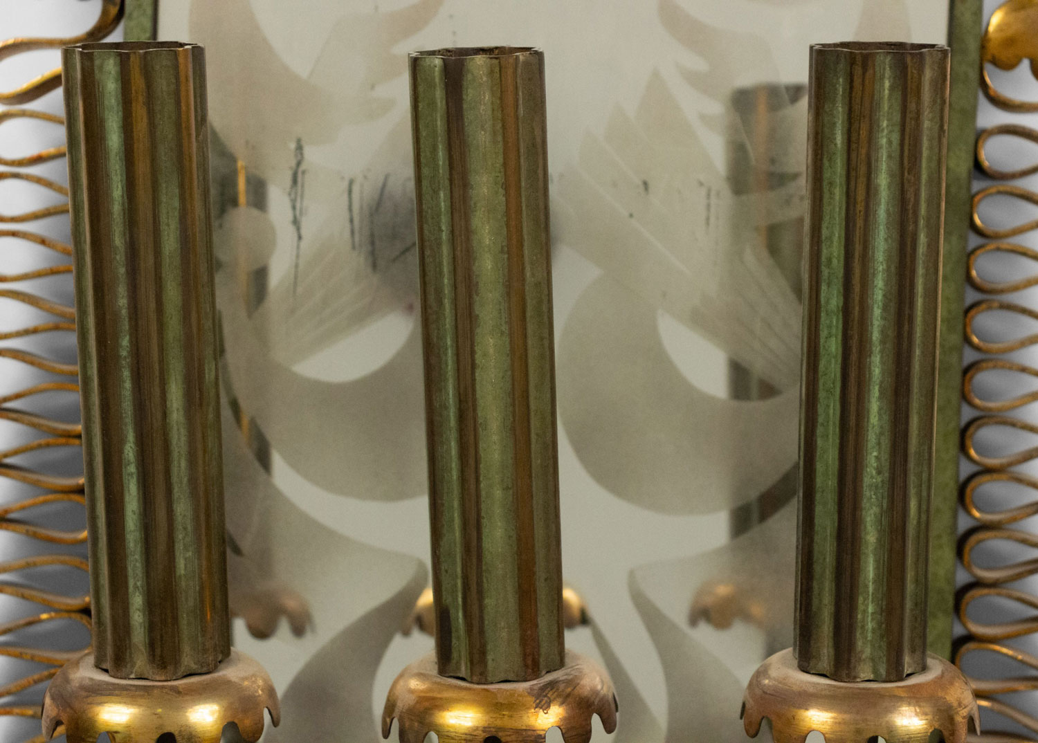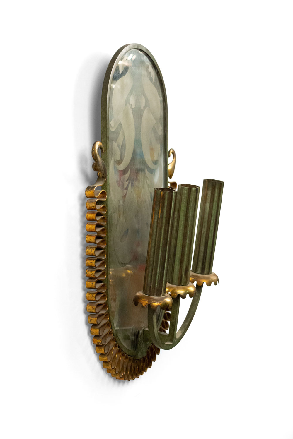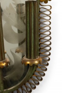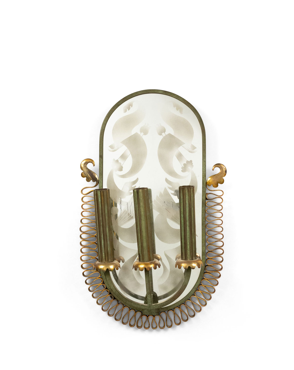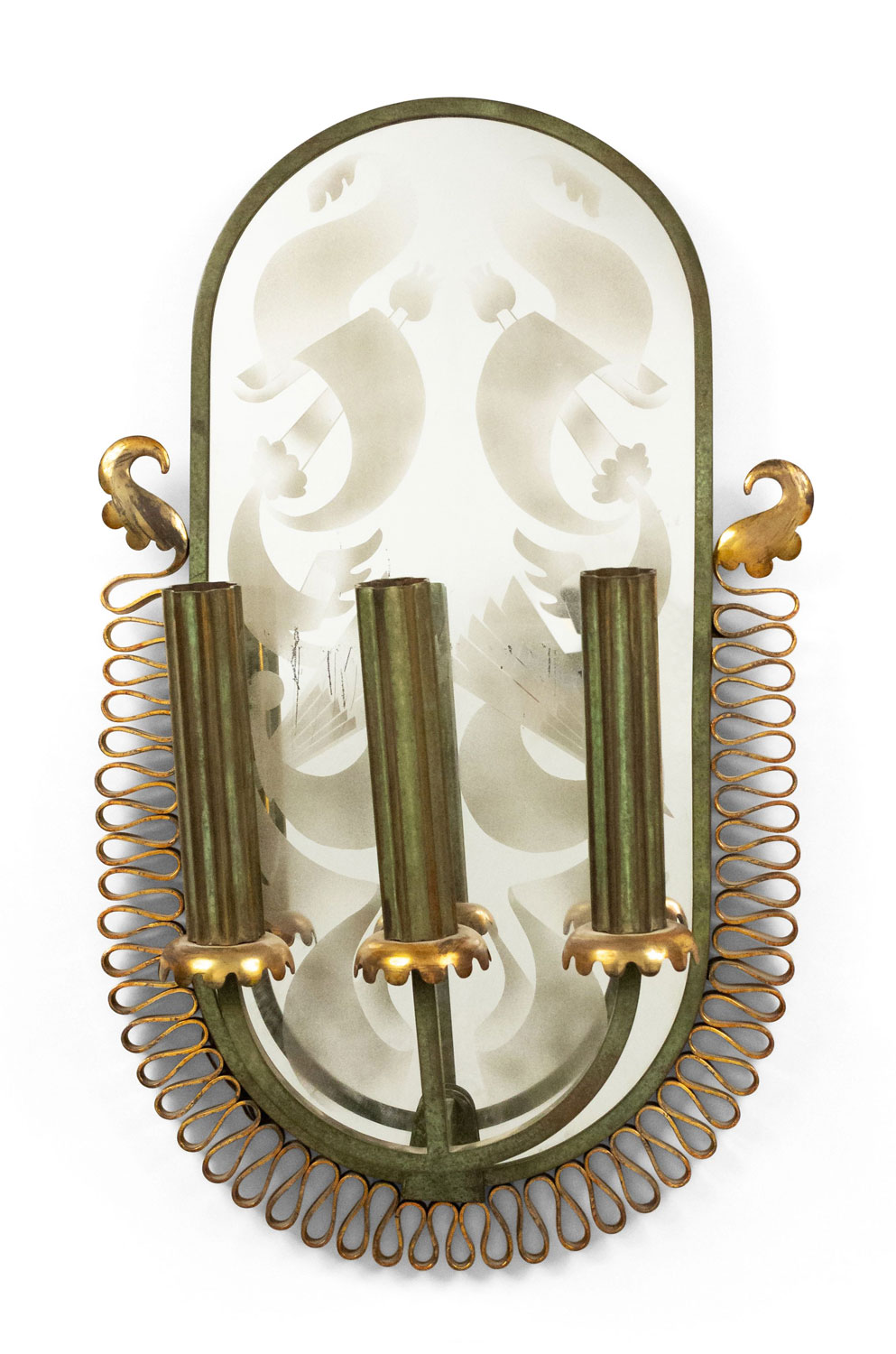 French Mid-Century (1940s) green painted metal wall sconce with three arms, gold filigree trim, and etched oval-shaped mirrored back.