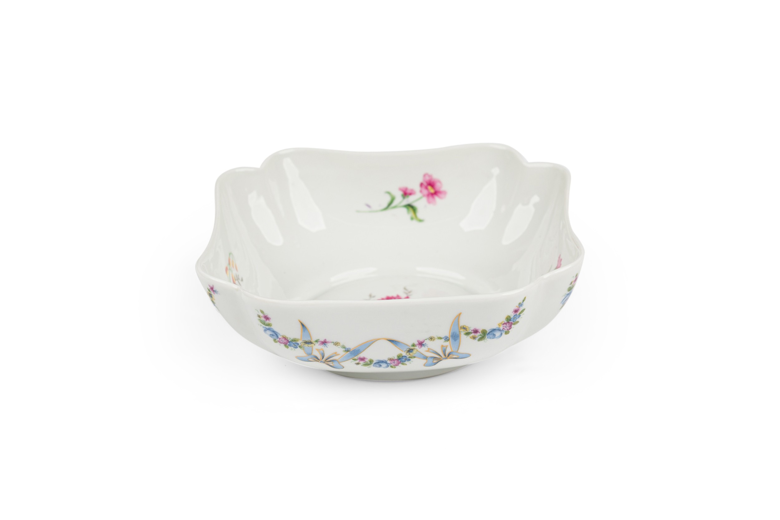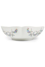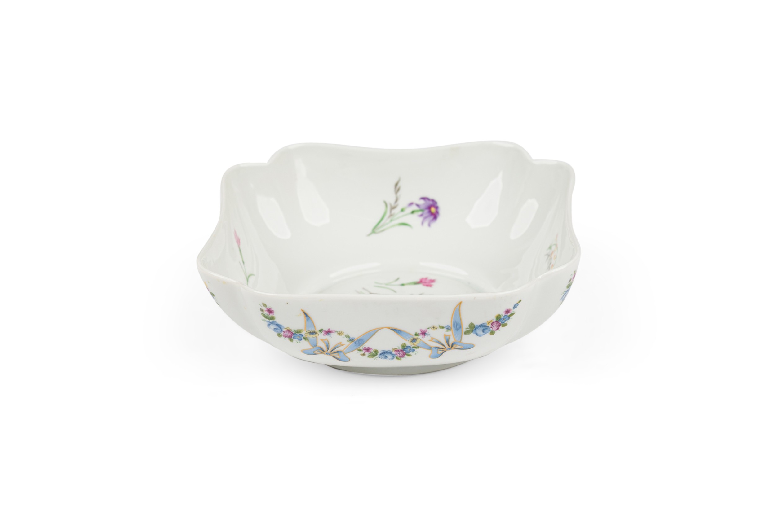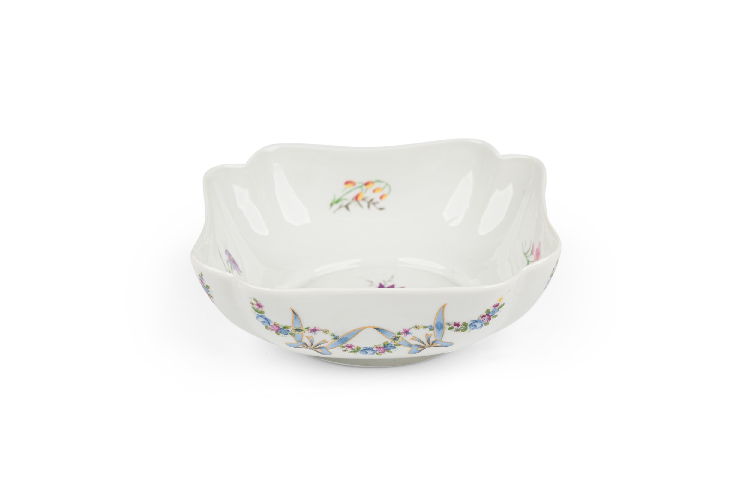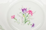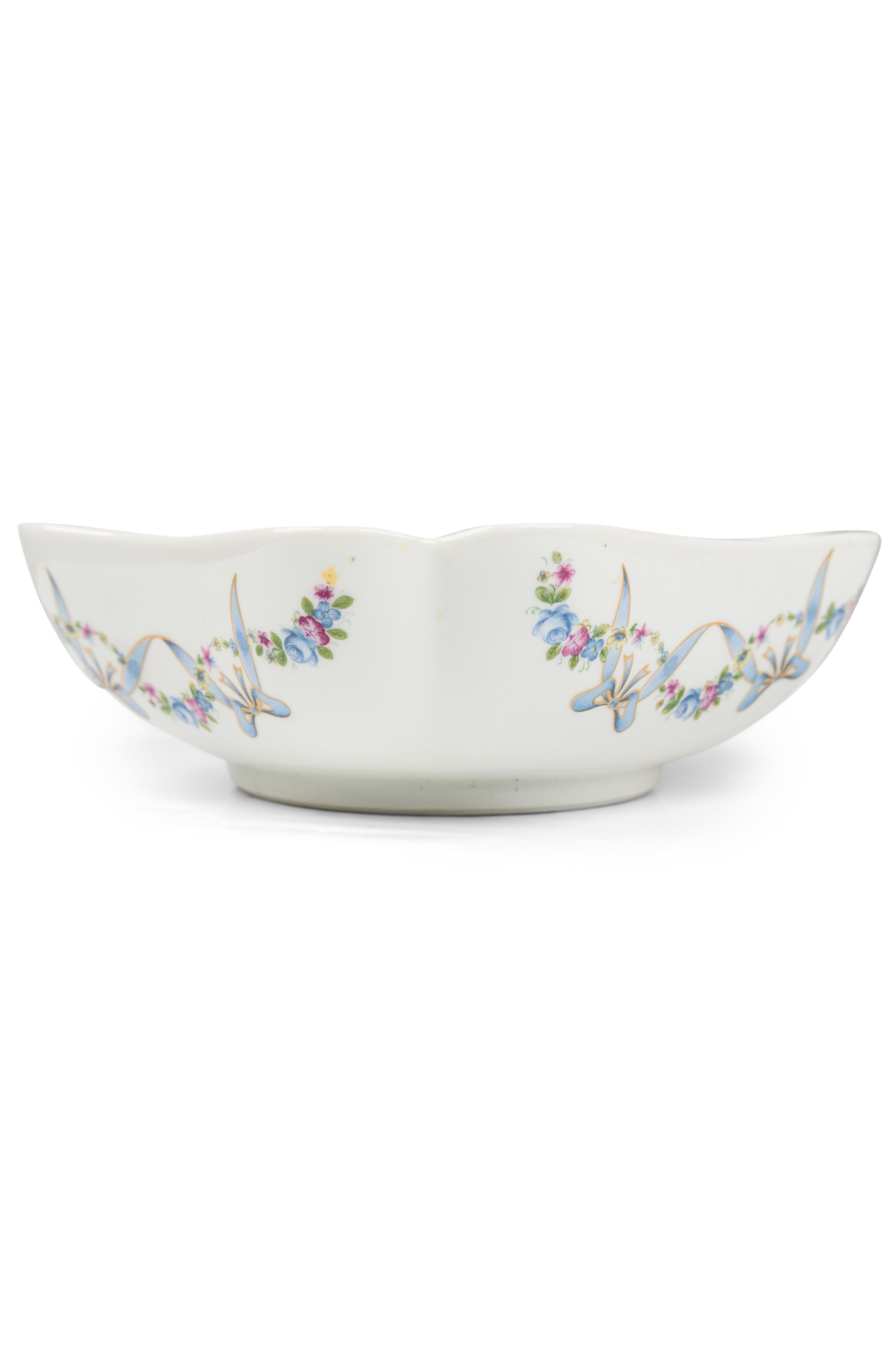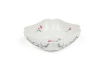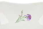 French Mid-Century porcelain scalloped rimmed white dish / bowl with hand painted floral design in center and outer rim with purple and pink flowers (LIMOGES, FRANCE).