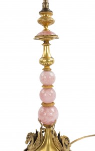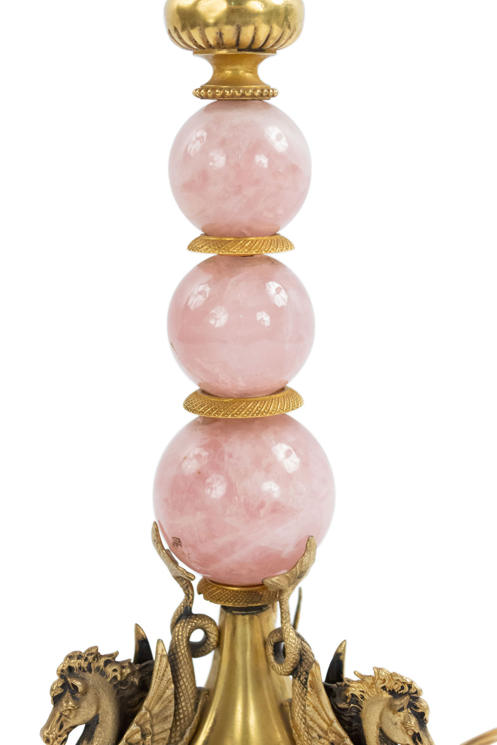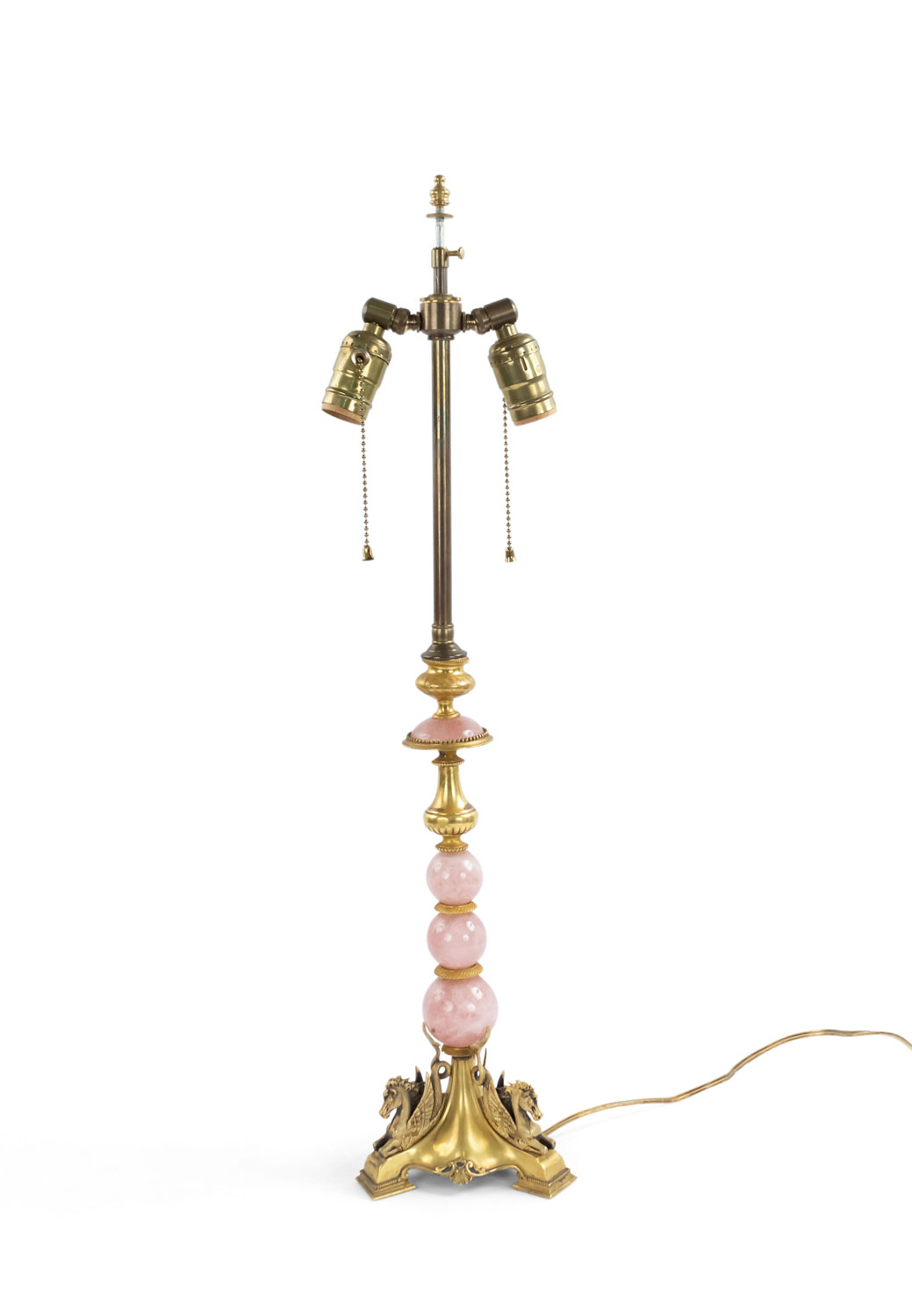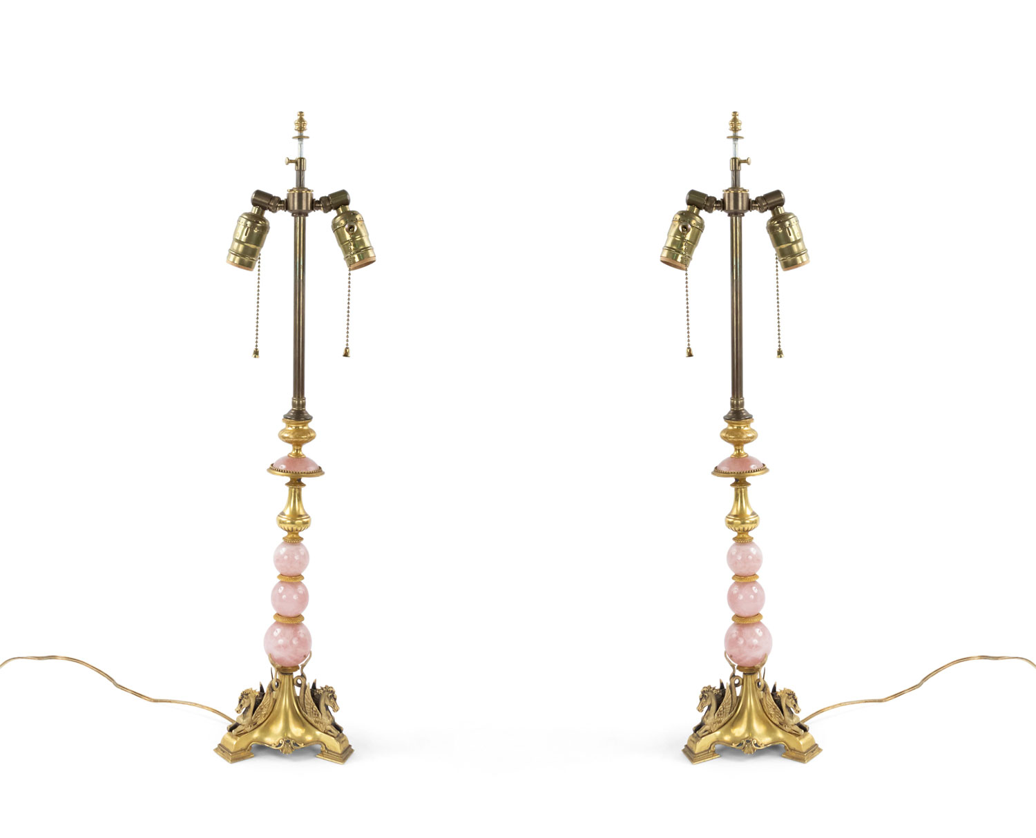 PAIR of French 1940s rose quartz and bronze dore table lamps with 3 seahorses at base (PRICED AS PAIR).