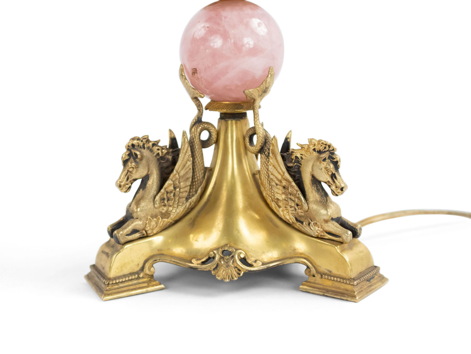 PAIR of French 1940s rose quartz and bronze dore table lamps with 3 seahorses at base (PRICED AS PAIR)..