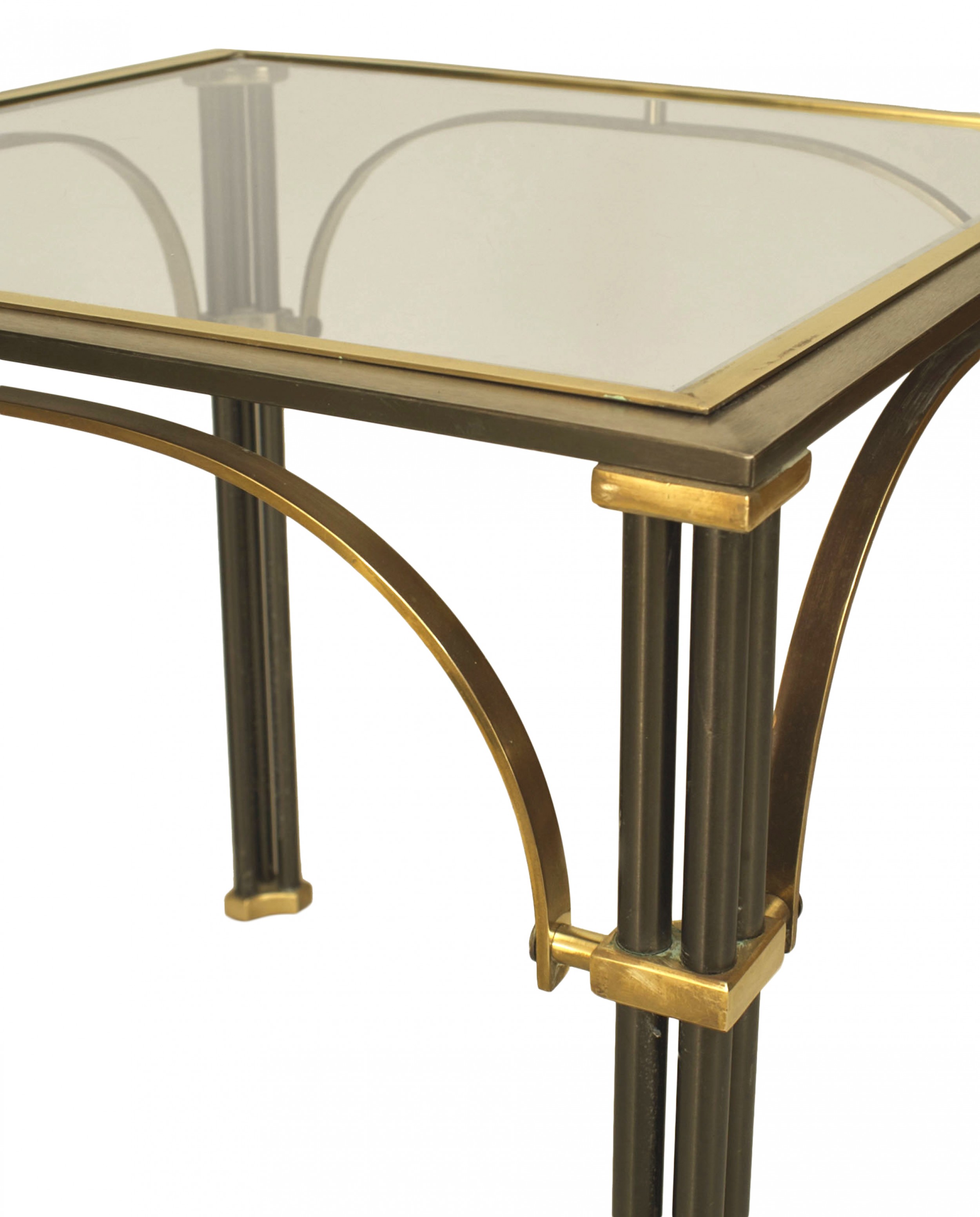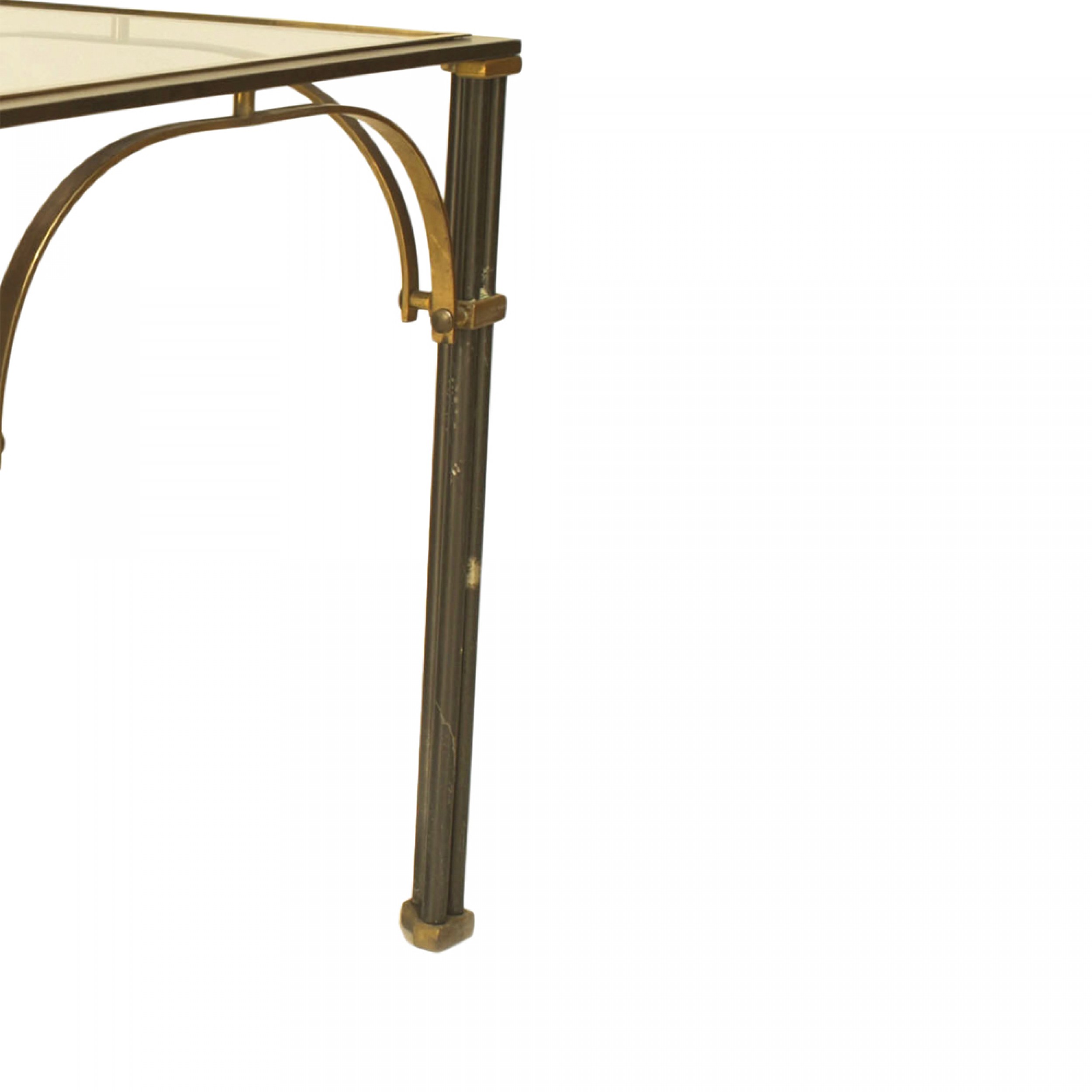 French Mid-Century (1950s) steel low square end table with a cluster leg design and brass trim supporting a glass top. (Attributed to MAISON JANSEN).