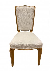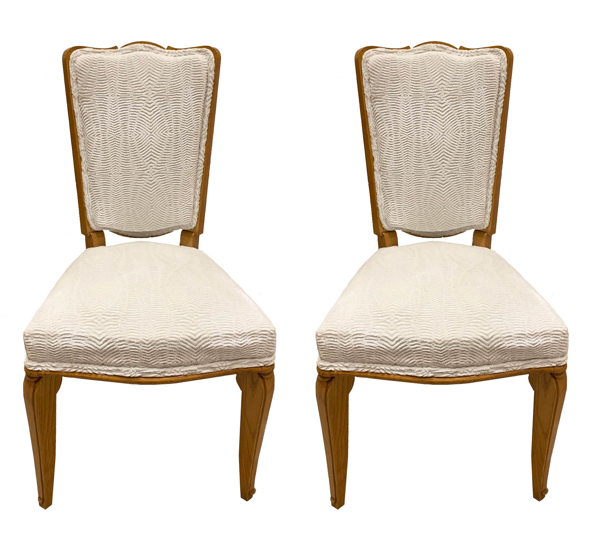 SET of 8 French Mid-Century (1938) sycamore side chairs with a shaped upholstered back & seat with scroll form legs (by ANDRE ARBUS) (ref: ARBUS, by Brunhammer, pg 155).