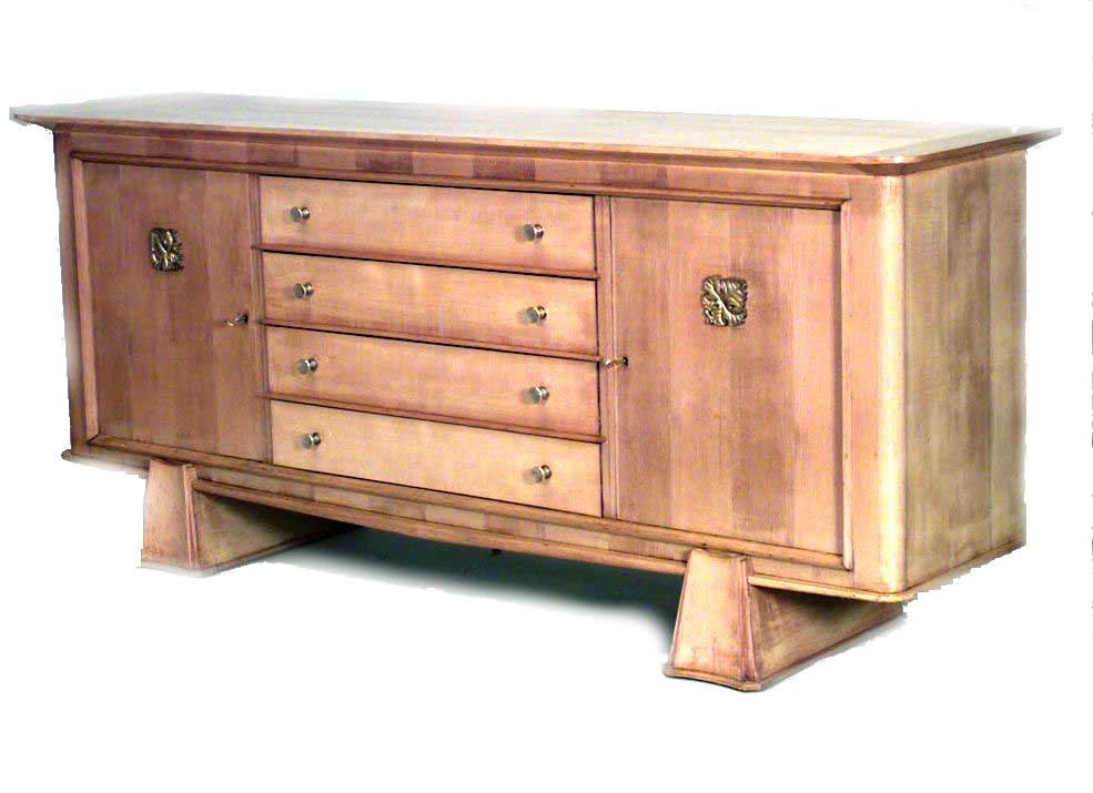 French Mid-Century (1940s) ormolu mounted sycamore sideboard cabinet with a rectangular top above 2 doors flanking 4 drawers on 2 shaped pedestal bases (Attributed to MAXIME OLD)..