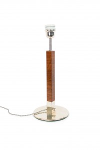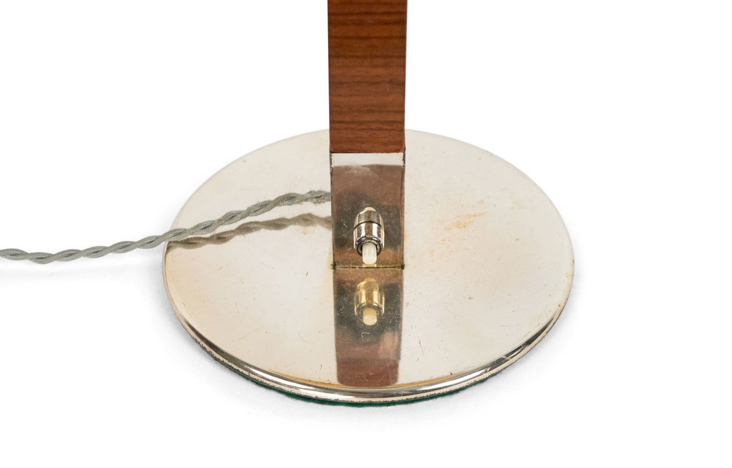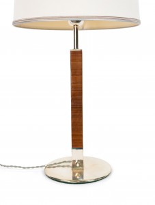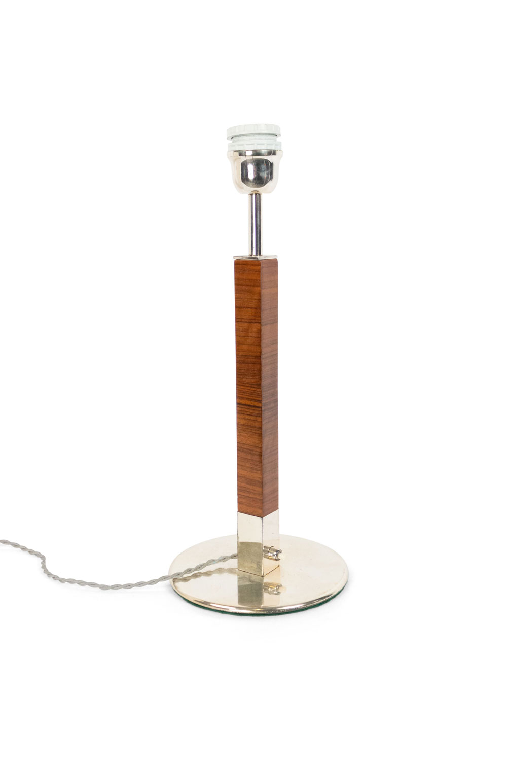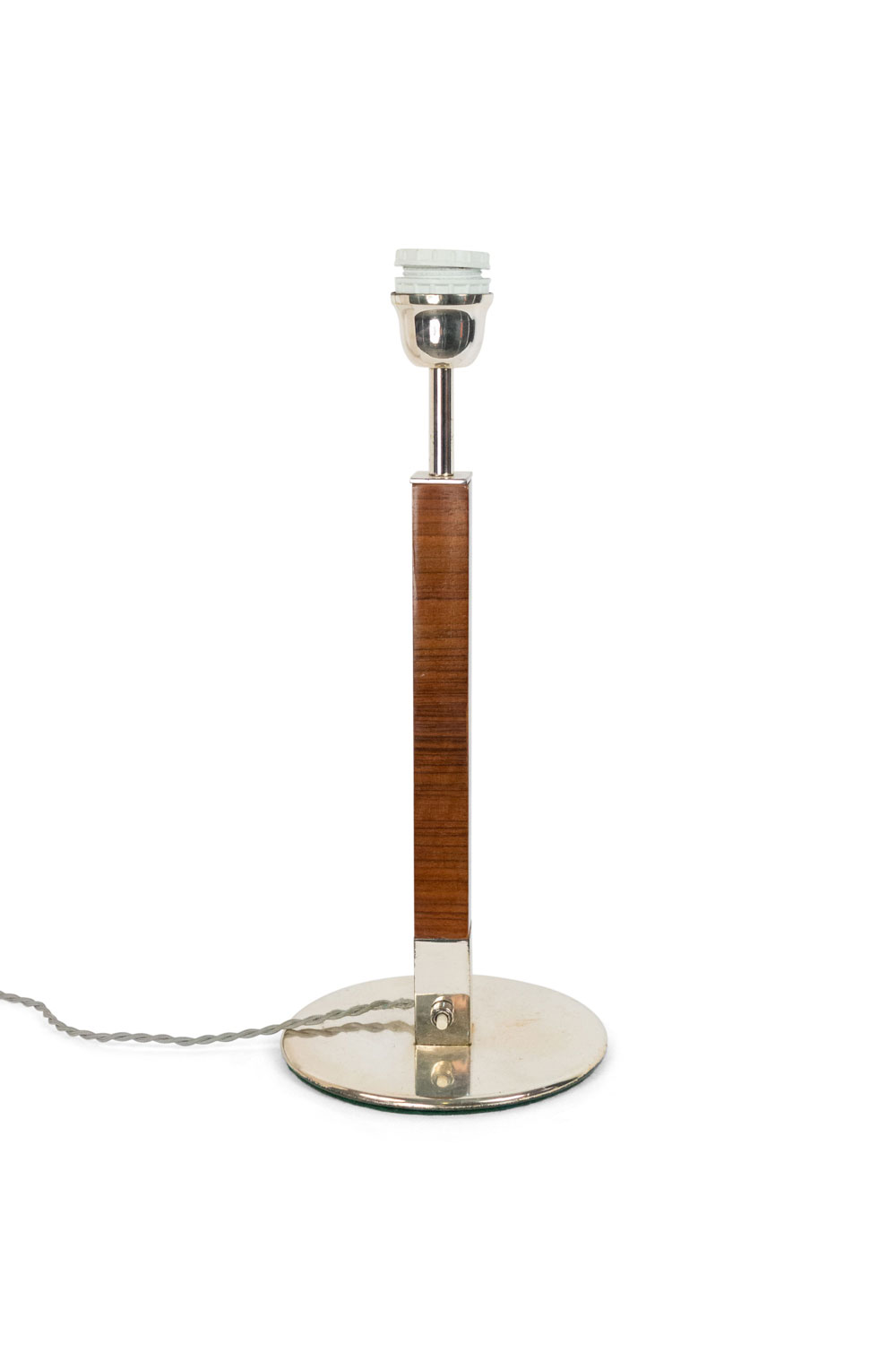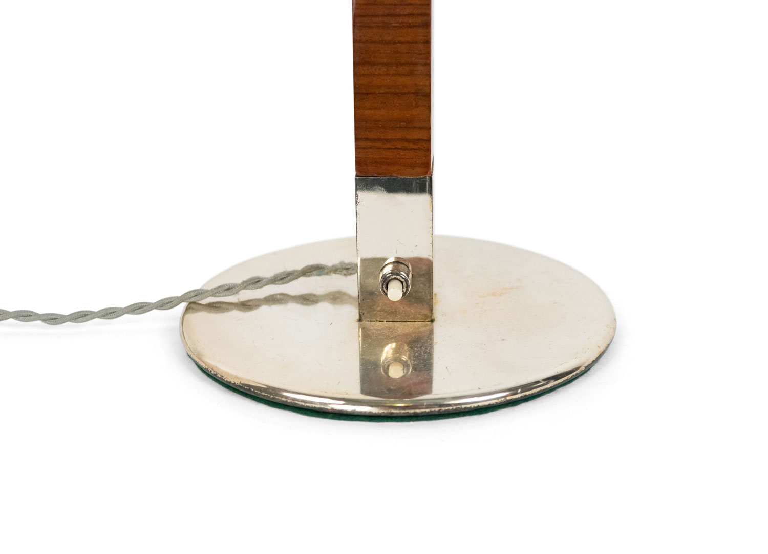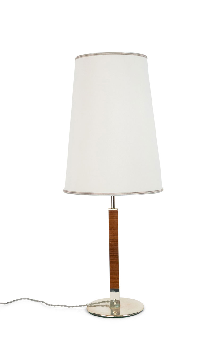 French 1940s light walnut square column table lamp mounted on a round chrome base with conical white shade.