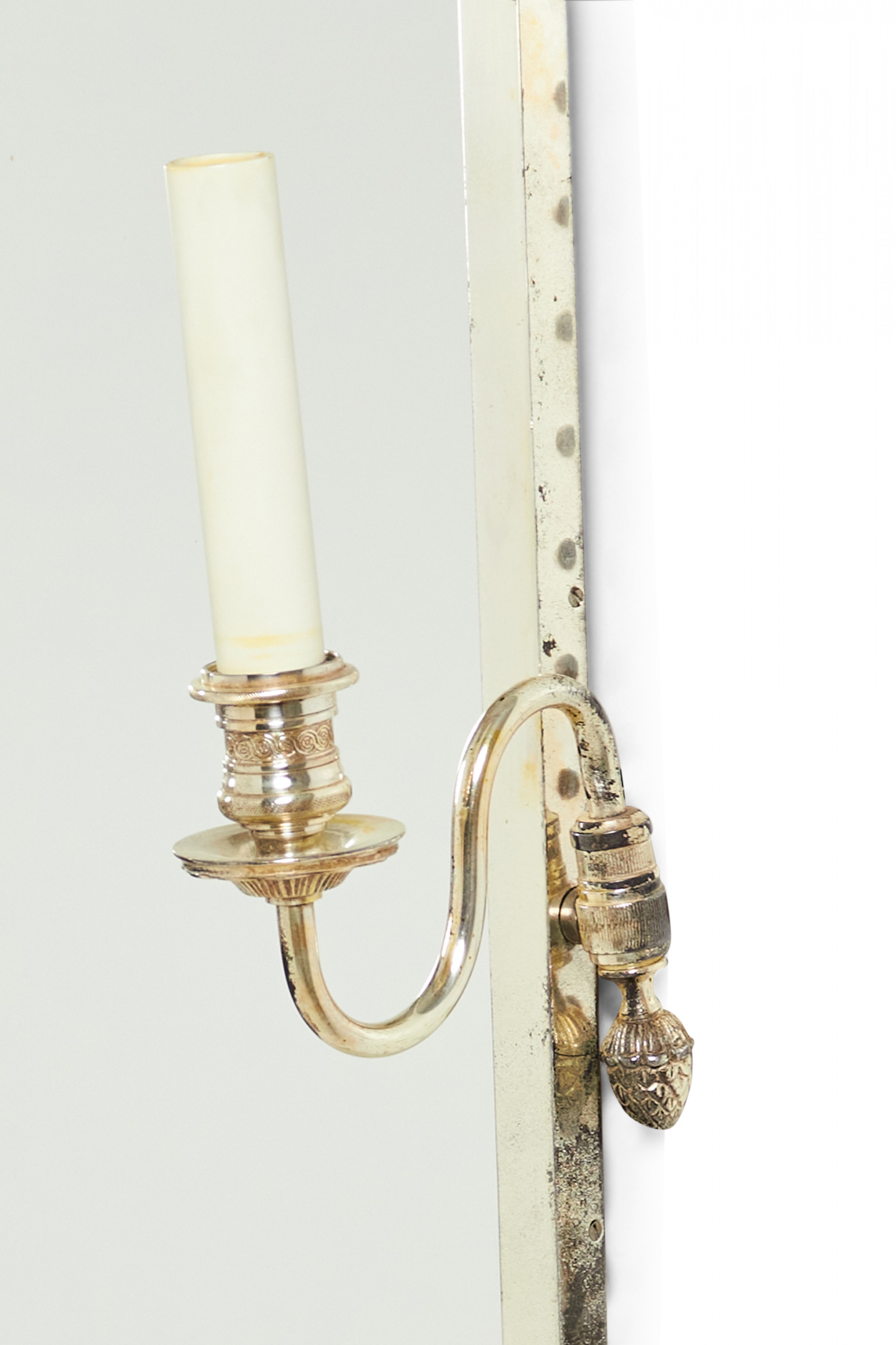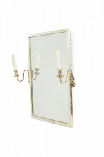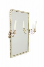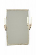 Style: French Materials & Techniques: Glass, plastic, silver, silver Category: Mirrors Condition: Tarnishing to frame, one sconce arm is loose.