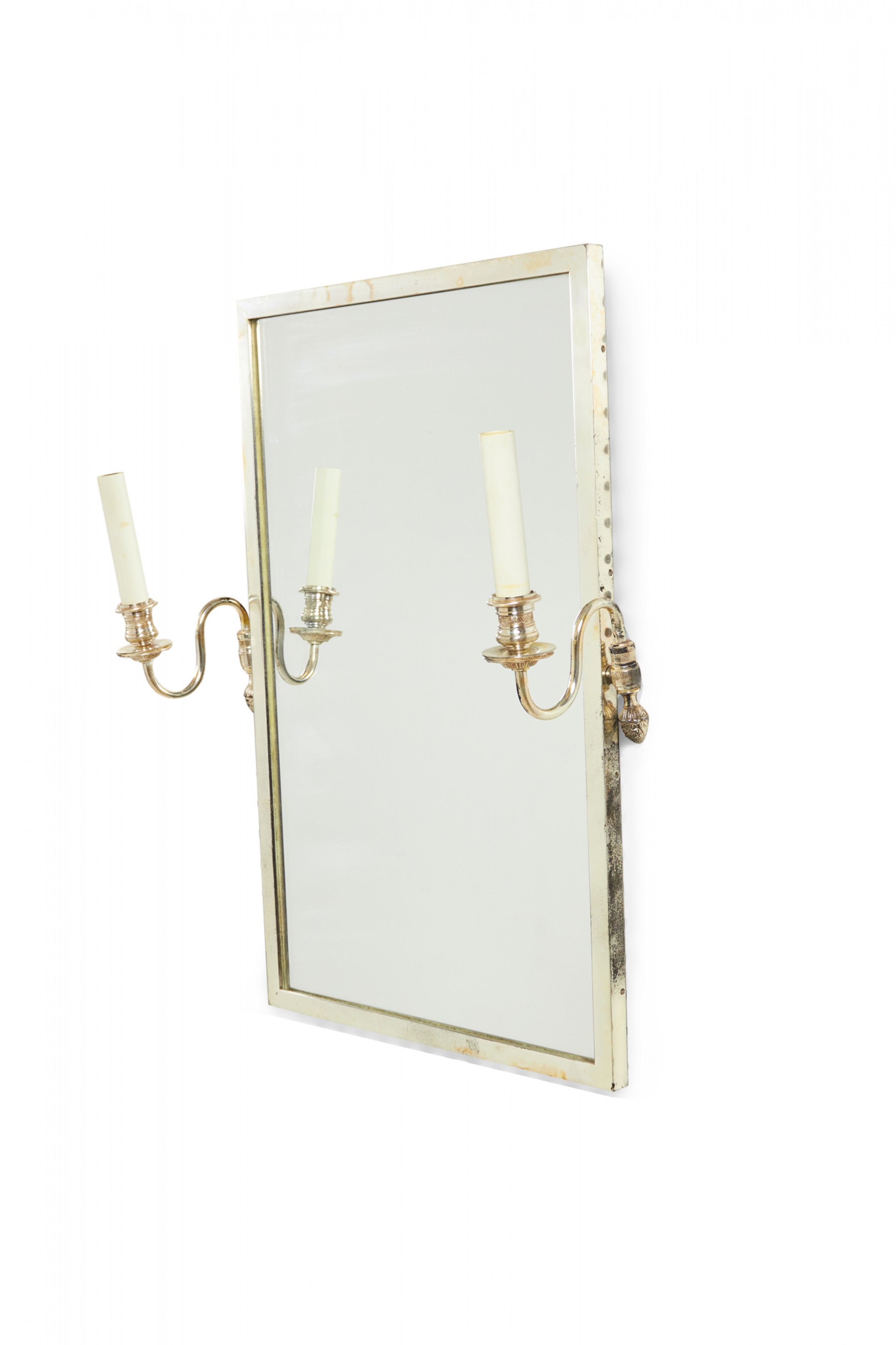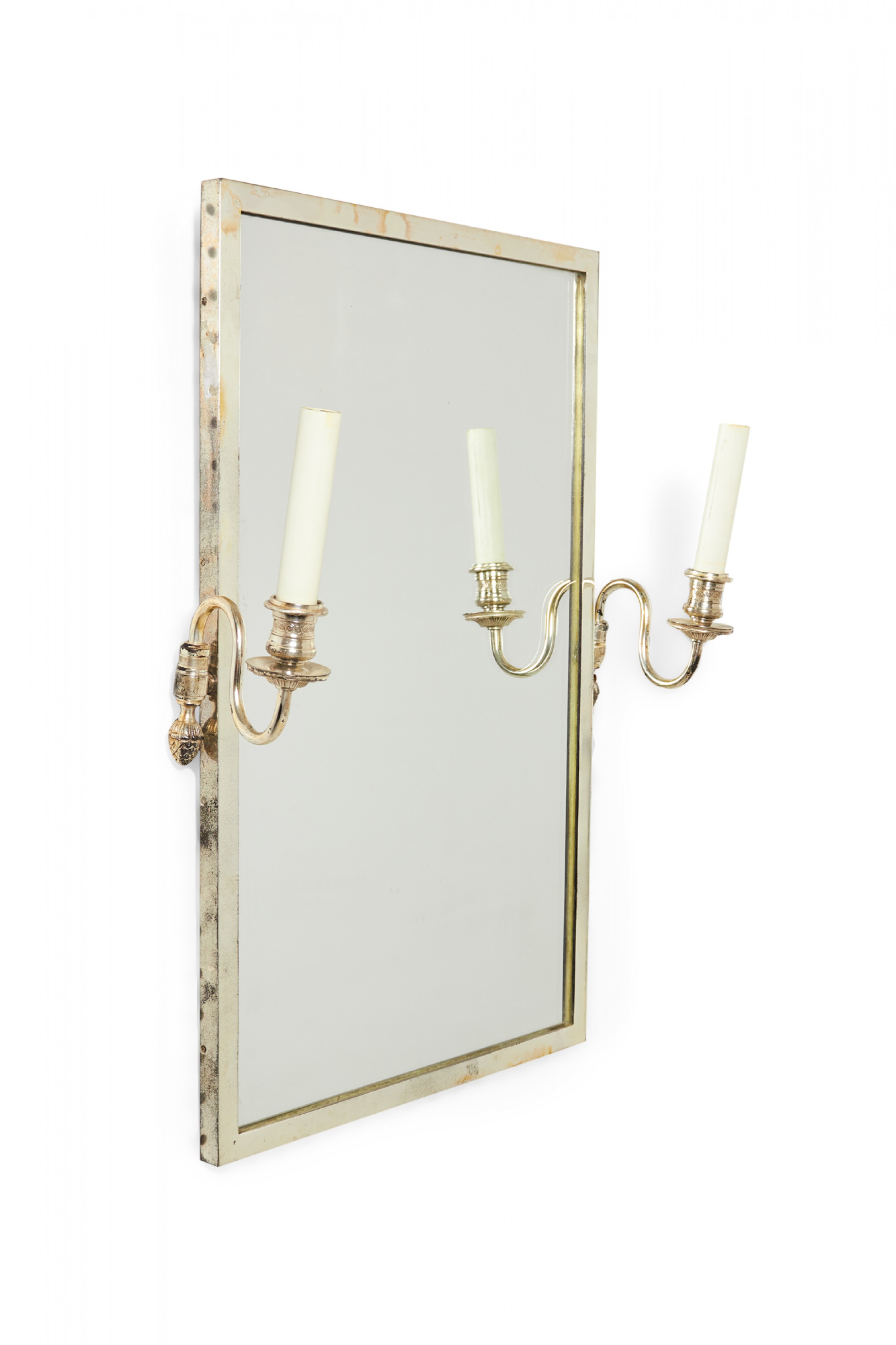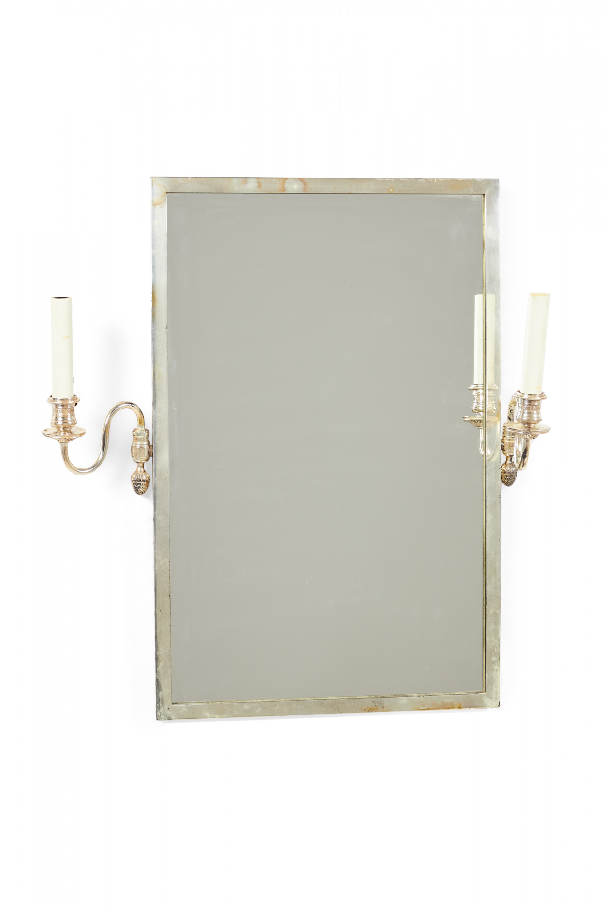 French Regence-style silver framed rectangular wall mirror with two electrified silver sconce arms with off-white plastic candle sleeves on either side.