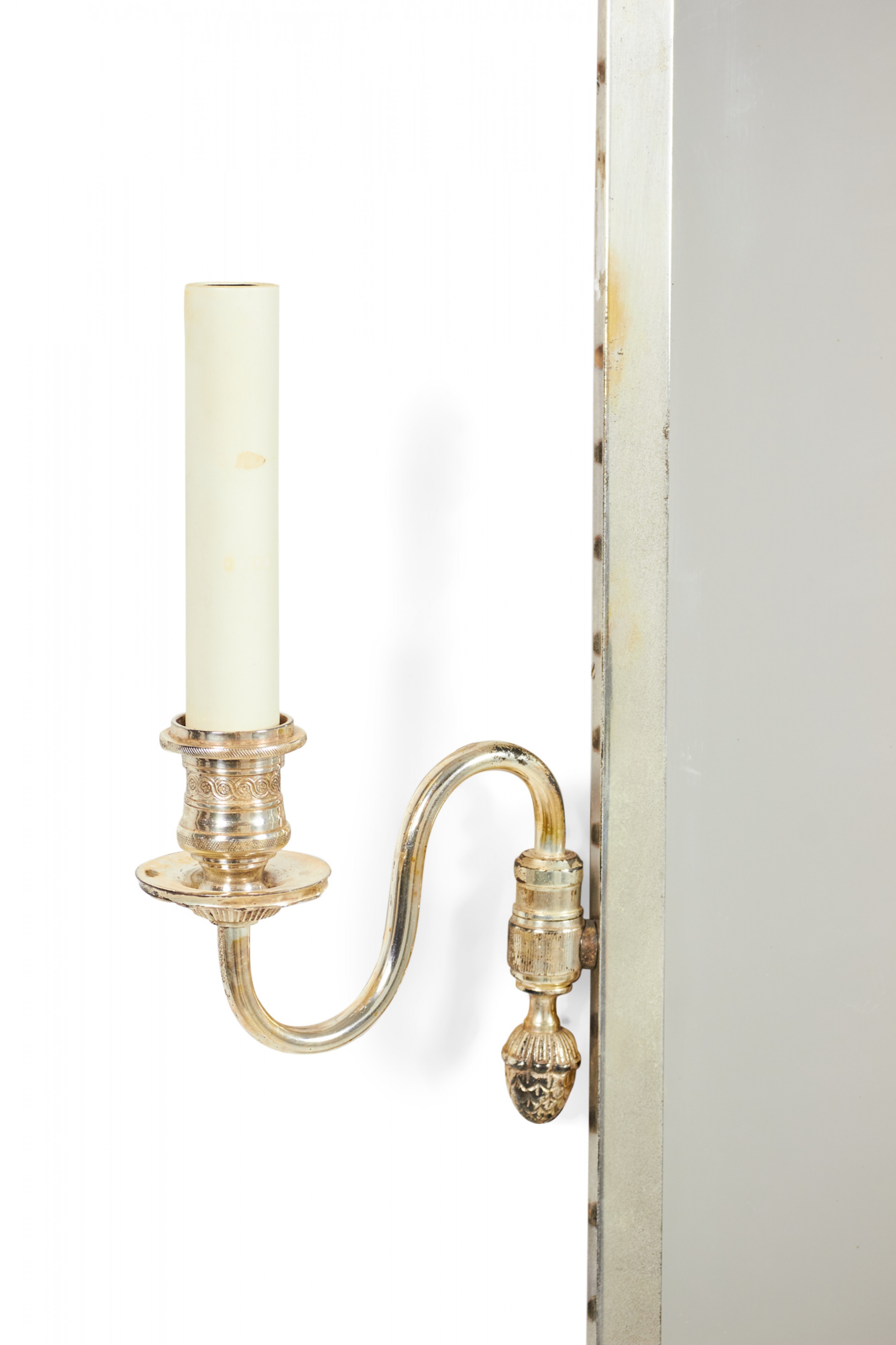 French Regence-style silver framed rectangular wall mirror with two electrified silver sconce arms with off-white plastic candle sleeves on either side..