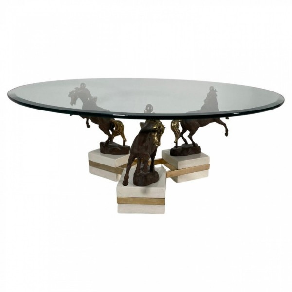 French Modern bronze, patinated bronze and glass low table with three dynamic sculptural horses mount having a round glass top (MAISON CHARLES)
