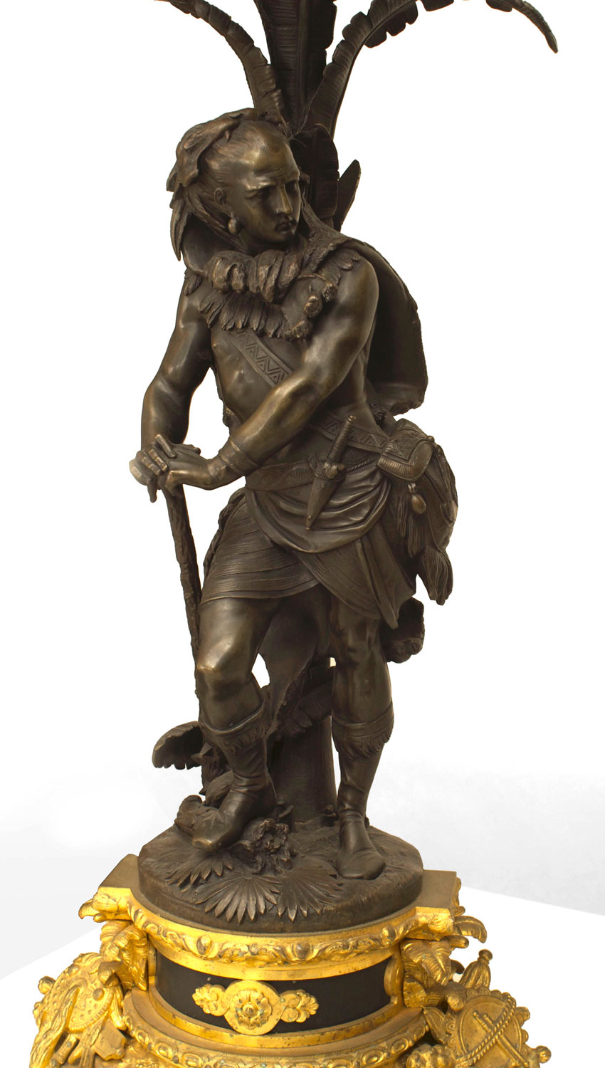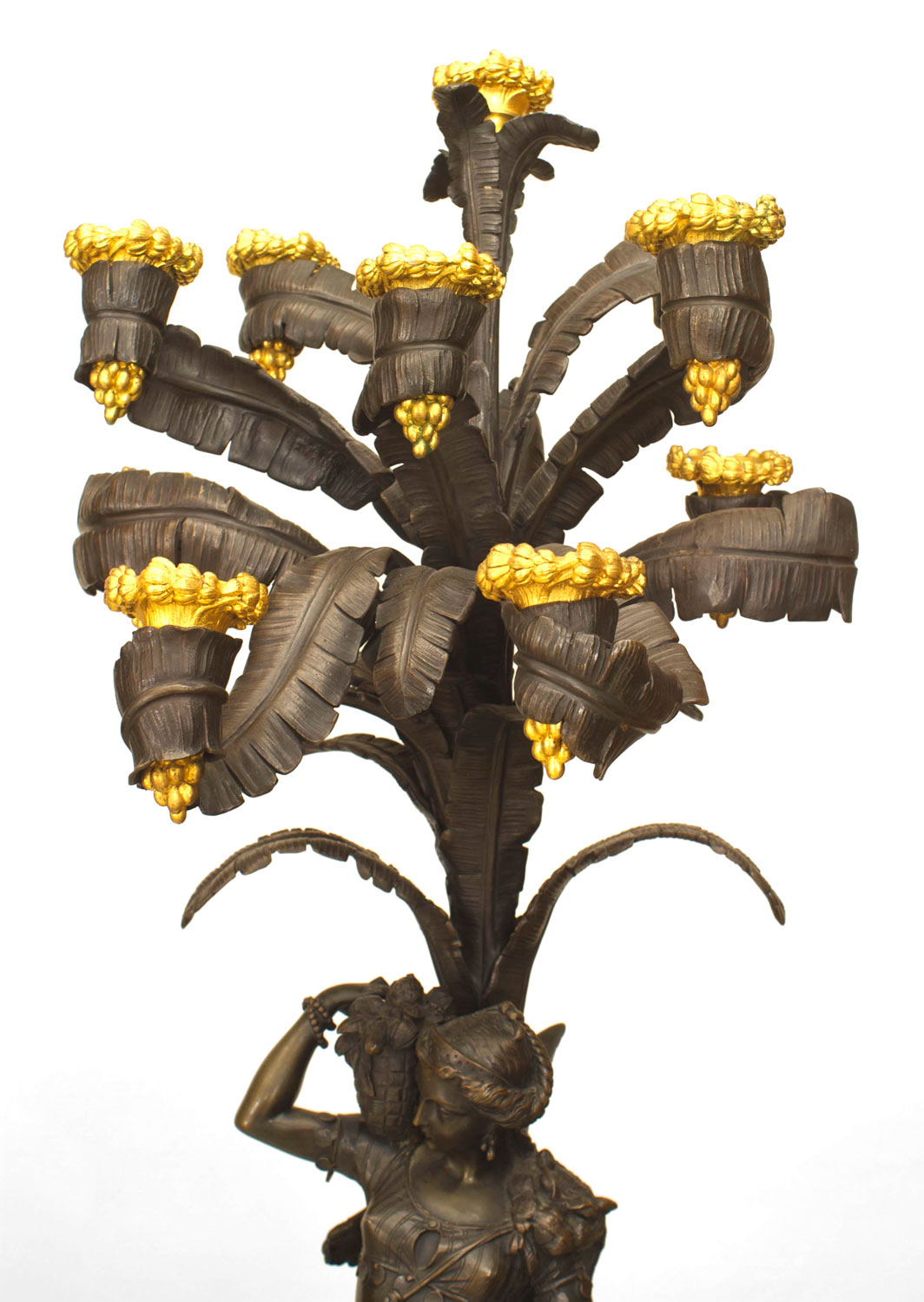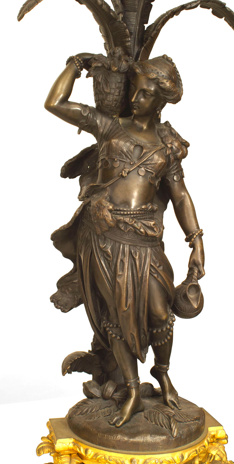 PAIR of French Napoleon III gilt and patinated bronze ten-light candelabras with a traditionally dressed man and woman under palm trees mounted on bases. (PRICED AS PAIR)