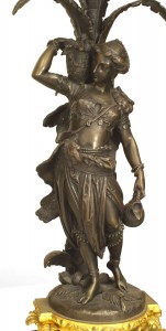 PAIR of French Napoleon III gilt and patinated bronze ten-light candelabras with a traditionally dressed man and woman under palm trees mounted on bases. (PRICED AS PAIR).