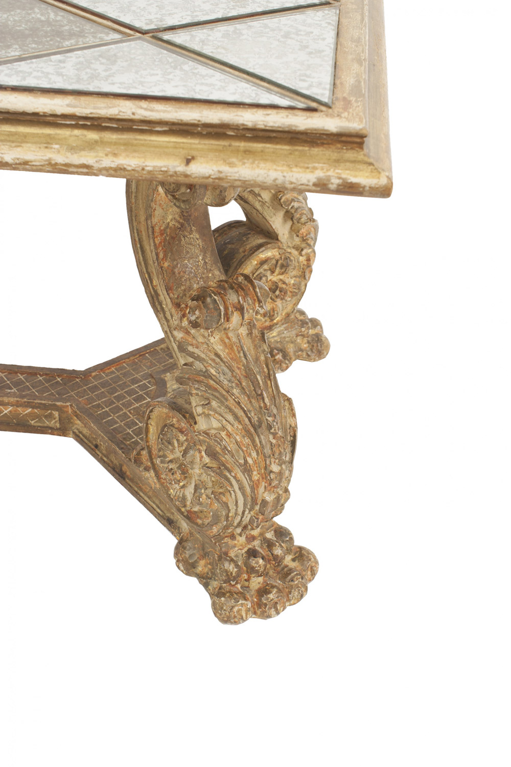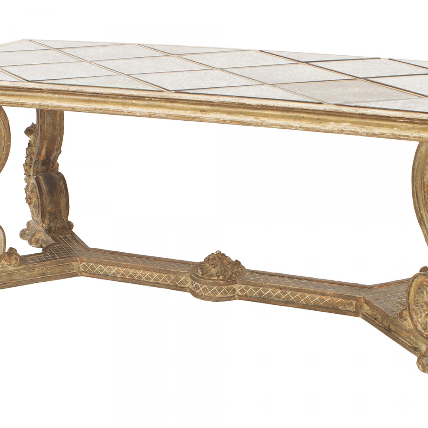 French Mid-Century (1940s) rectangular gilt oak coffee table with scroll carved legs connected with a stretcher and an inset distressed mirror diamond design top..