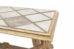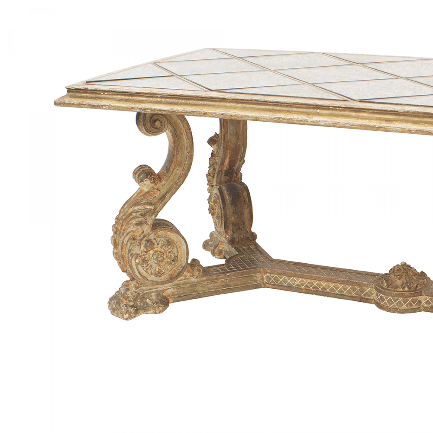 French Mid-Century (1940s) rectangular gilt oak coffee table with scroll carved legs connected with a stretcher and an inset distressed mirror diamond design top.
