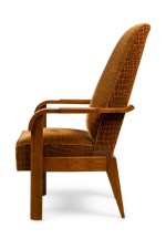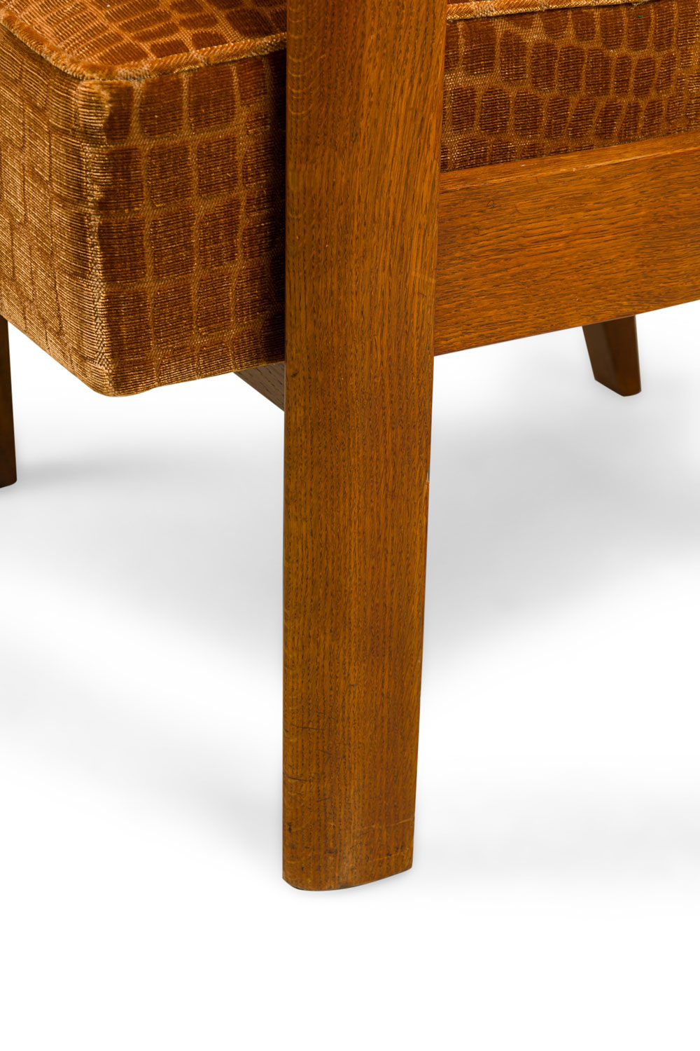 French 1940s oak arm chair with a high back and upholstered with a red leather seat and back. (C. DUDOUYT) (Matching desk: 060336) (NOTE: now re-upholstered in darker red).