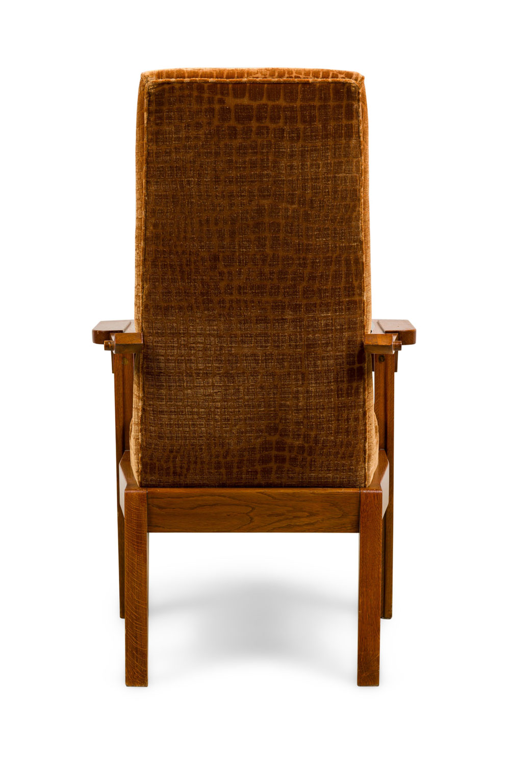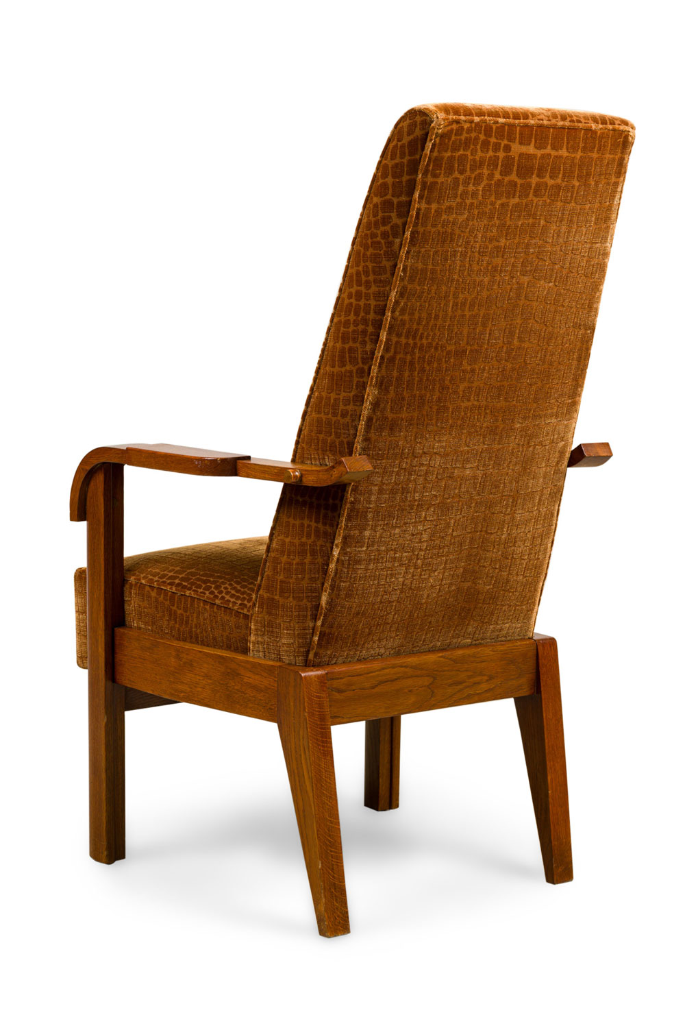 French 1940s oak arm chair with a high back and upholstered with a red leather seat and back. (C. DUDOUYT) (Matching desk: 060336) (NOTE: now re-upholstered in darker red)