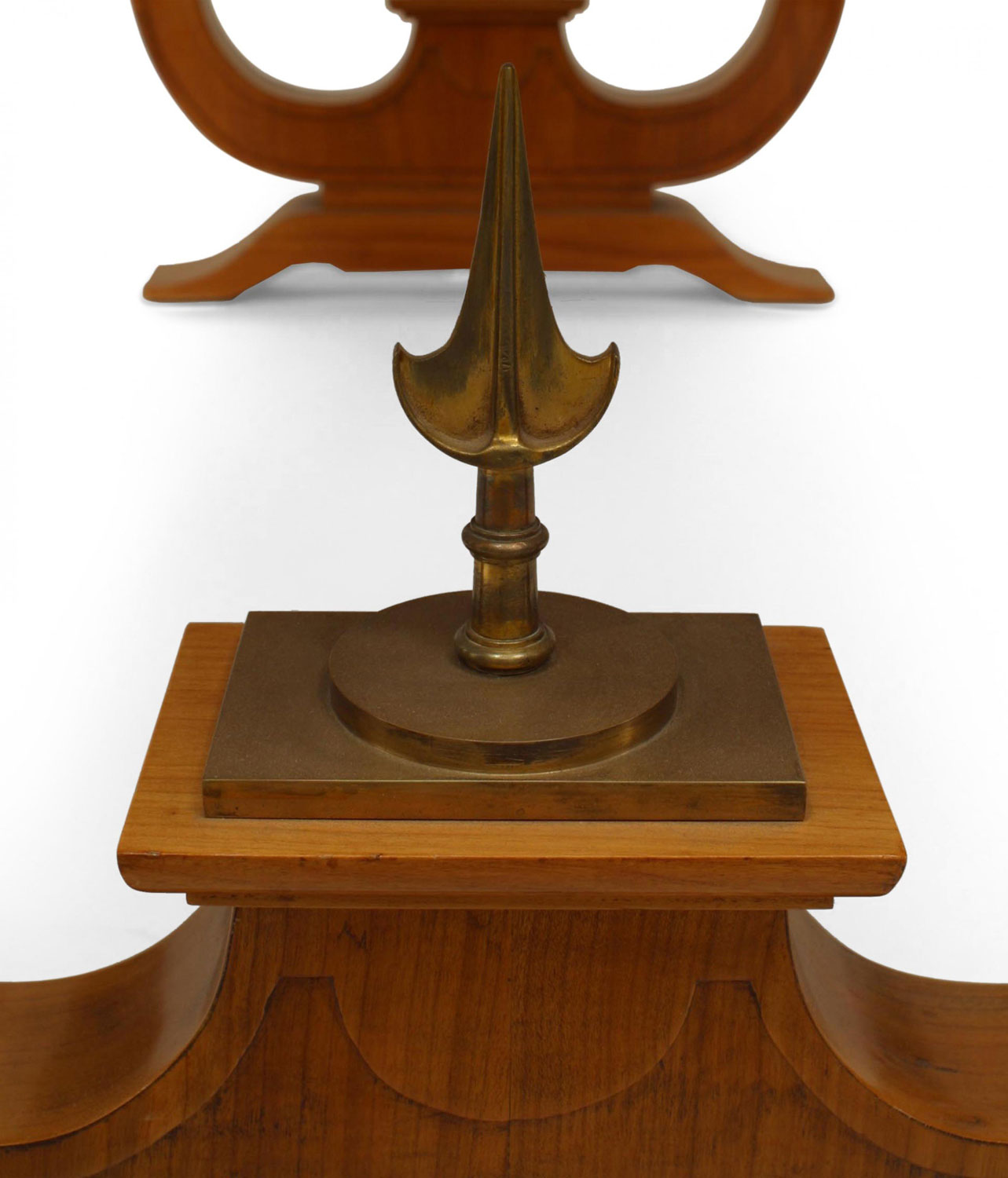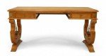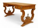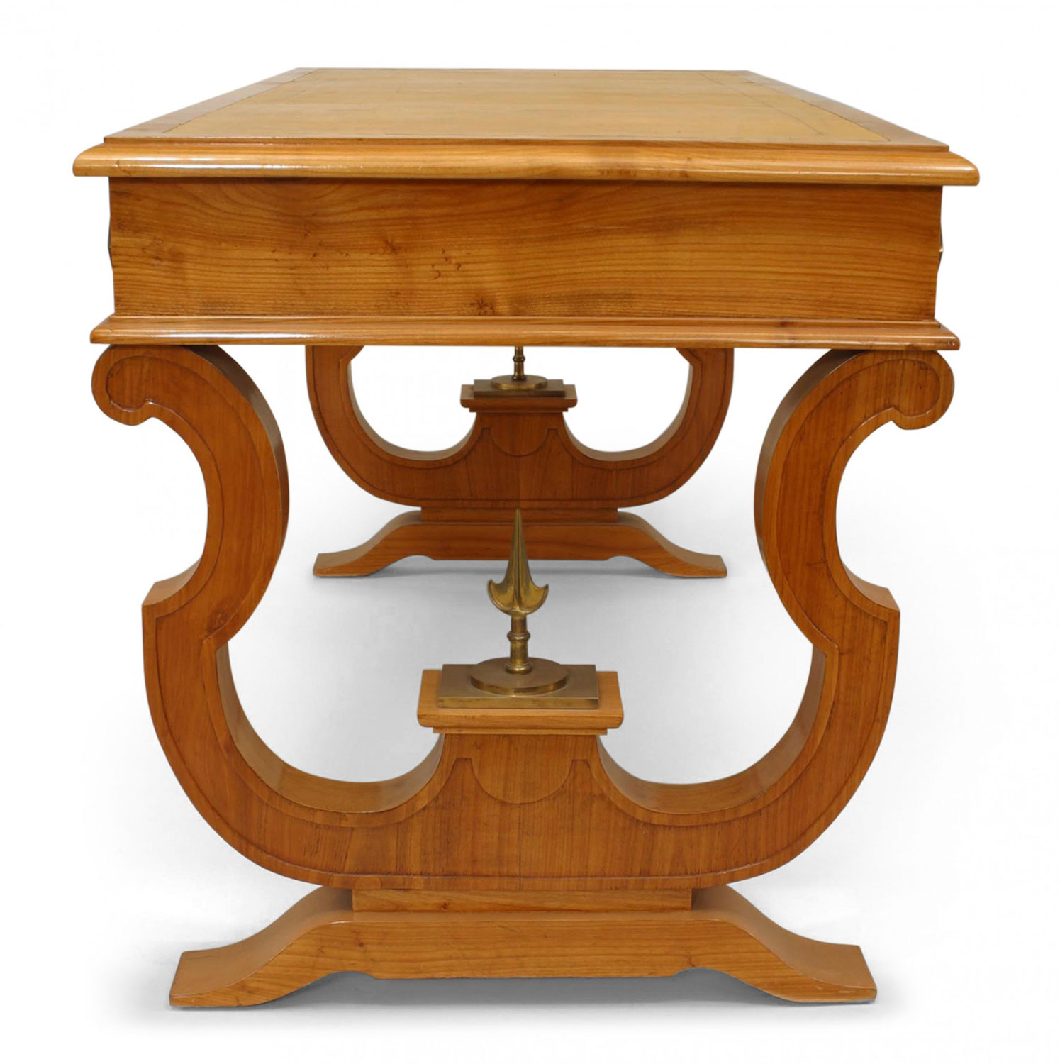 French 1940s ormolu mounted maple writing desk with leather inset top above 2 frieze drawers on lyre form trestle supports. (attributed to ANDRE ARBUS).
