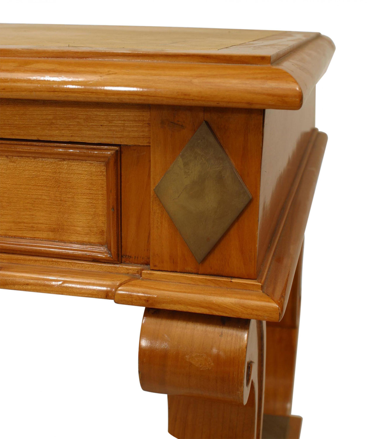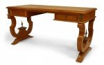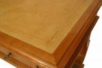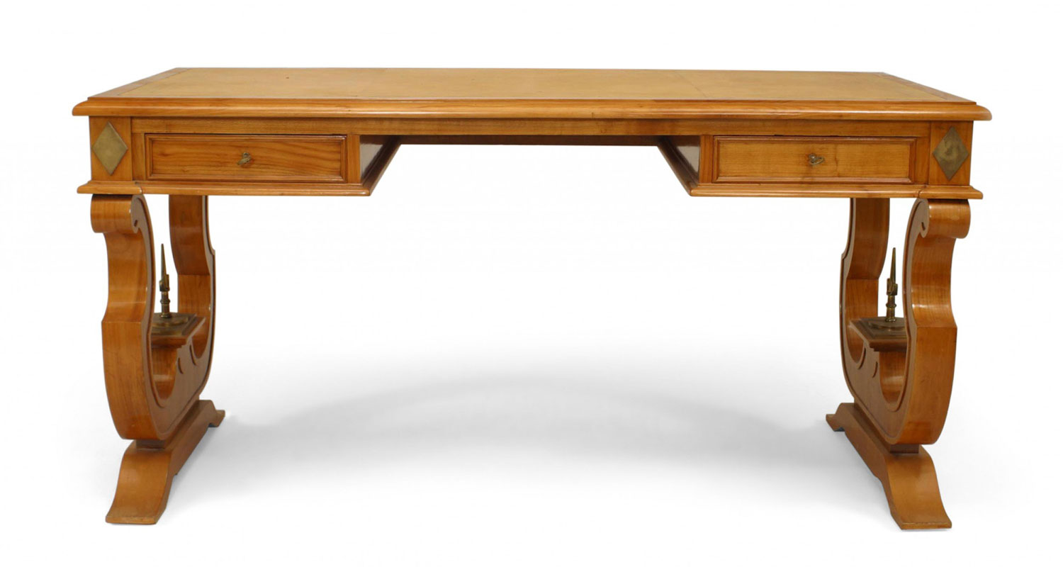French 1940s ormolu mounted maple writing desk with leather inset top above 2 frieze drawers on lyre form trestle supports. (attributed to ANDRE ARBUS)