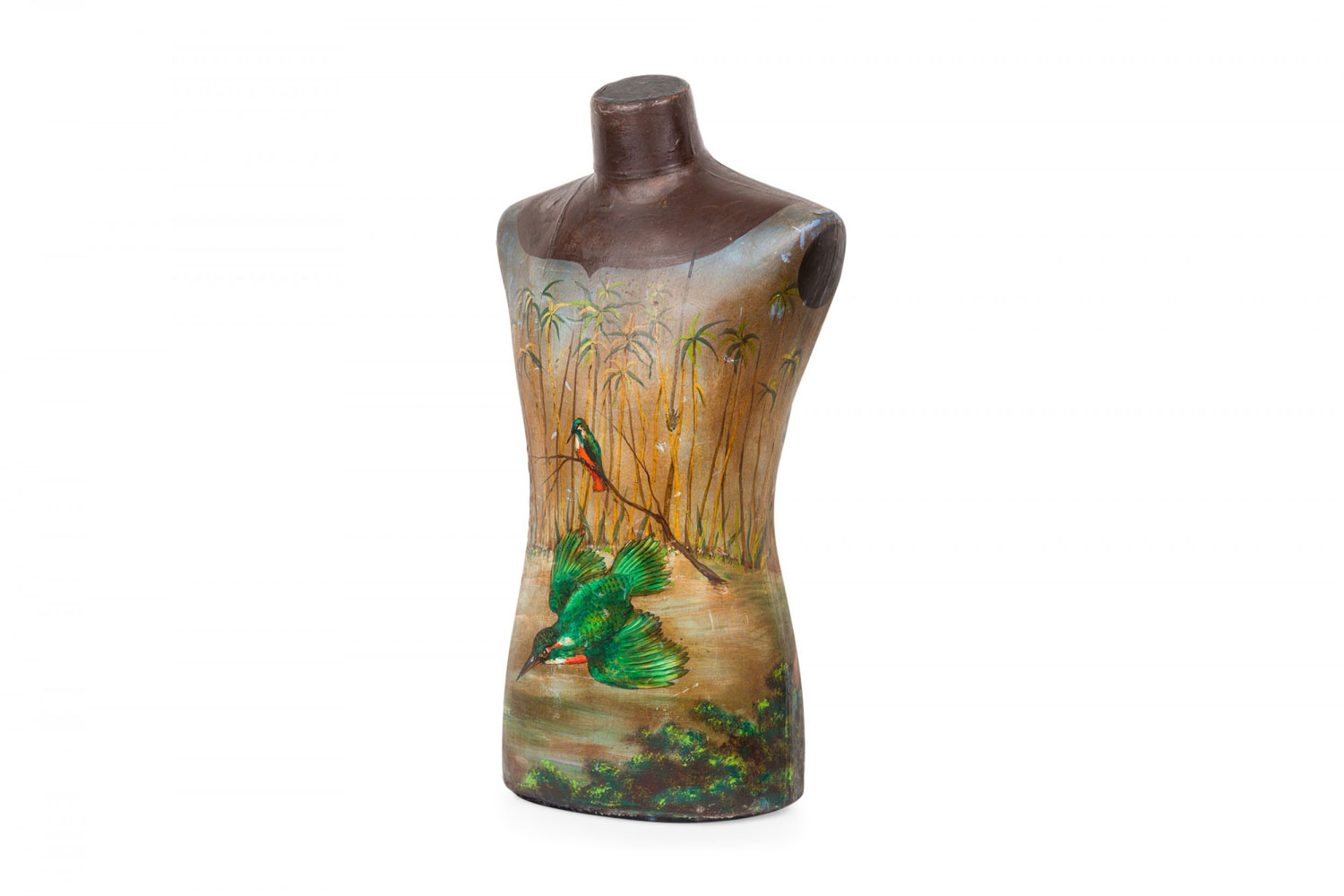 French painted mannequin figure with green kingfishers on front and heron on back. (20th Cent).