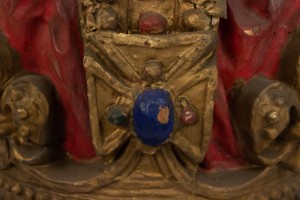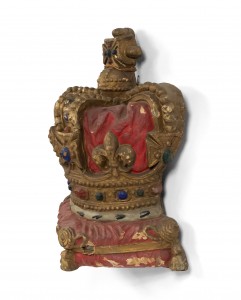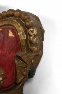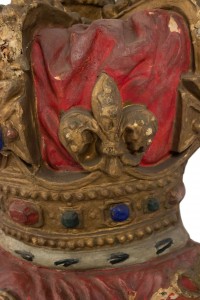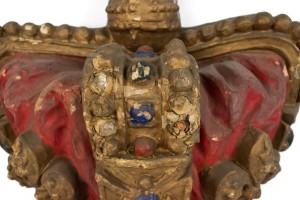 French (19th Century) red and gold painted and papier mache wall plaque with crown on pillow design and fleur de lis motif.
