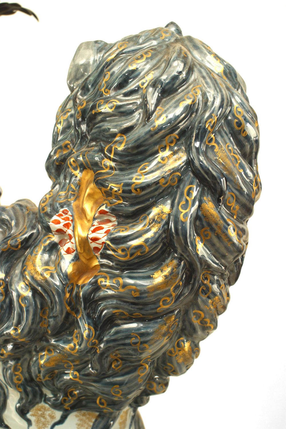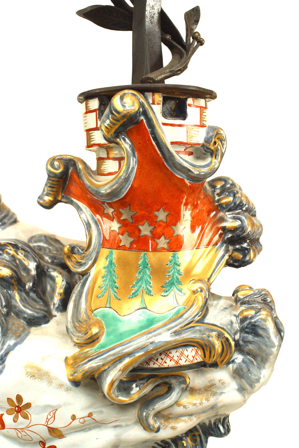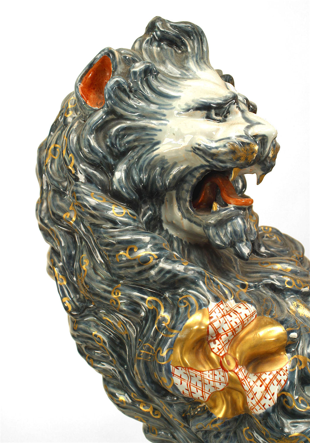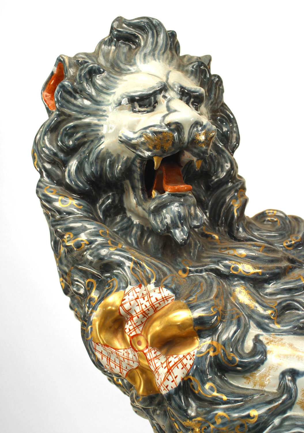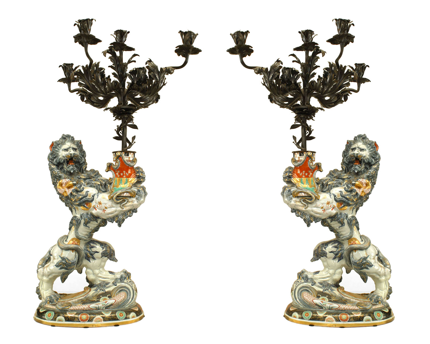 PAIR of French Victorian (19th Century) large porcelain lion figures holding wrought iron candelabras (signed by EMILE GALLE "Emile a Nancy"/Prov: Estate of Evalyn Walsh McLean) (PRICED AS PAIR).