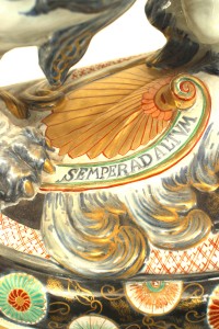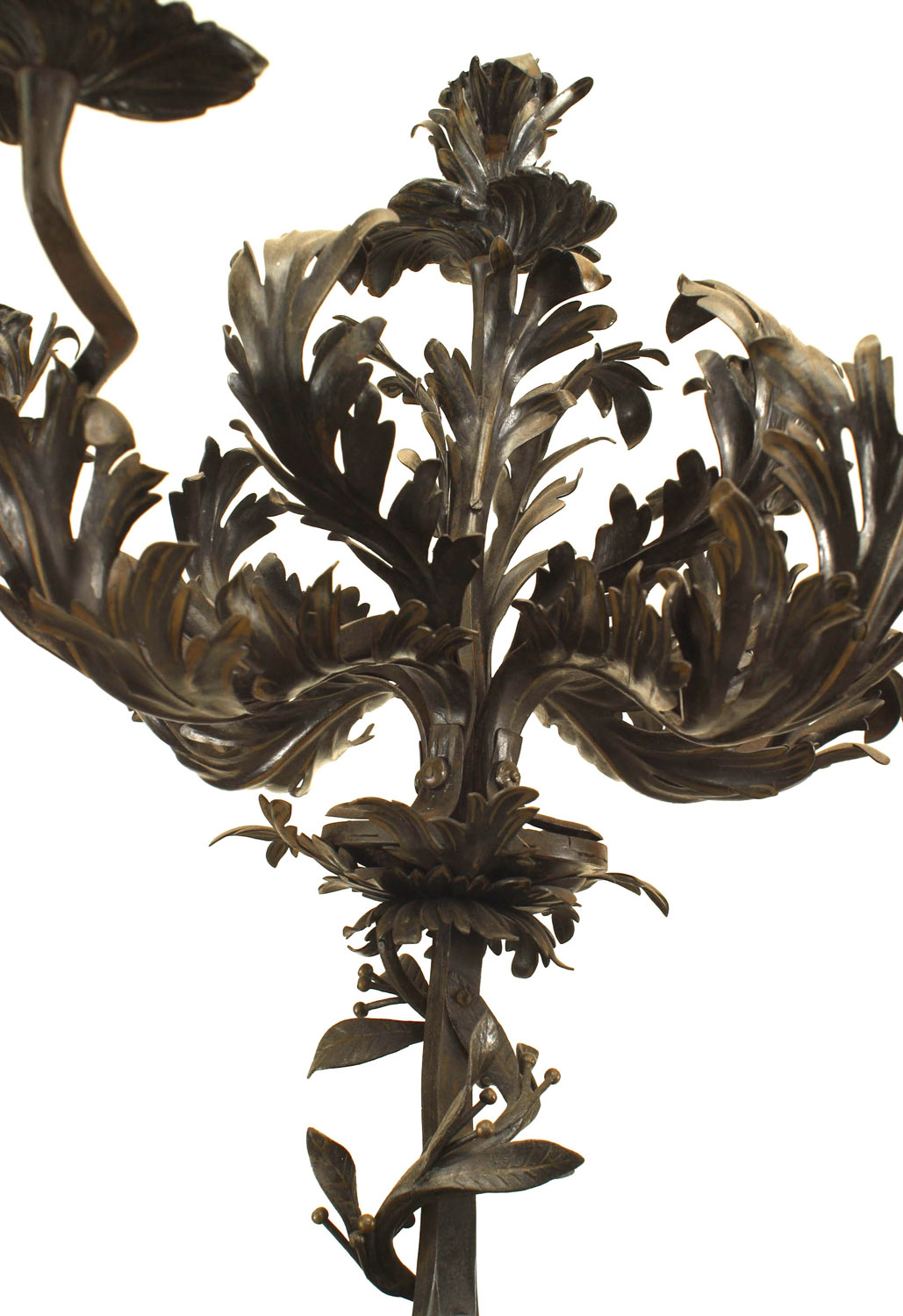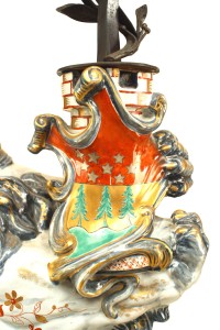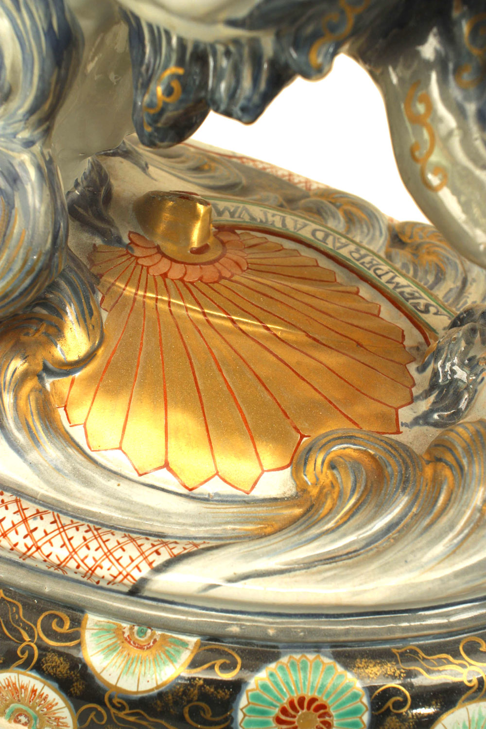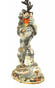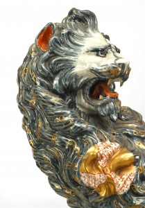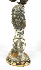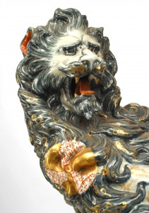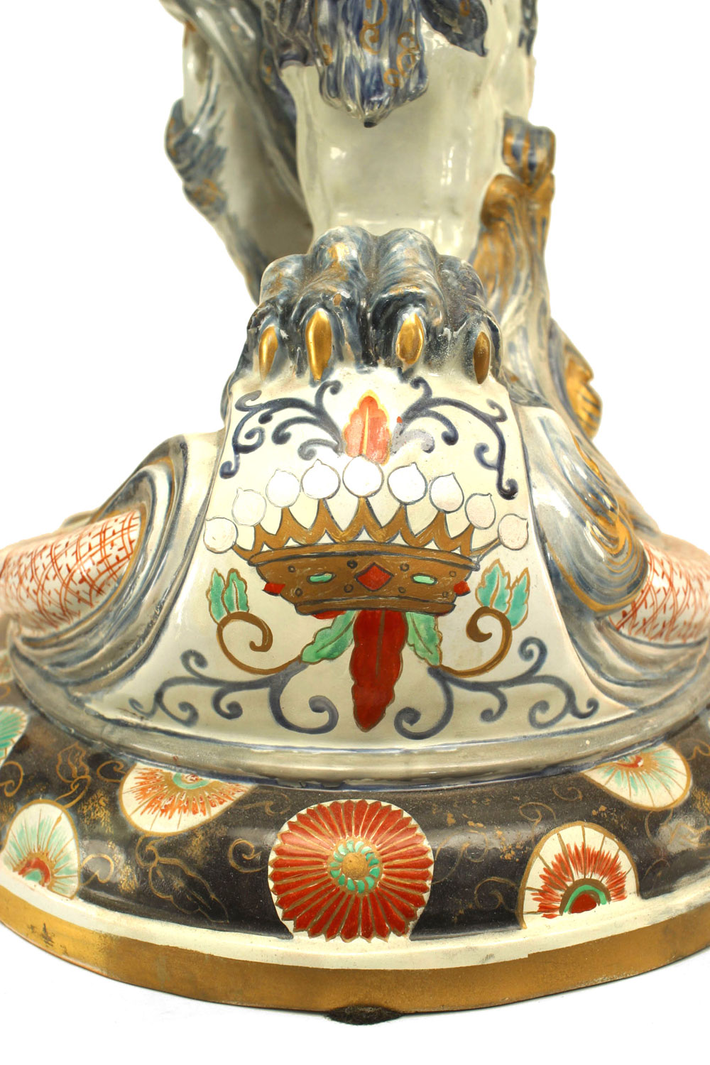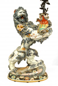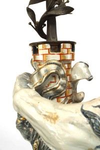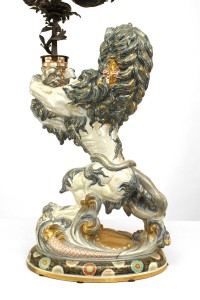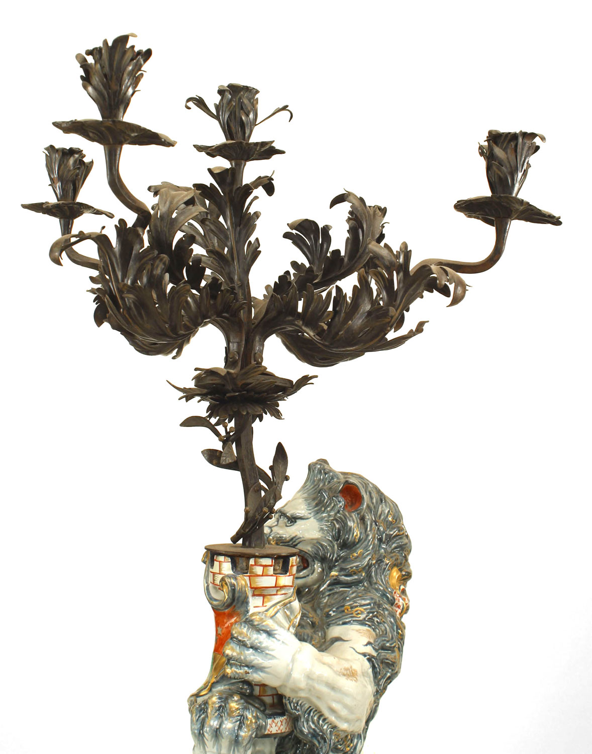 PAIR of French Victorian (19th Century) large porcelain lion figures holding wrought iron candelabras (signed by EMILE GALLE "Emile a Nancy"/Prov: Estate of Evalyn Walsh McLean) (PRICED AS PAIR)
