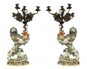 Pair of French Porcelain Lions Holding Wrought Iron Candelabras