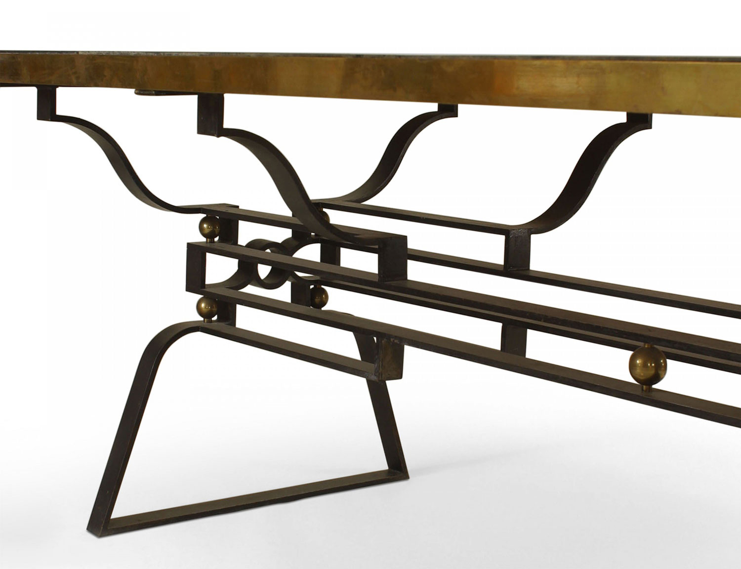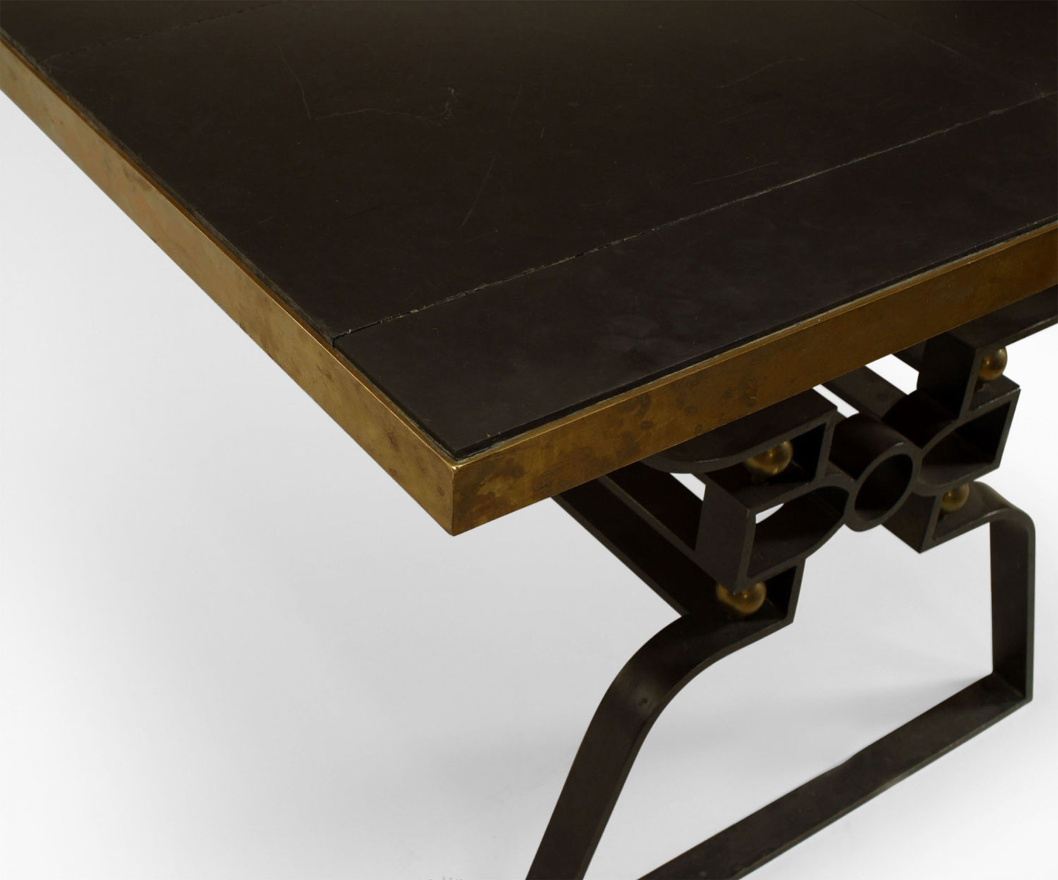 French Post-War Design (1950s) iron dining table with a geometric design stretcher and trimmed with bronze balls and top rim with sectioned inset black marble. (Attributed to GILBERT POILLERAT)