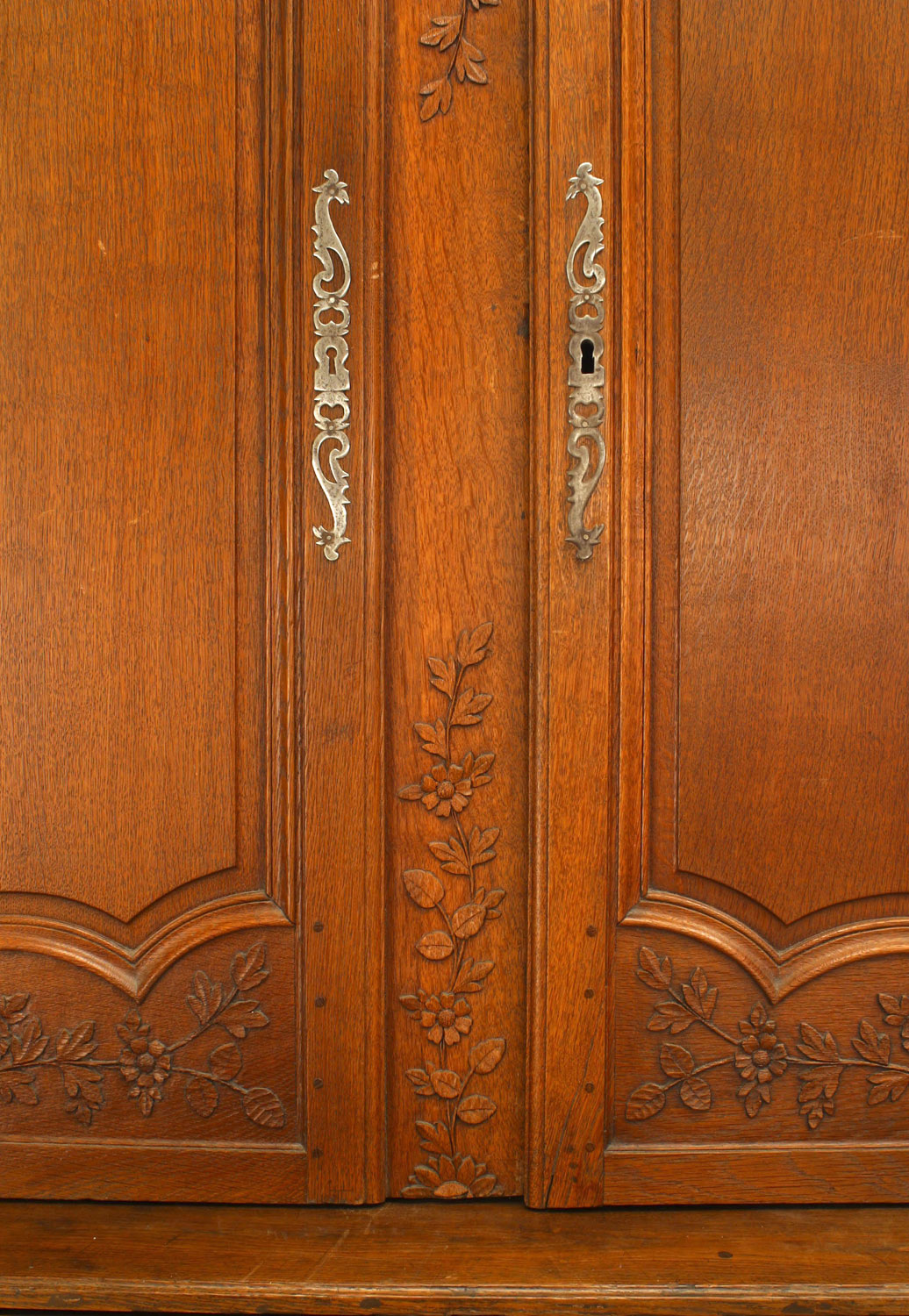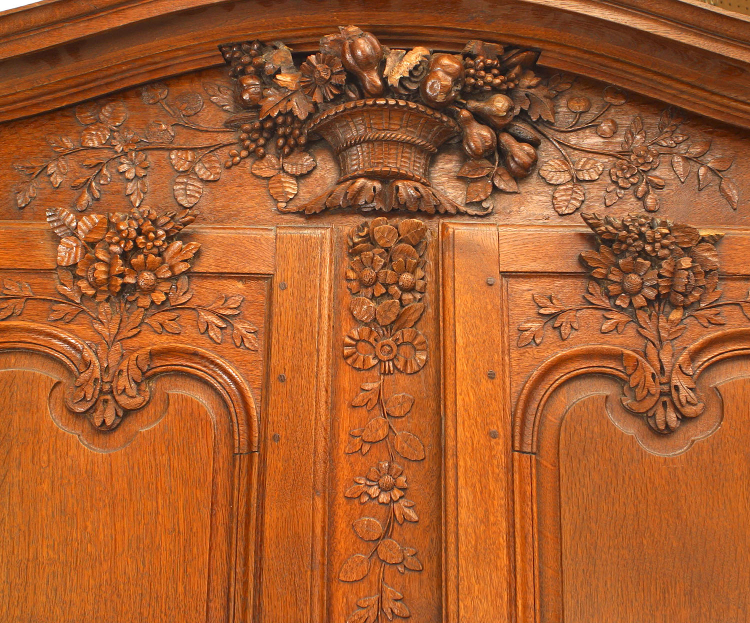 French Provincial (18th Century) oak cabinet with 2 top and 2 bottom doors trimmed with carved floral design and a center pediment carved with a basket and flowers.